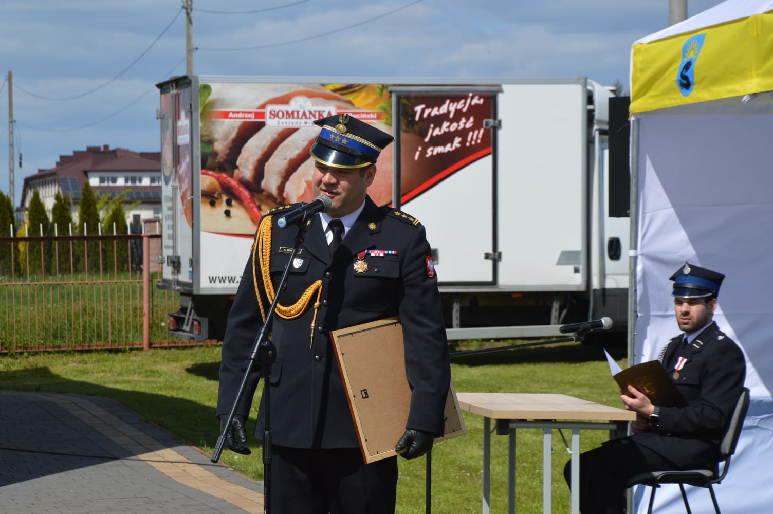 Zastępca Mazowieckiego Komendanta Wojewódzkiego PSP st. bryg. Artur Gonera w swoim przemówieniu także podziękował druhom, podkreślając ich zaangażowanie w codzienną, często niebezpieczną służbę na rzecz lokalnej społeczności i powiatu wyszkowskiego. Pogratulował jubileuszu 100-lecia powstania jednostki oraz wręczył Prezesowi OSP w Somiance pamiątkowy obraz przedstawiający Katedrę św. Michała Archanioła i św. Floriana w Warszawie nazywaną „Świątynią mazowieckich strażaków”.