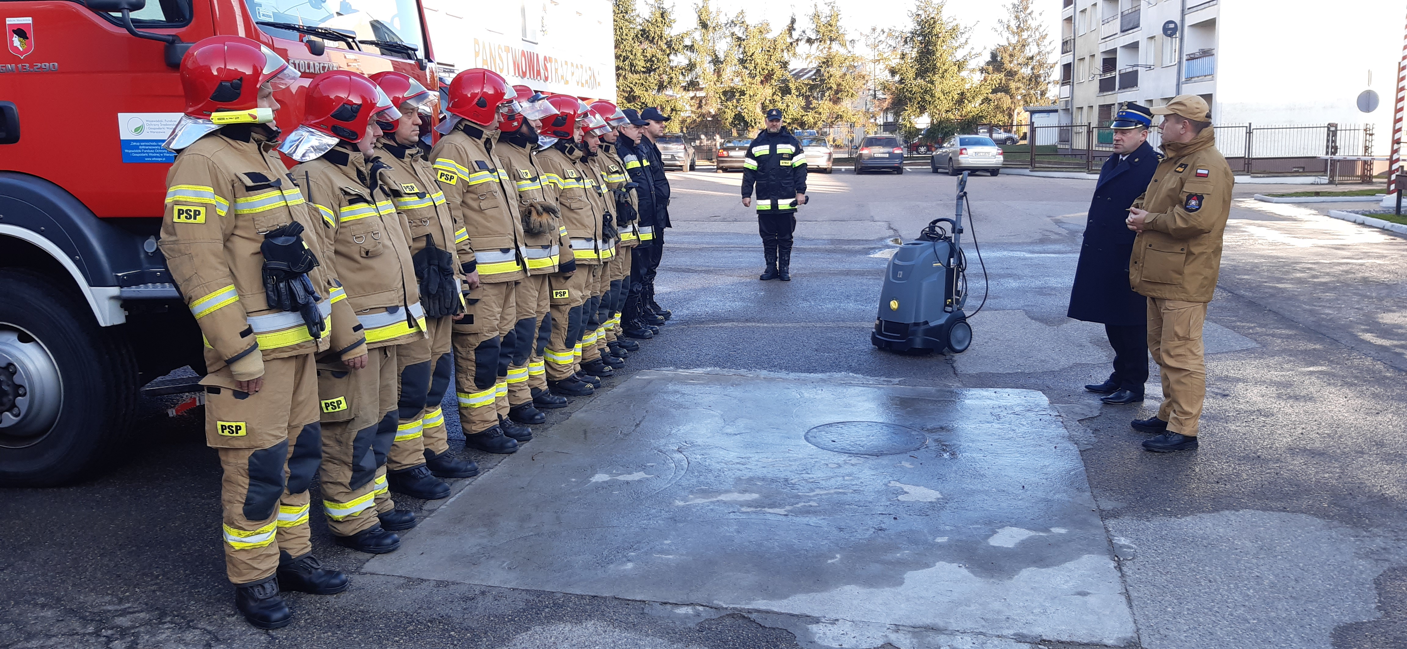 Podczas spotkania Mazowiecki Komendant Wojewódzki PSP przekazał strażakom myjkę wysokociśnieniową Karcher, która posłuży do zabezpieczenia i utrzymania reżimu sanitarnego używanego sprzętu oraz pojazdów, które biorą udział w działaniach związanych ze zwalczaniem koronawirusa.