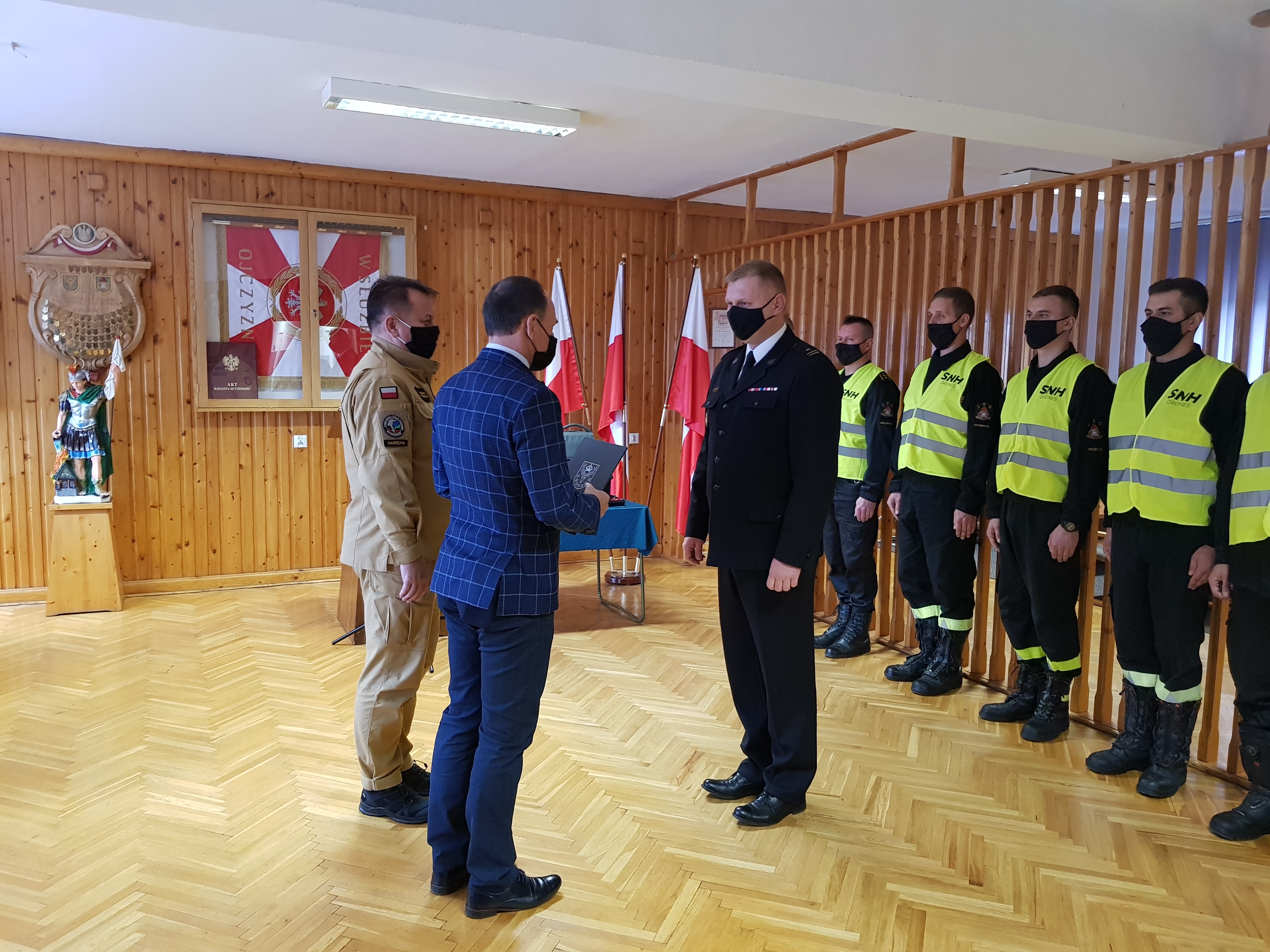 Podczas spotkania ze strażakami pełniącymi tego dnia służbę w Jednostce Ratowniczo-Gaśniczej PSP Komendant podziękował za profesjonalizm i zaangażowanie podczas prowadzonych działań ratowniczo-gaśniczych oraz za trud włożony w walkę związaną z pandemią koronawirusa.