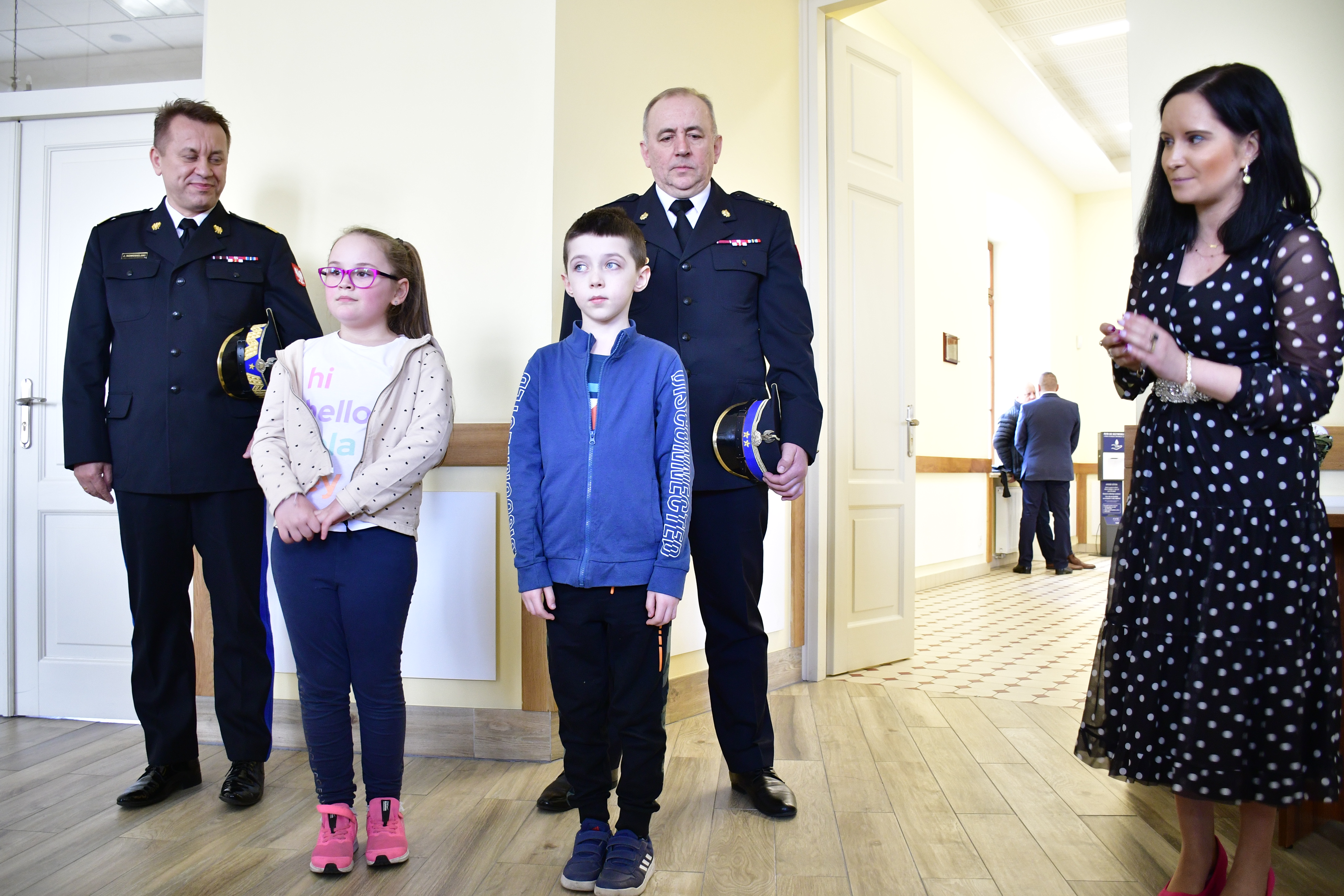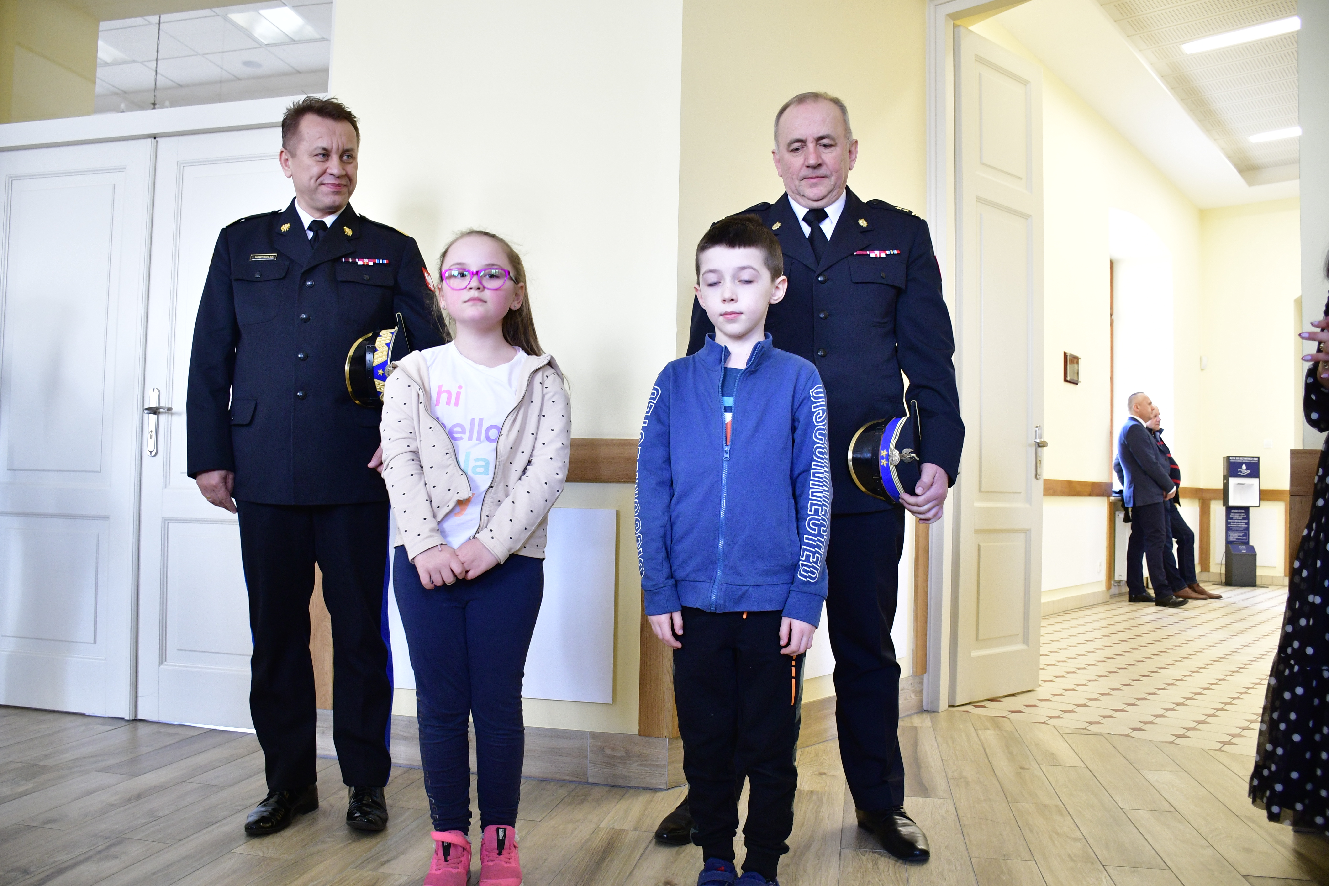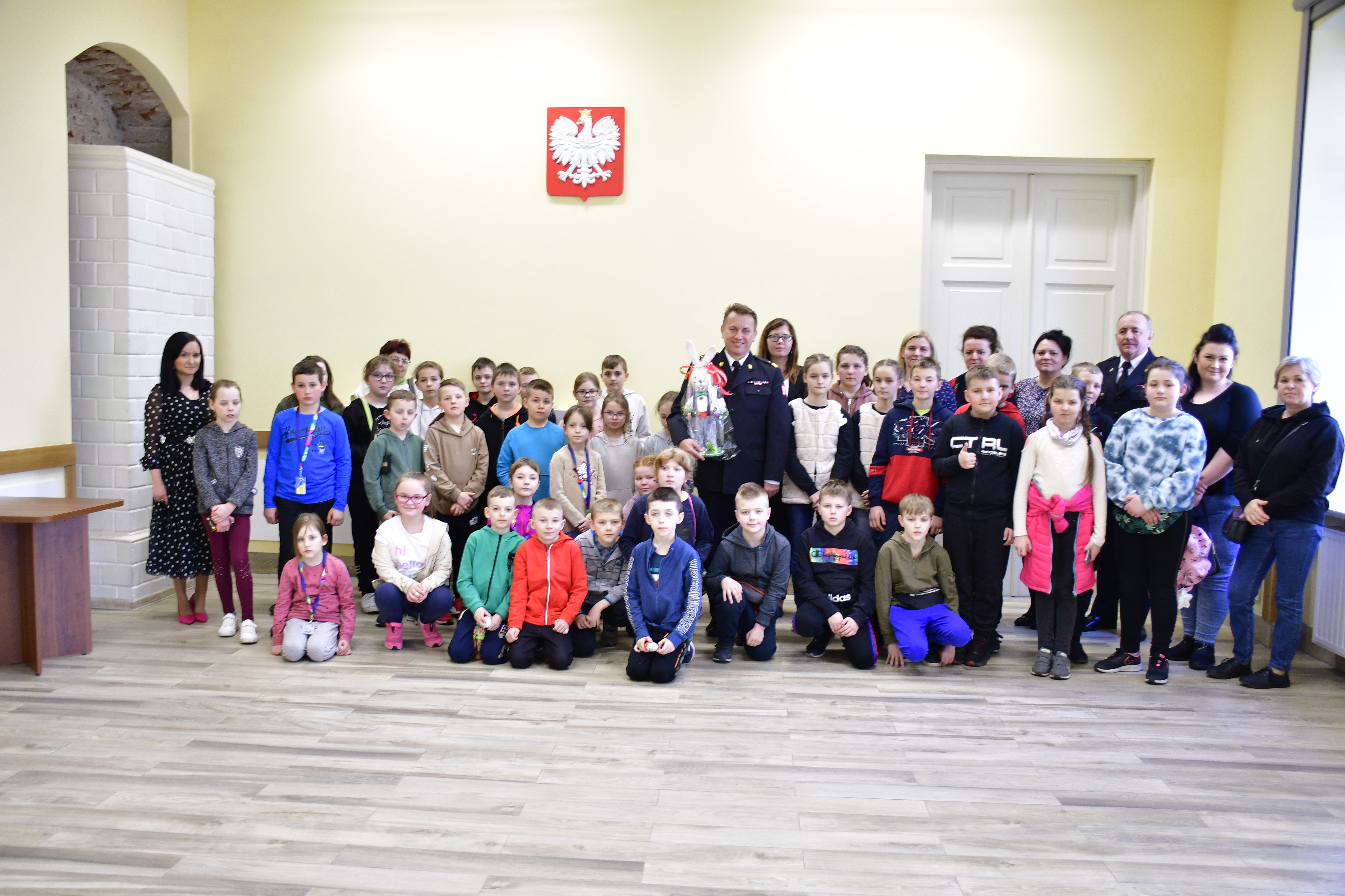 ze zwycięzcami konkursu „Czujka na straży Twojego bezpieczeństwa” Leną Molkowską i Michałem Lesińskim ze Szkoły Podstawowej im. Bohaterów Bitwy pod Sarnową Górą w Bądkowie oraz ich klasą. Lena i Michał zostali zwycięzcami konkursu, organizowanego przez Komendę Wojewódzką PSP