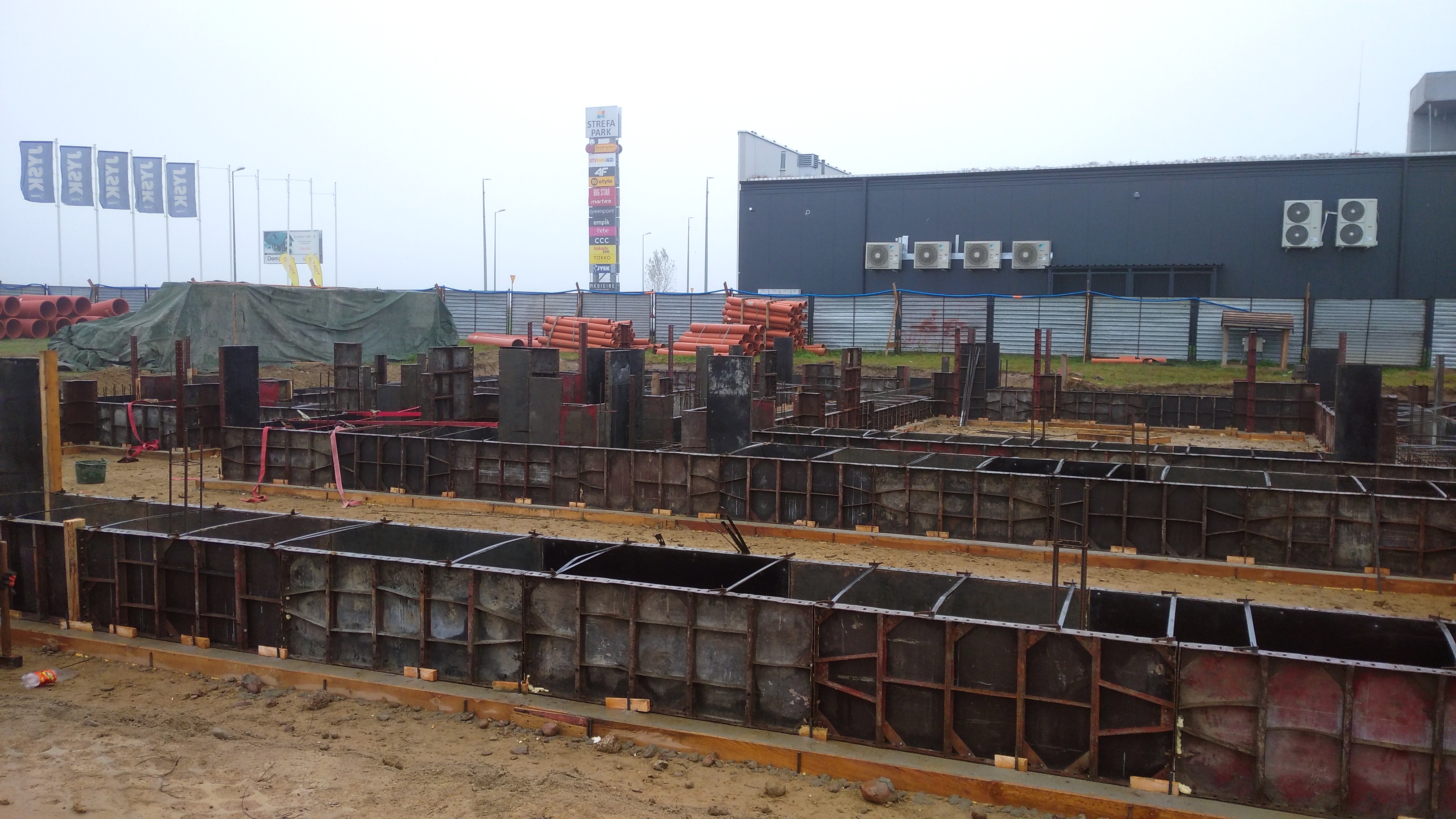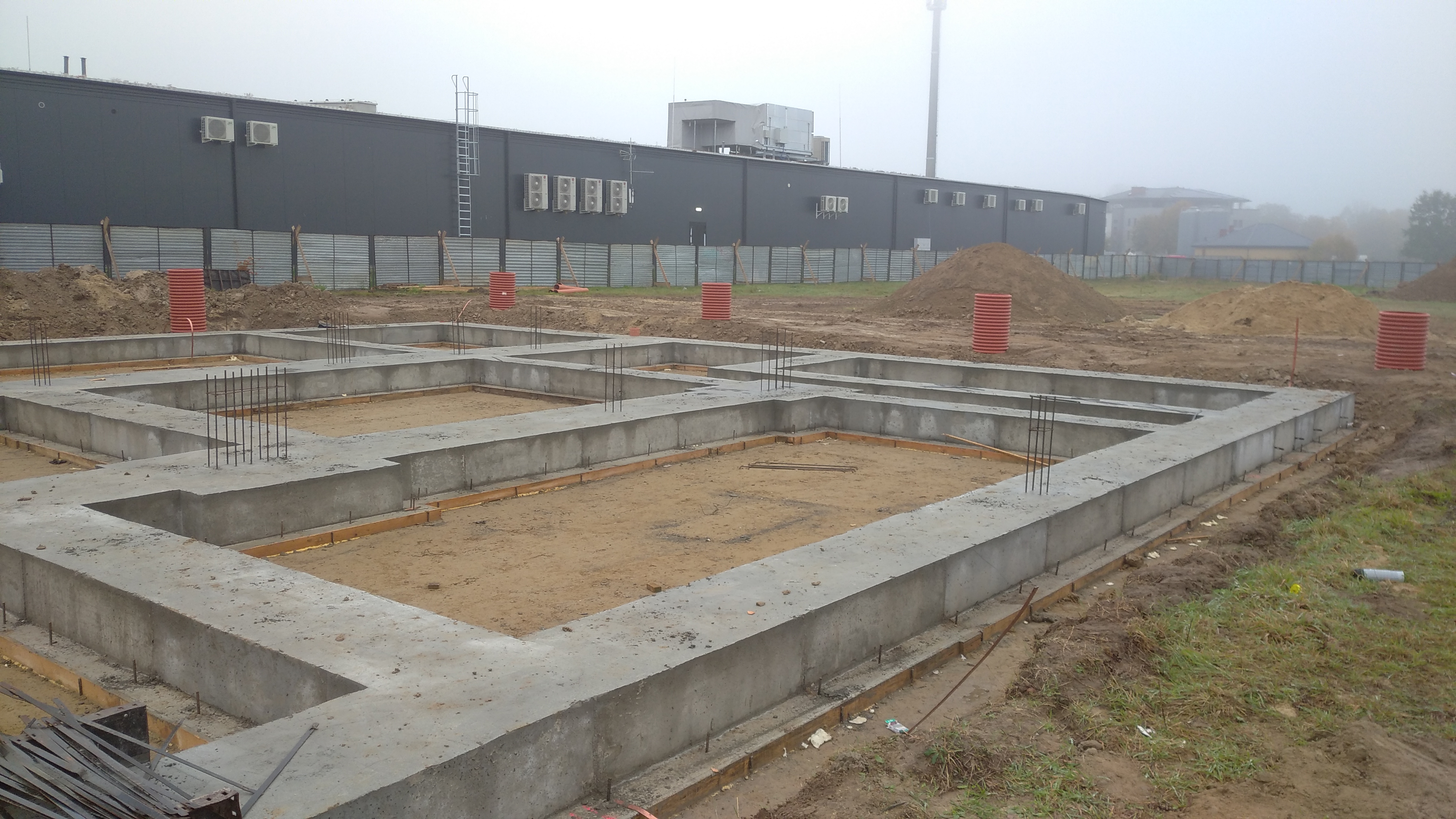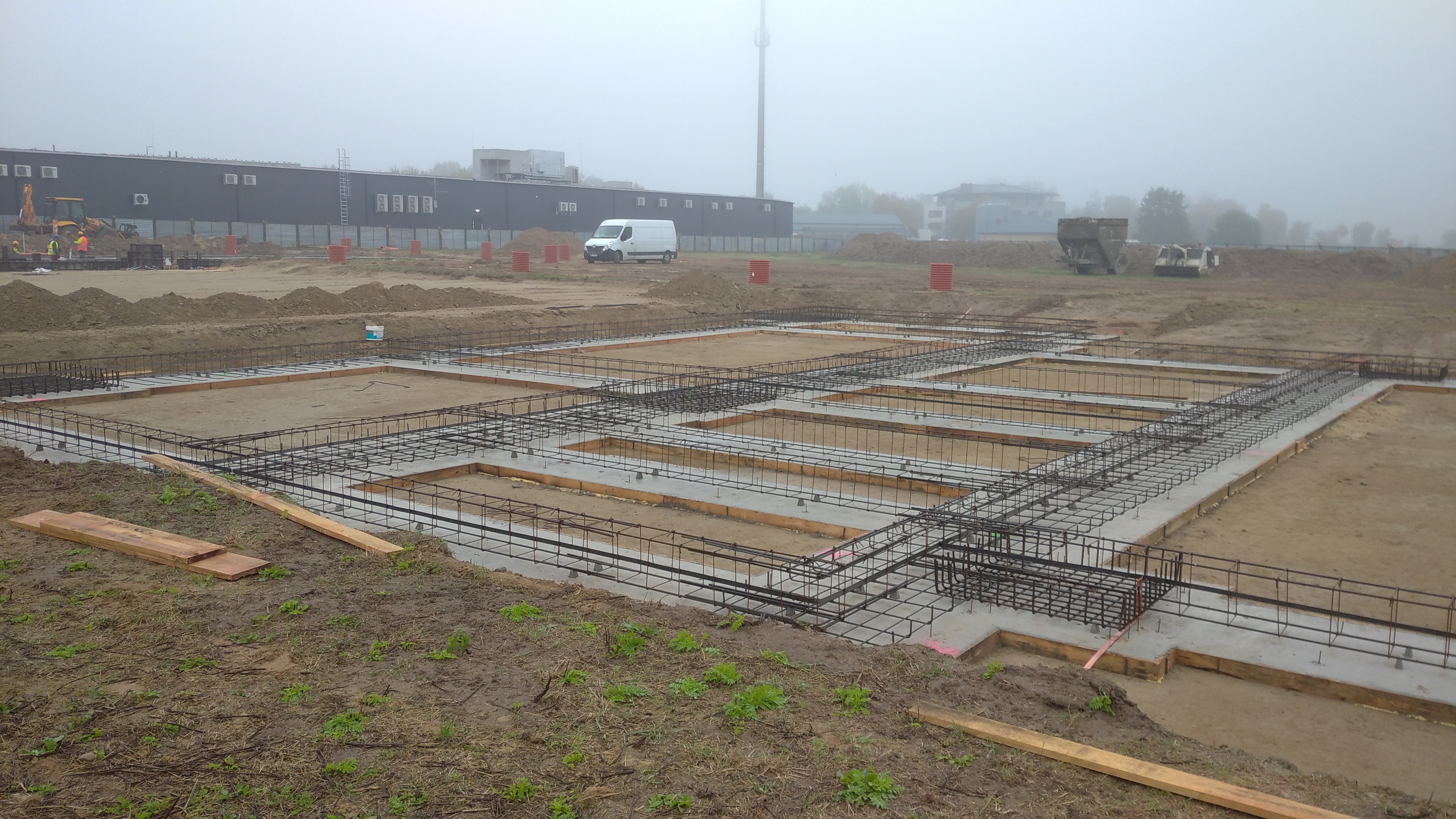 Roboty budowlane przebiegają zgodnie z harmonogramem, obecnie wykonywane są wykopy, wzmocnienie podłoża gruntowego, zasypki, drenaż wokół budynku, wykonanie fundamentów, roboty izolacyjne fundamentów, konstrukcje z betonu zbrojeniowego.