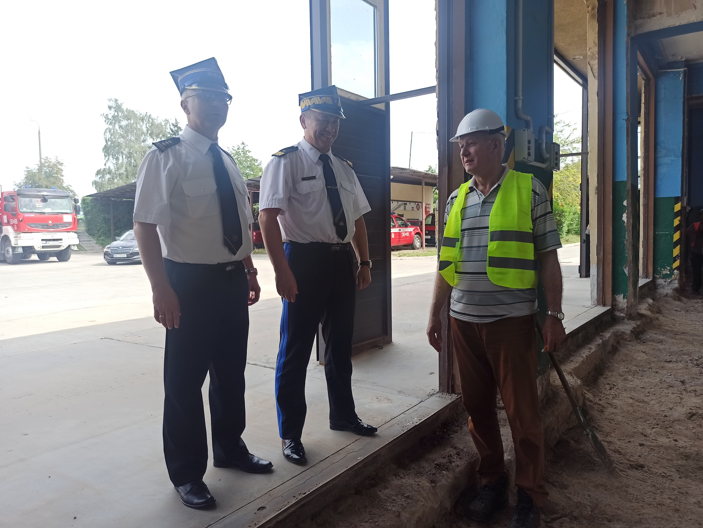 Podczas wizytacji Komendant zapoznał się z procesem modernizacji budynku garażowo-koszarowego JRG nr 1 Płock, polegającym na powiększeniu otworów bram garażowych do wysokości wjazdu 375 cm. Osiągnięcie ww. efektu planowane jest poprzez wybranie starej posadzki w garażu wraz z gruntem rodzimym i obniżenie jej, wymianę zniszczonej nawierzchni placu manewrowego (dojazd do bram garażowych) i obniżenie go przed garażami, rozebranie nadproża w garażach, wykonanie nowego o większym prześwicie, wymianę bram garażowych na większe.