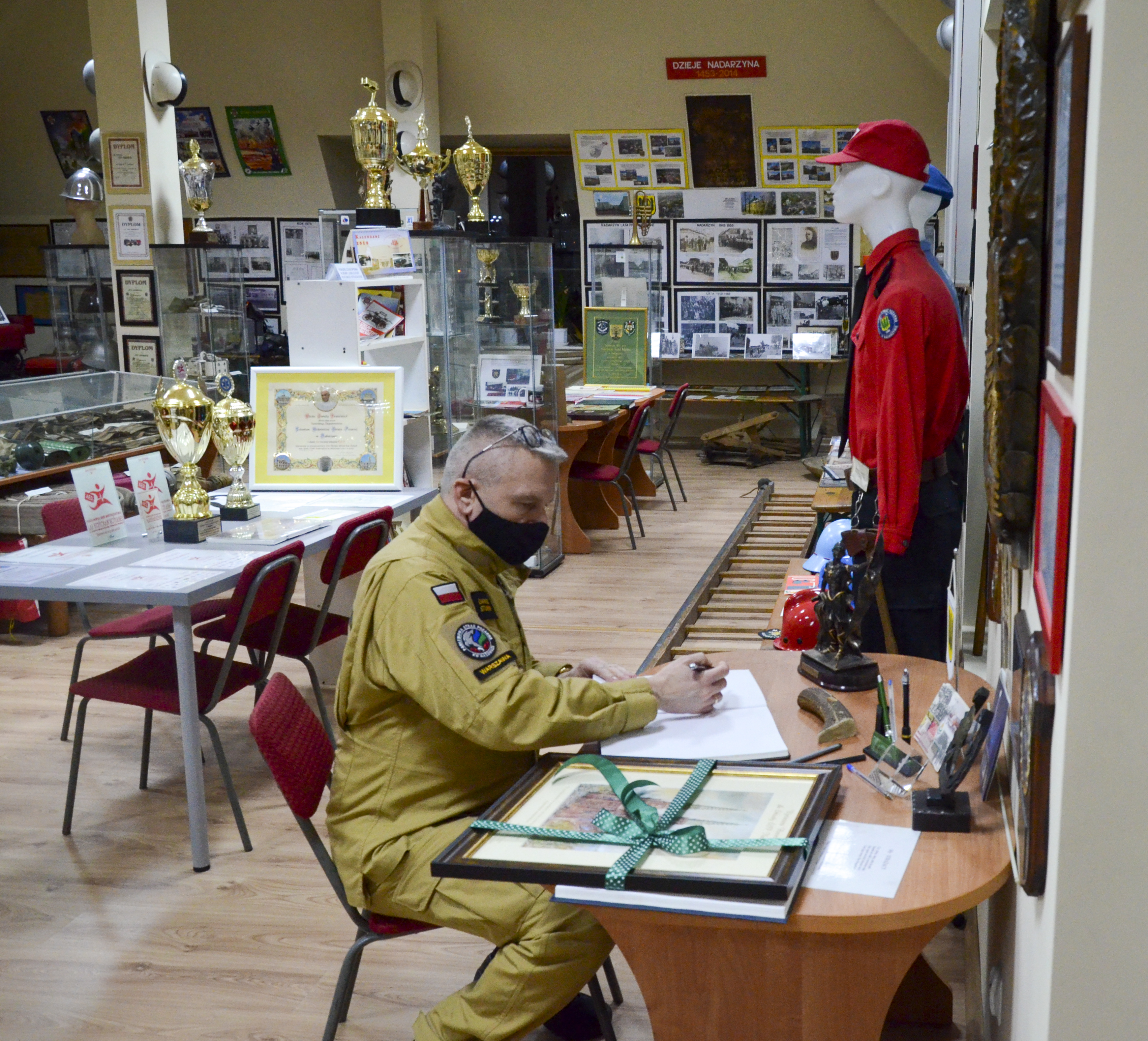 Zastępca Mazowieckiego Komendanta Wojewódzkiego PSP podczas wizytacji odwiedził Izbę Pamięci Ochotniczej Straży Pożarnej w Nadarzynie. Jest to miejsce pamięci, w którym znajdują się eksponaty związane z działalnością strażaków i ochrony przeciwpożarowej. Podczas spotkania st. bryg. Dariusz Stumski na ręce Pana Mirosława Chilmanowicza wręczył honorowe wyróżnienie Mazowieckiego Komendanta Wojewódzkiego PSP w podziękowaniu za współpracę na rzecz propagowania ochrony przeciwpożarowej na terenie województwa mazowieckiego.