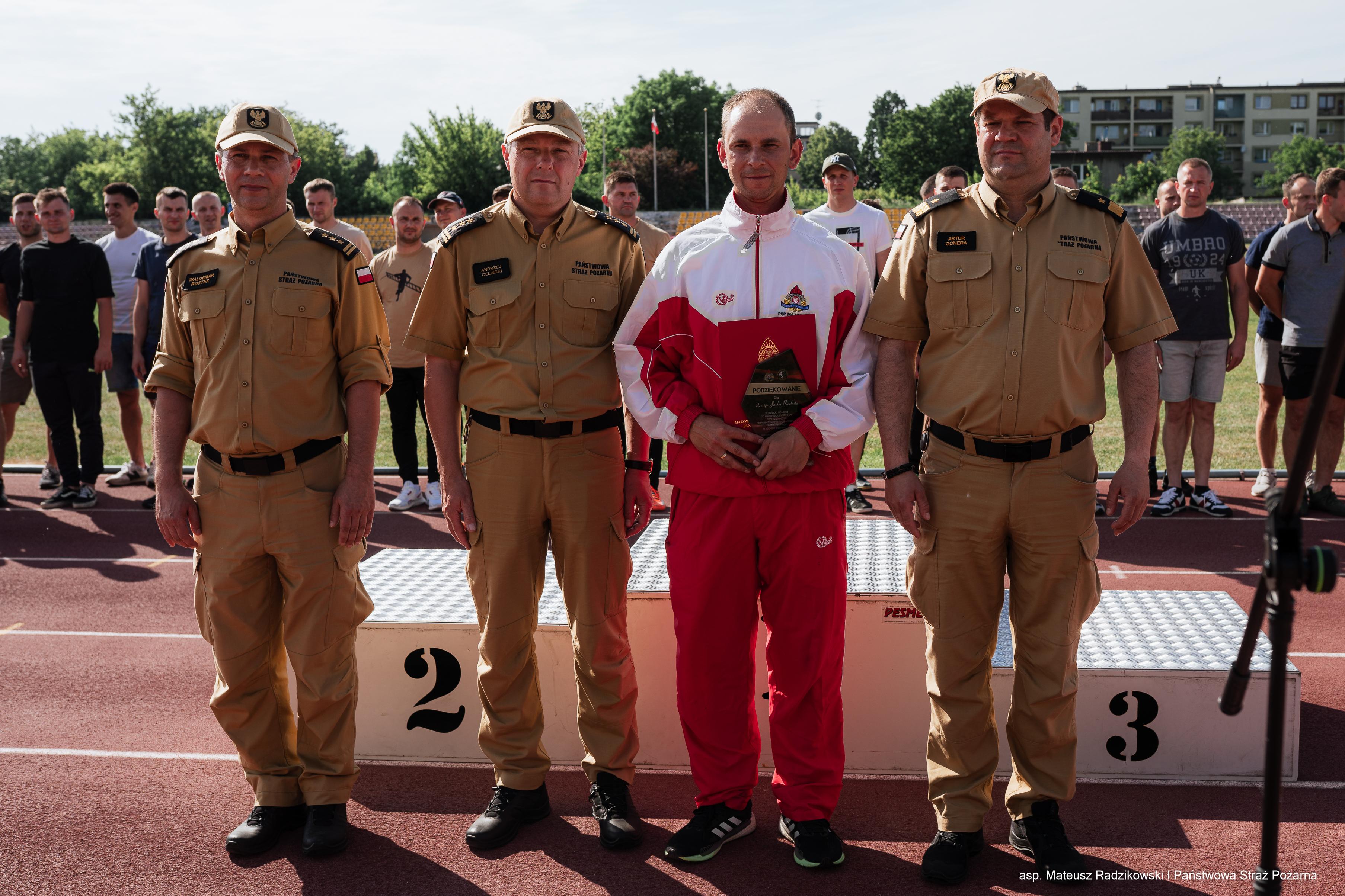 Przed ogłoszeniem wyników, w związku z zakończeniem kariery - reprezentanta drużyny województwa mazowieckiego w sporcie pożarniczym - st. asp. Jacka Bierkata z Komendy Miejskiej PSP w Siedlcach, Mazowiecki Komendant Wojewódzki PSP nadbryg. Artur Gonera wraz z Komendantem Miejskim PSP w Siedlcach, Zastępcą Komendanta Miejskiego PSP w Siedlcach oraz Kadrą Województwa Mazowieckiego w Sporcie Pożarniczym wręczyli pamiątkową statuetkę st. asp. Jackowi Bierkatowi dziękując za jego sportowe osiągnięcia i wieloletnie reprezentowanie Mazowsza w sporcie pożarniczym.