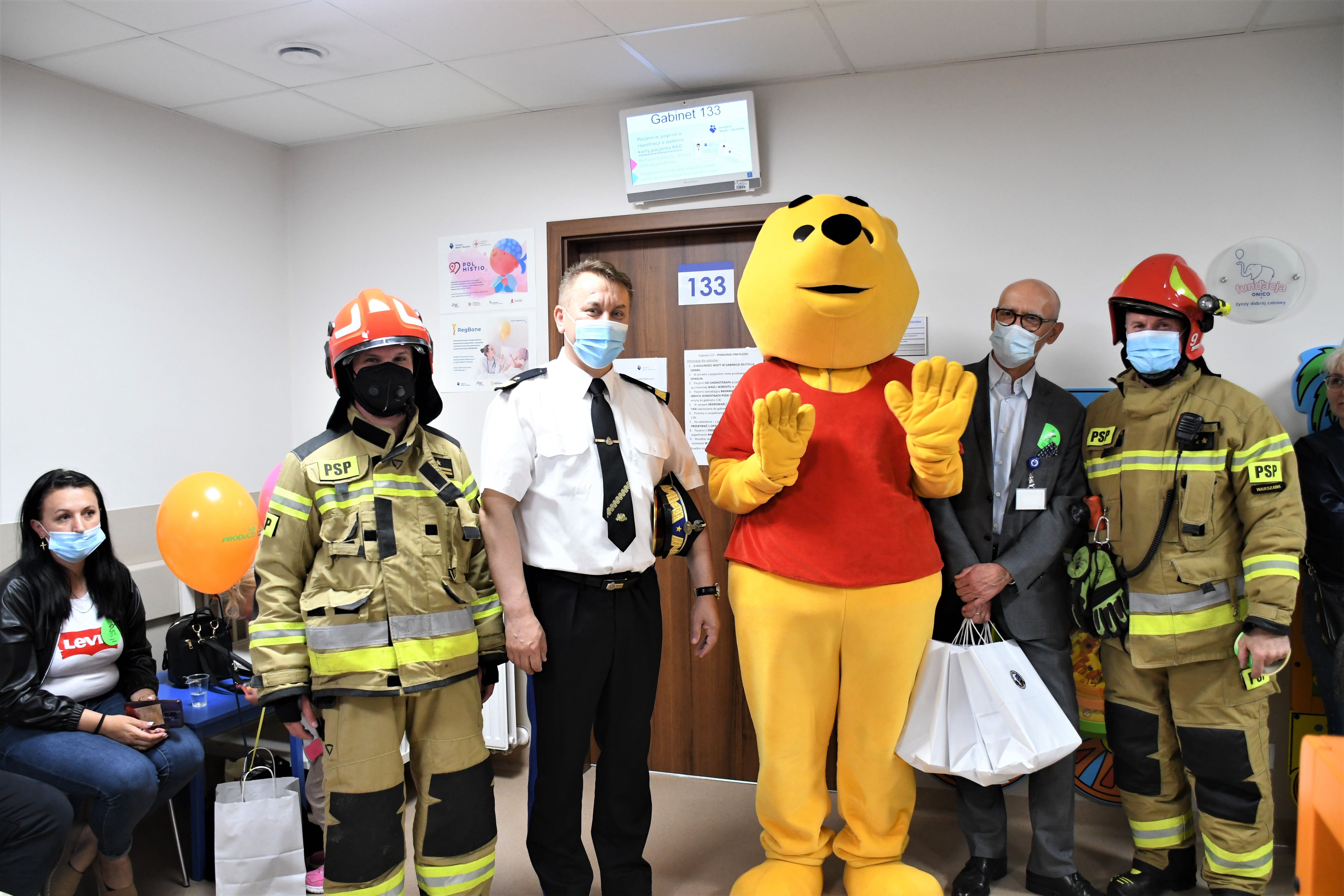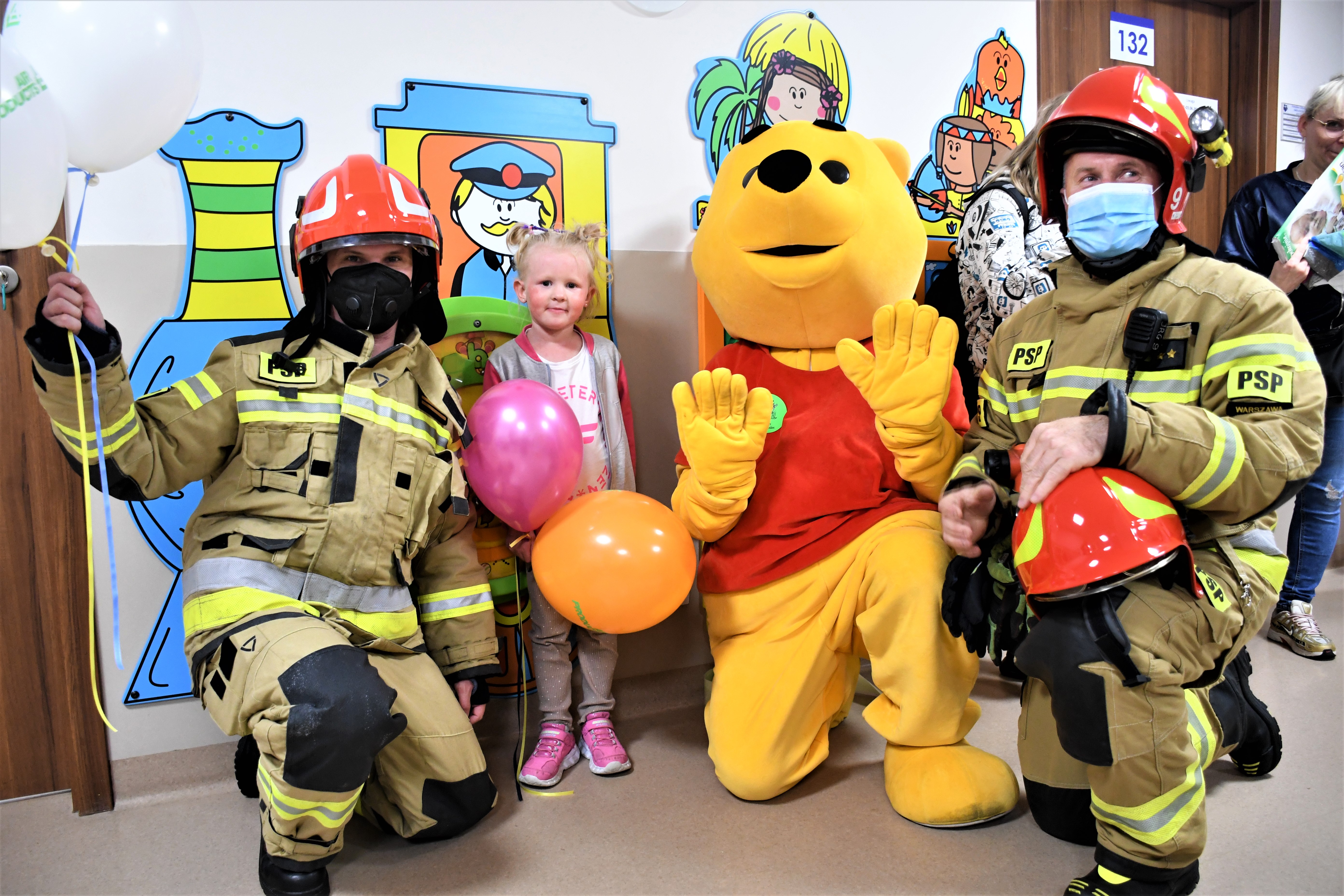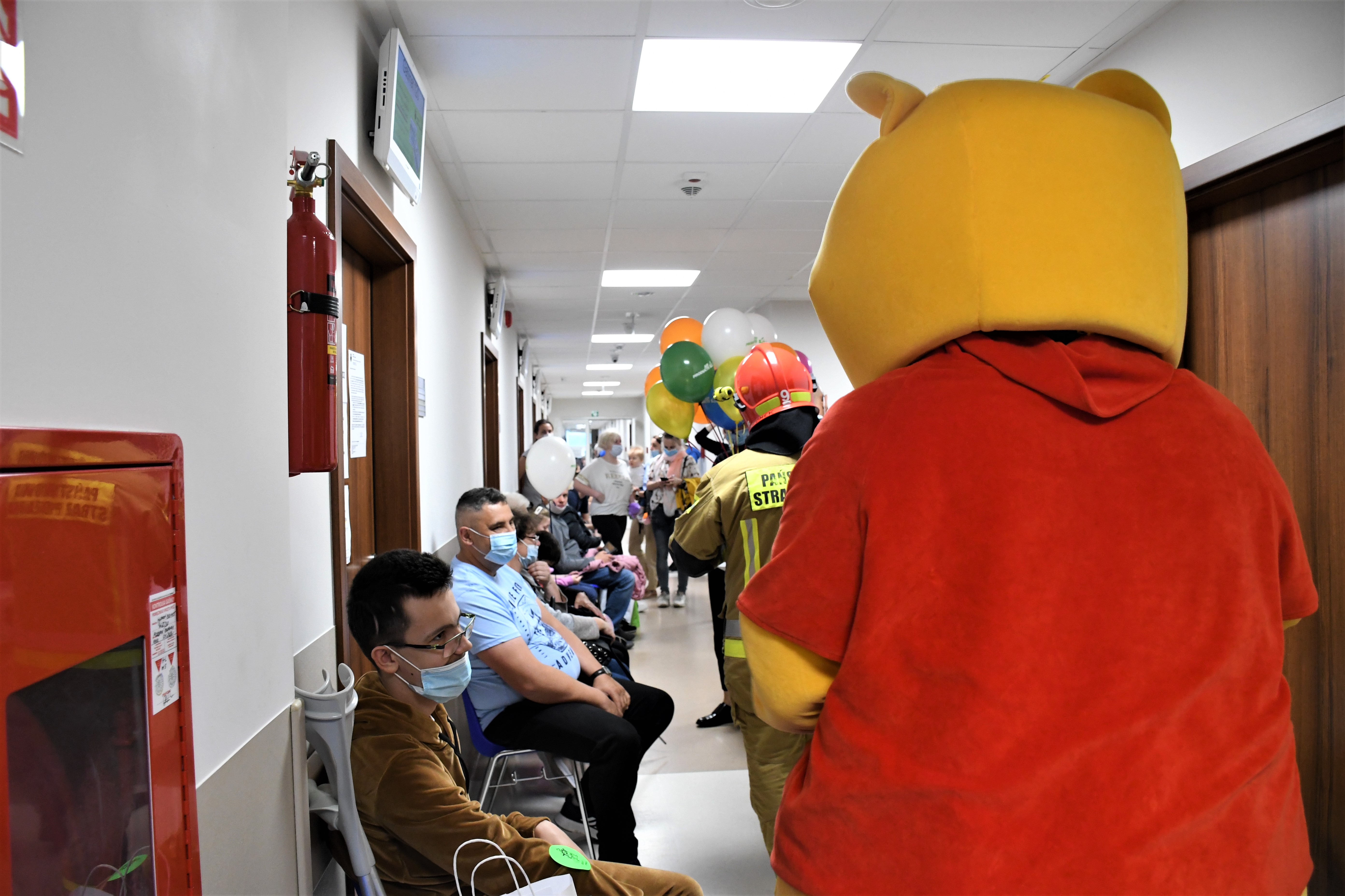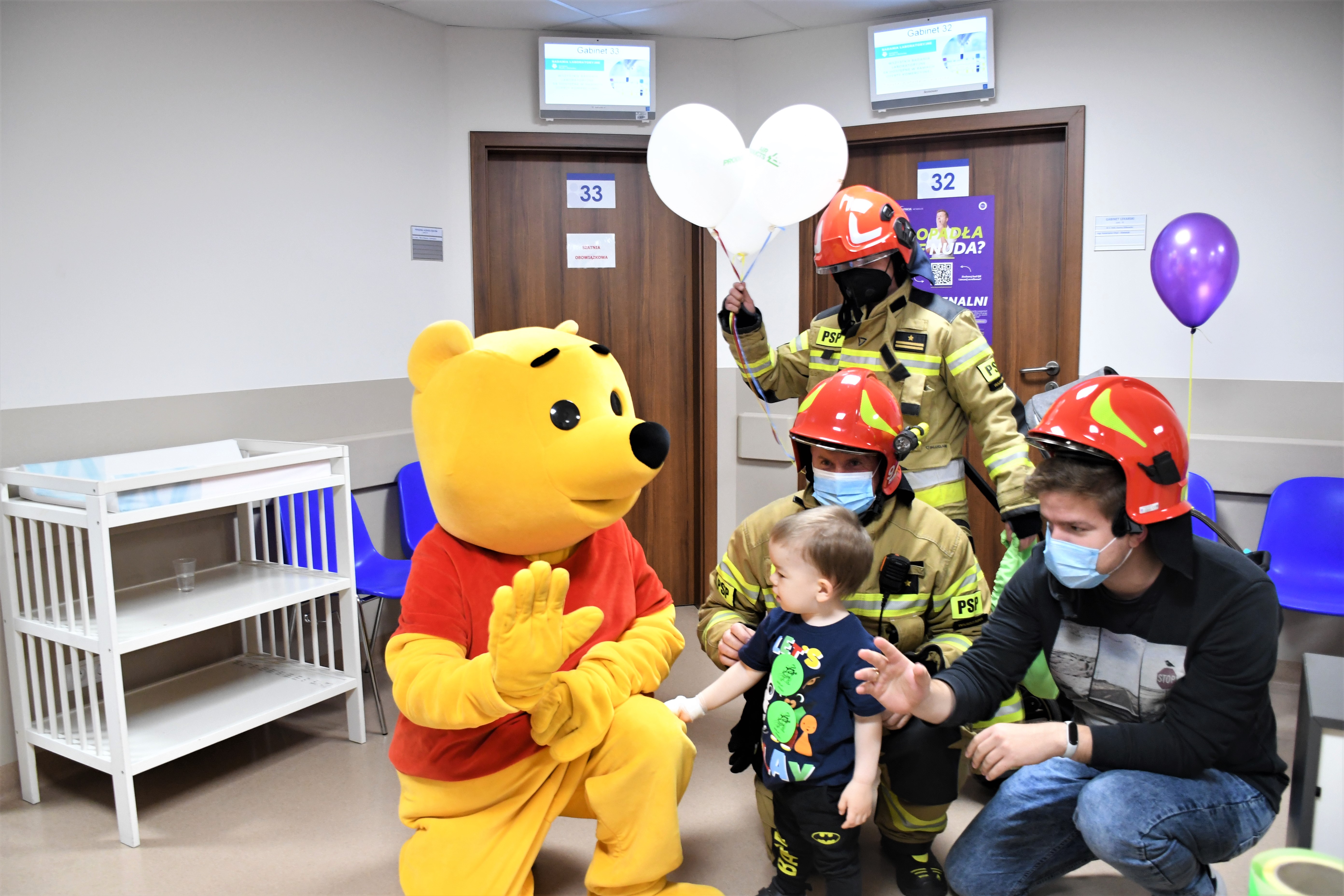 Strażacy w pełnym umundurowaniu specjalnym, rozdawali dzieciom prezenty, balony i naklejki „dzielny strażak”. Mali pacjenci chętnie przymierzali hełm strażacki i pozowali do zdjęć. Dodatkową atrakcją był funkcjonariusz PSP przebrany za dużego misia – Kubusia Puchatka, z którym dzieci entuzjastycznie przybijały piątki.