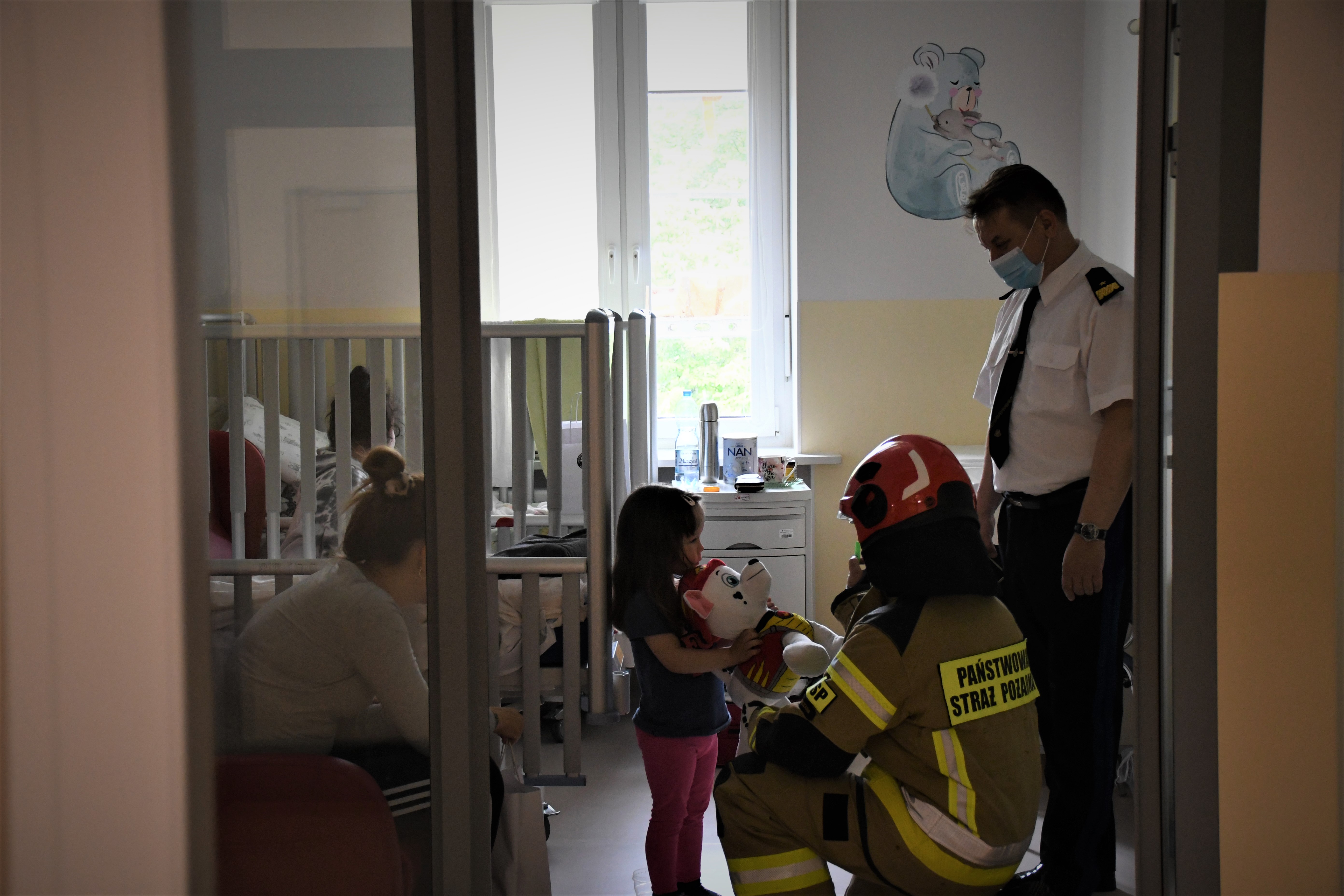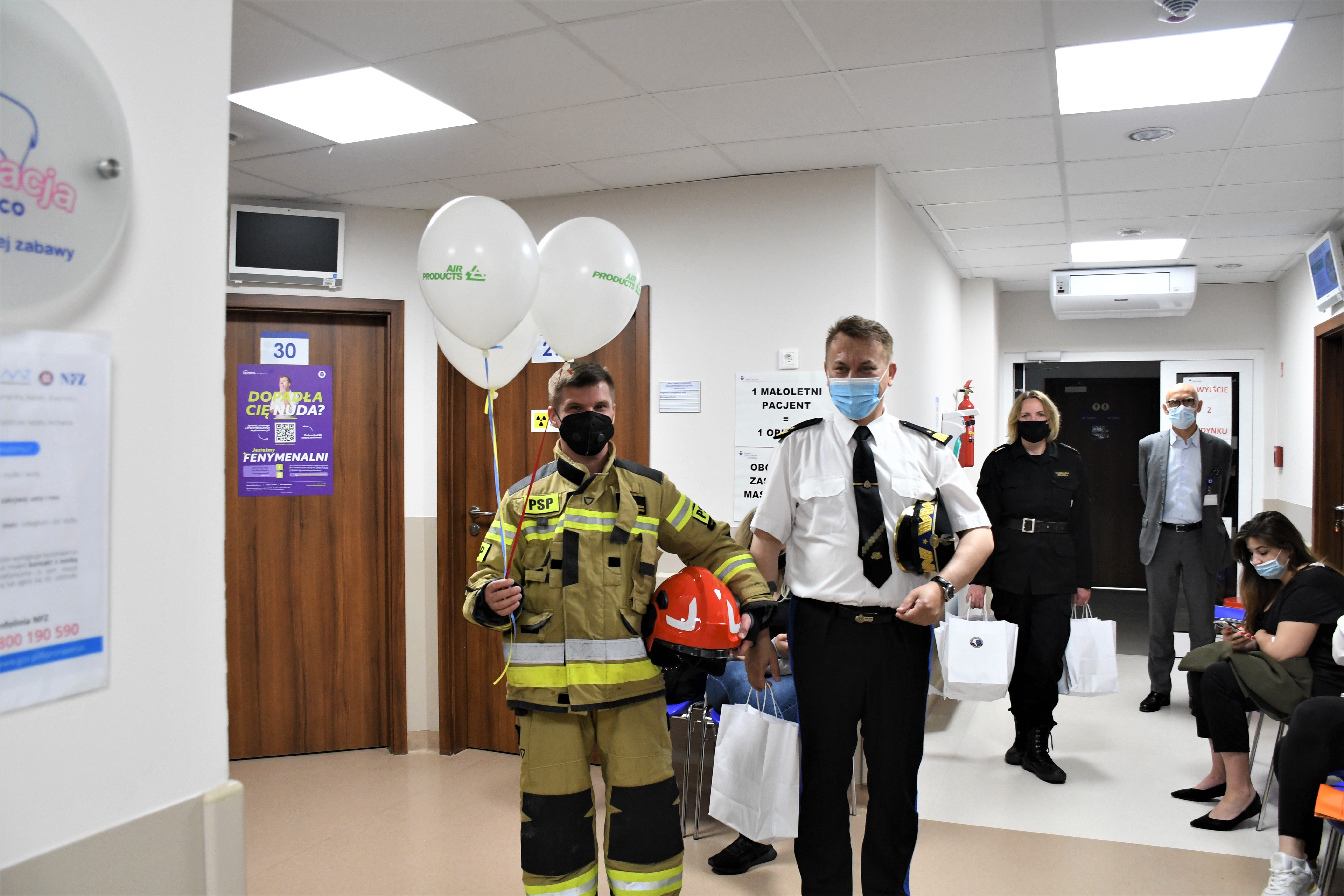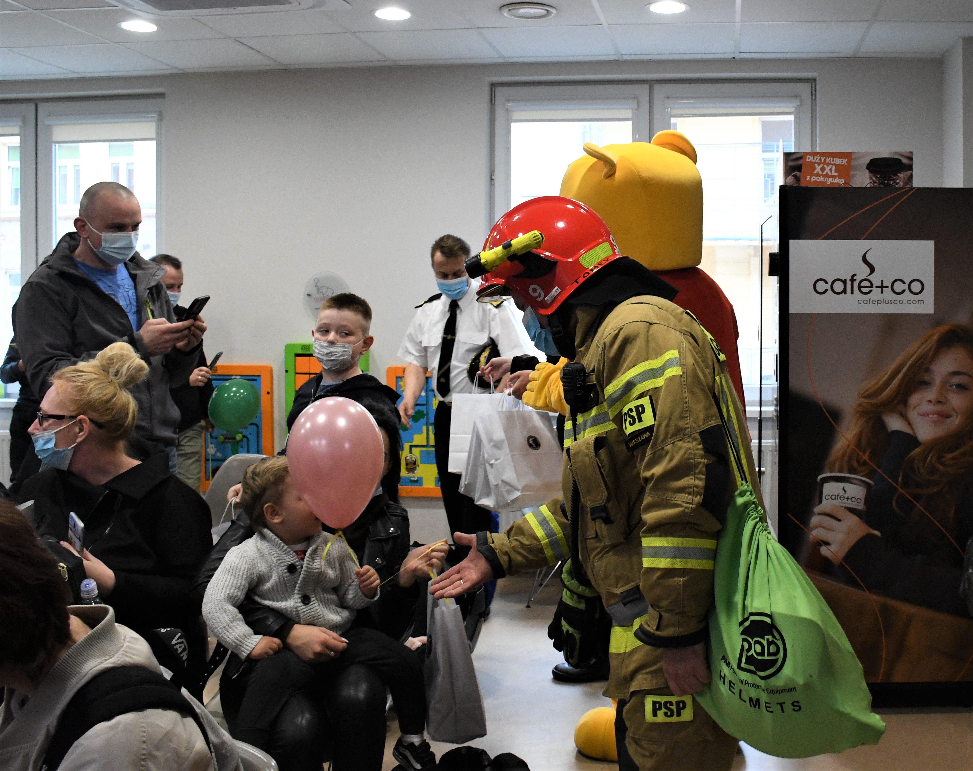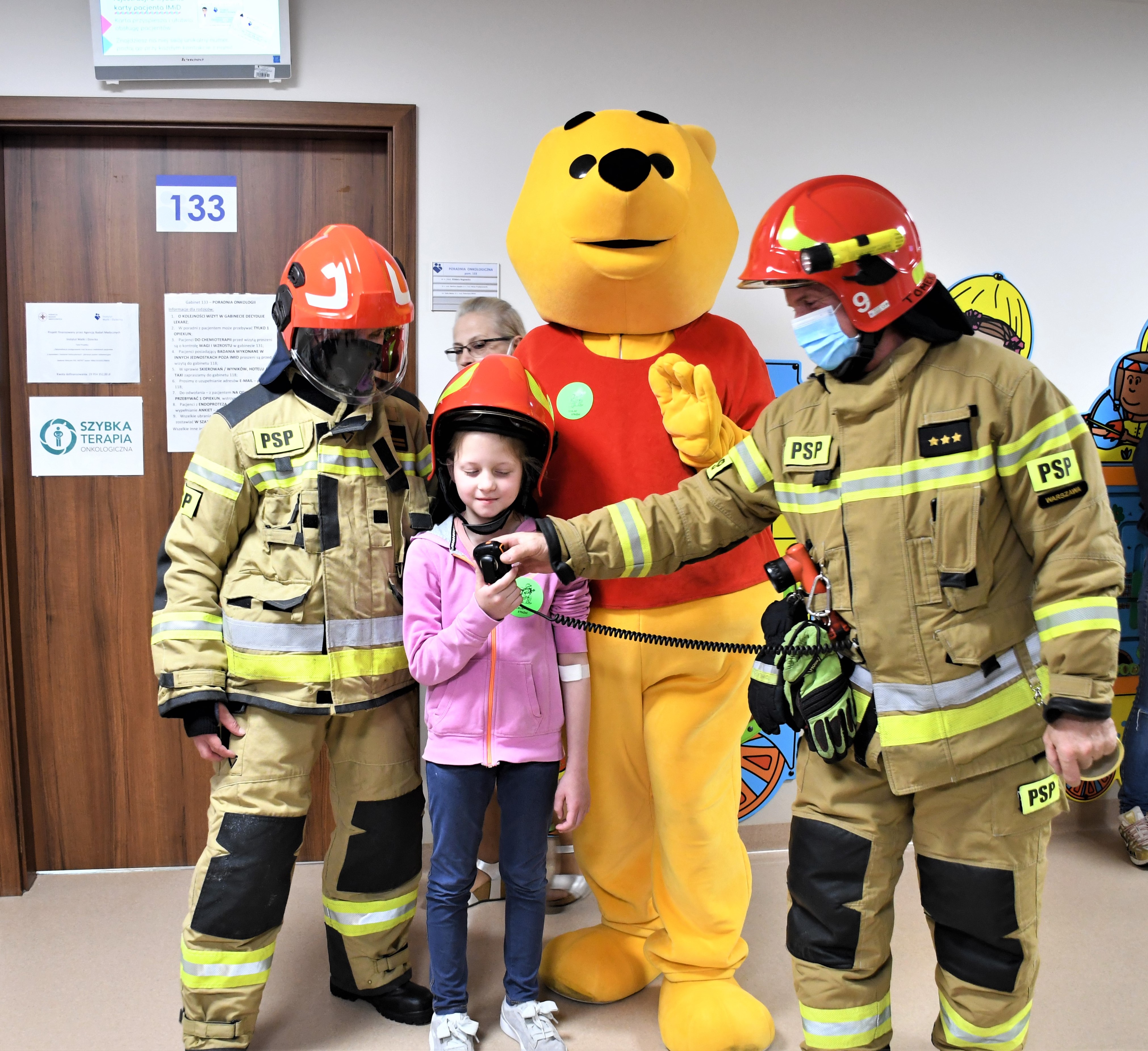 Strażacy w pełnym umundurowaniu specjalnym, rozdawali dzieciom prezenty, balony i naklejki „dzielny strażak”. Mali pacjenci chętnie przymierzali hełm strażacki i pozowali do zdjęć. Dodatkową atrakcją był funkcjonariusz PSP przebrany za dużego misia – Kubusia Puchatka, z którym dzieci entuzjastycznie przybijały piątki.