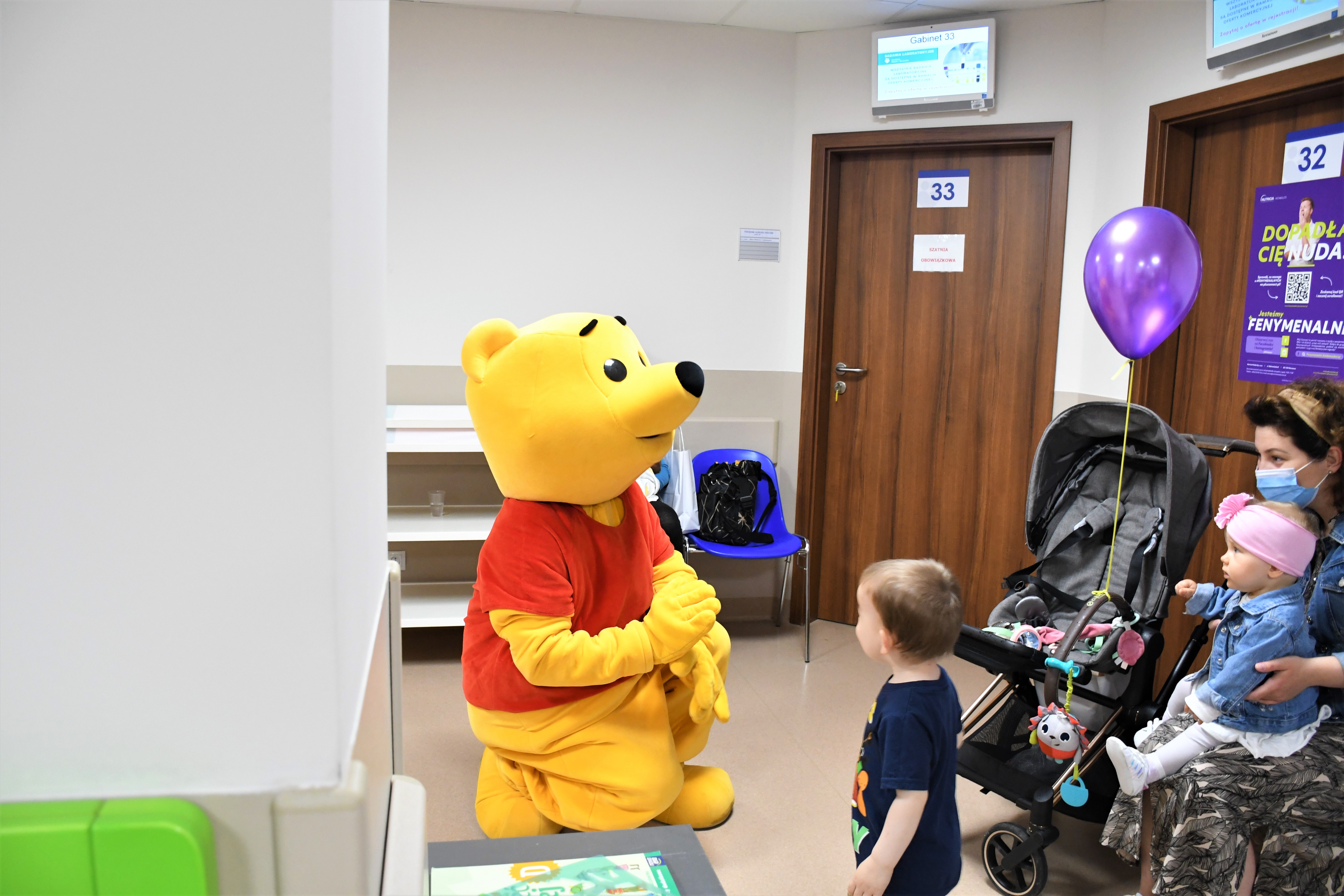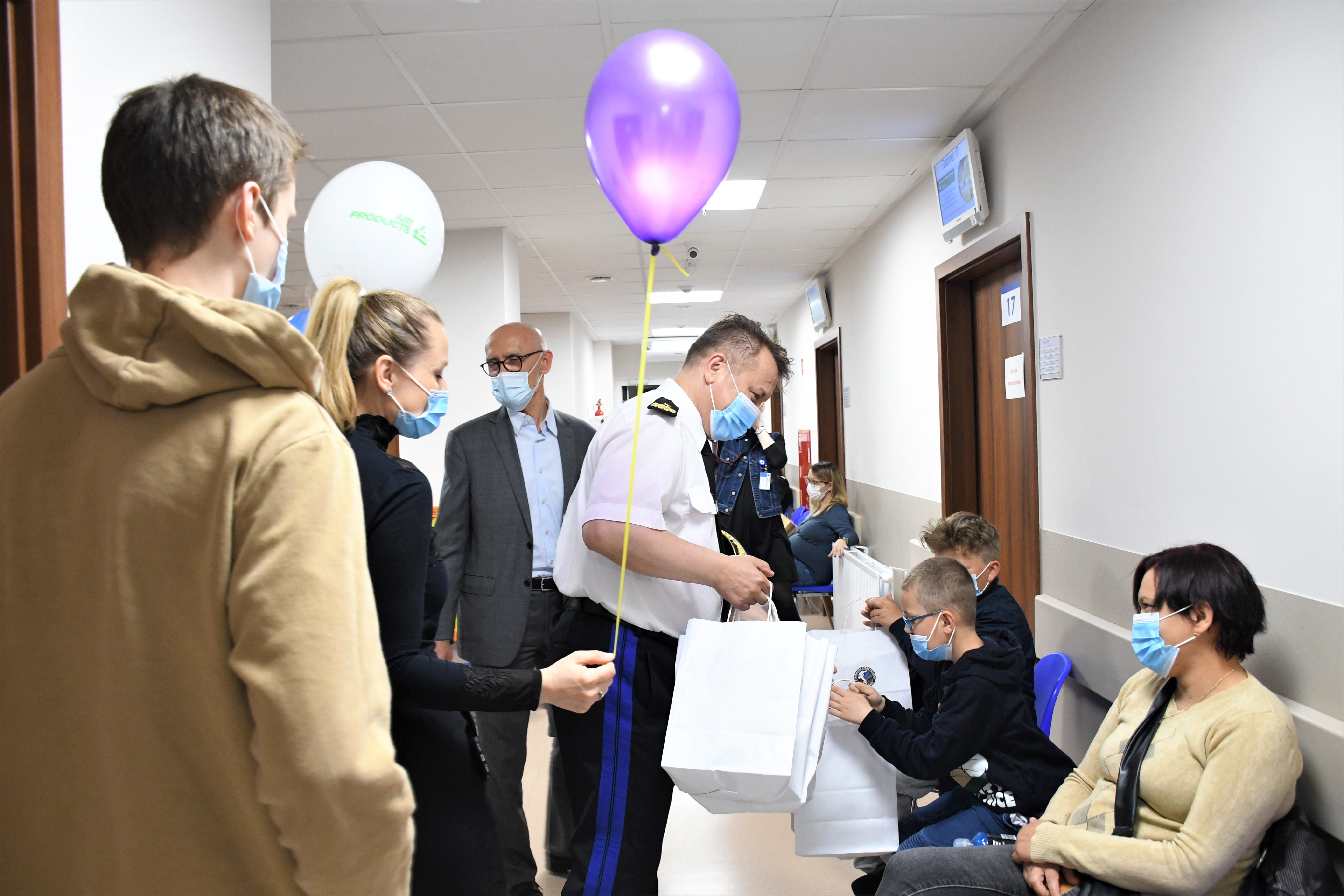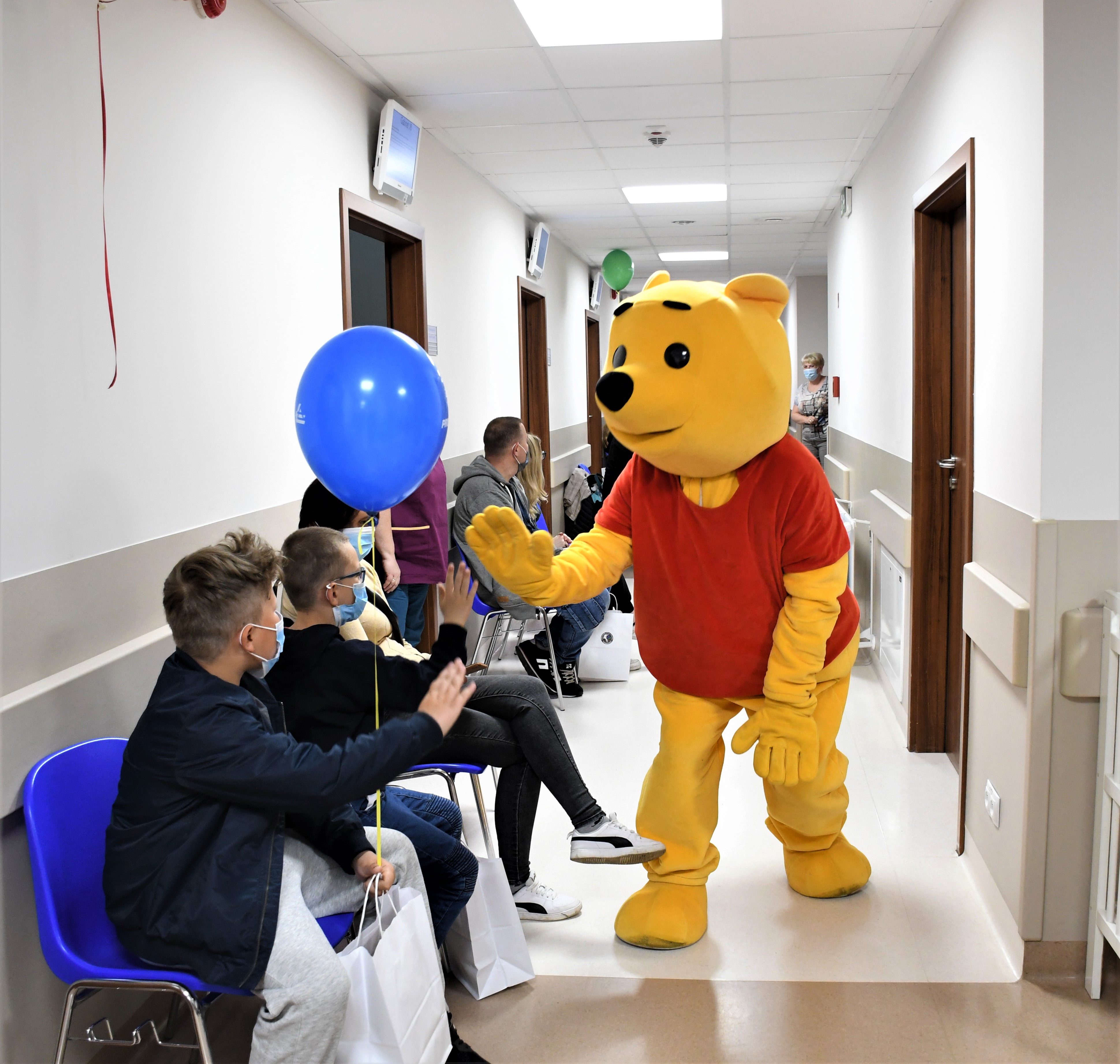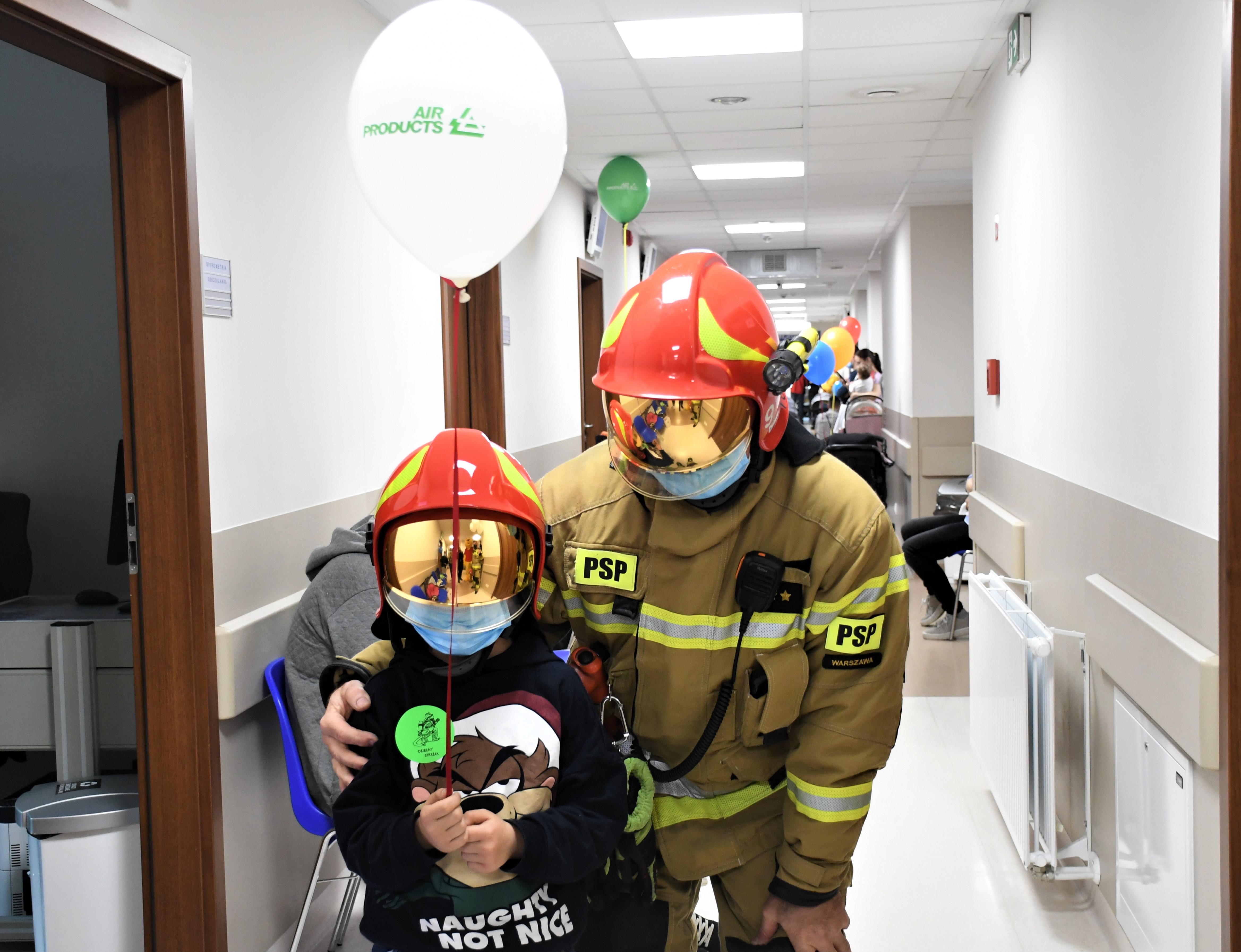 Strażacy w pełnym umundurowaniu specjalnym, rozdawali dzieciom prezenty, balony i naklejki „dzielny strażak”. Mali pacjenci chętnie przymierzali hełm strażacki i pozowali do zdjęć. Dodatkową atrakcją był funkcjonariusz PSP przebrany za dużego misia – Kubusia Puchatka, z którym dzieci entuzjastycznie przybijały piątki.