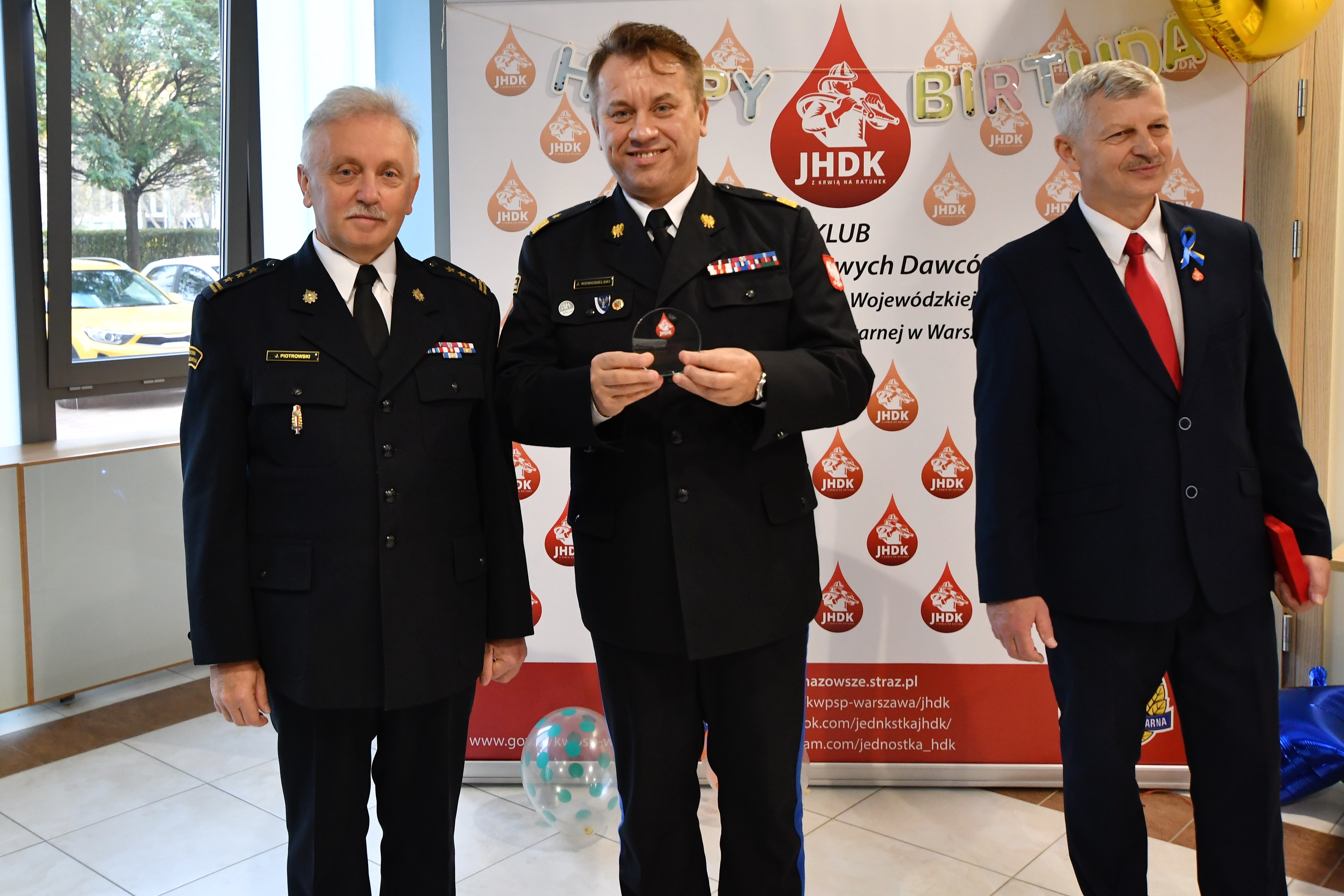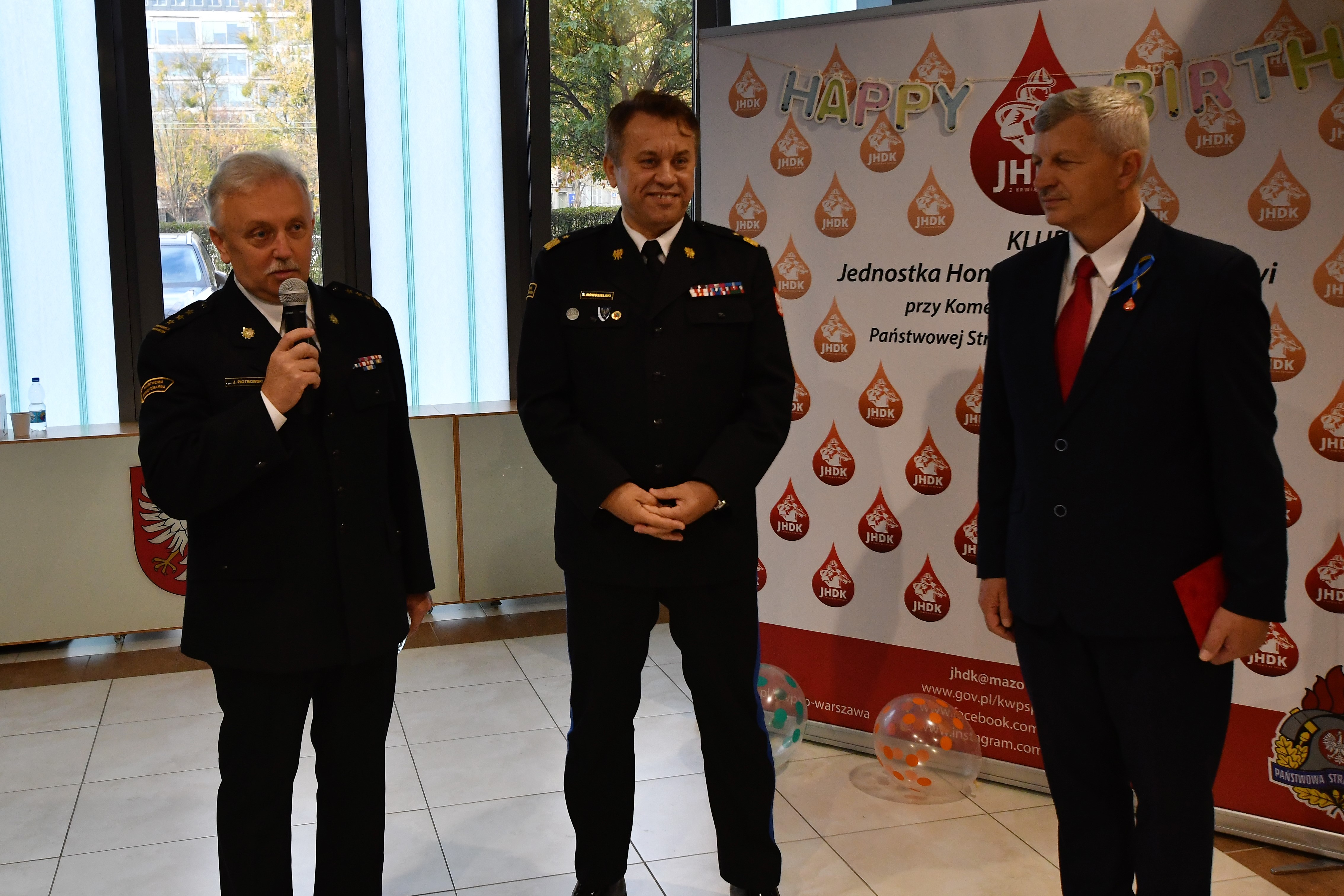 st. bryg. Jarosławem Piotrowskim, a także z asp. sztab. w st. spocz. Krzysztofem Roguskim - prezesem Klubu JHDK przy Komendzie Wojewódzkiej PSP w Warszawie. Mazowiecki Komendant Wojewódzki PSP podziękował krwiodawcom za liczne przybycie oraz czynne wspieranie idei honorowego krwiodawstwa. Z okazji obchodzonego w tym roku jubileuszu