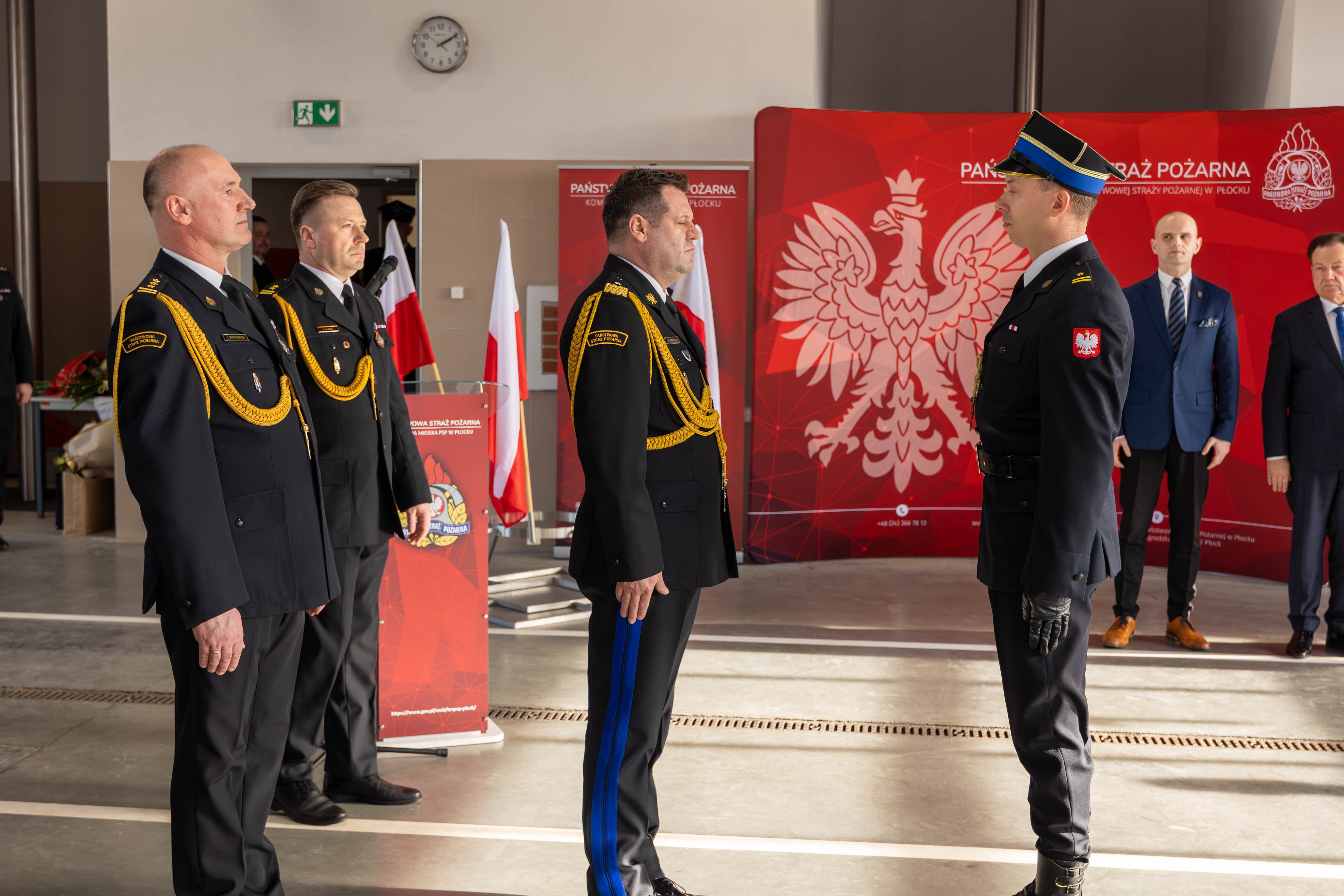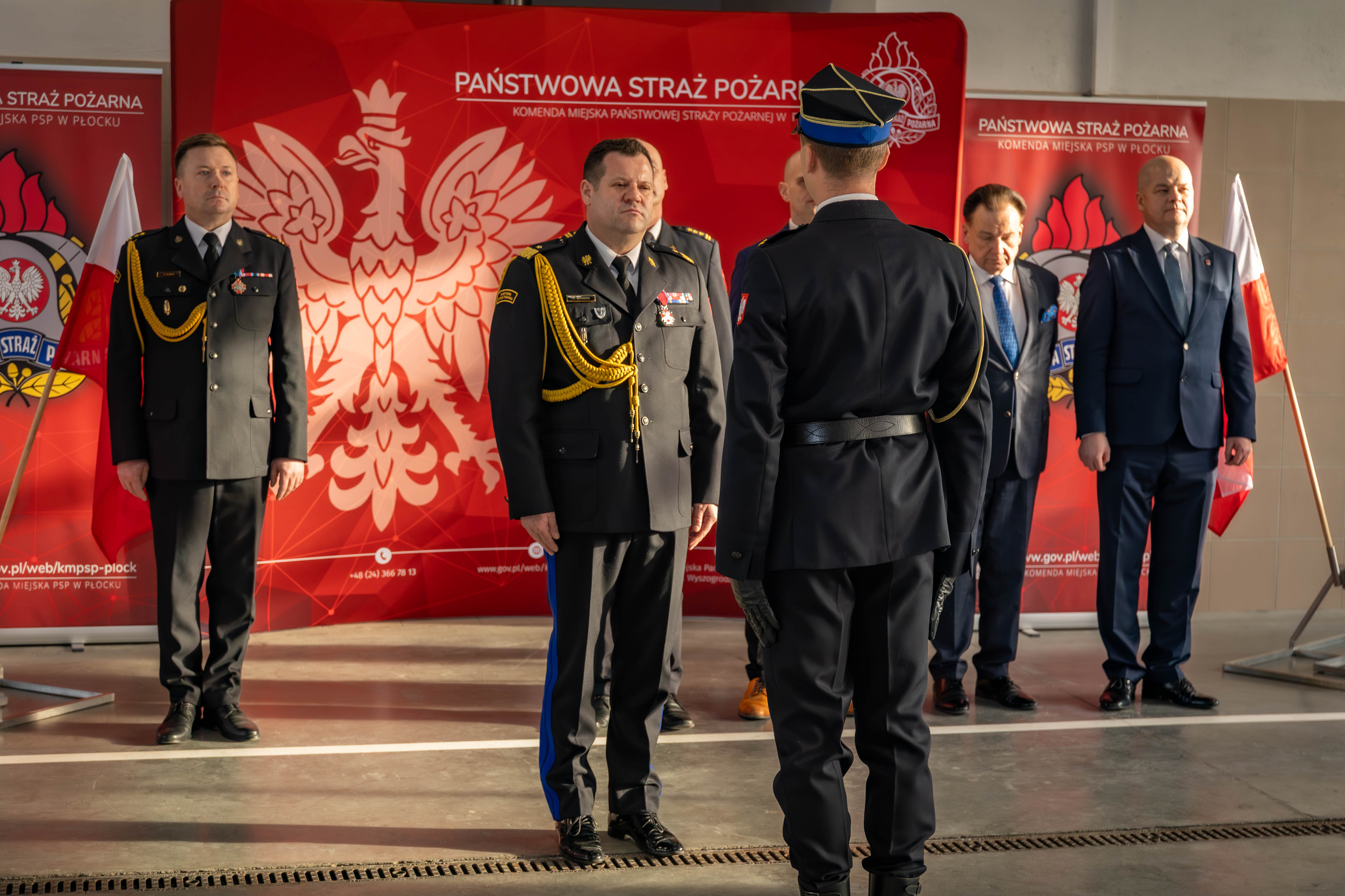 Po przemówieniu, zgodnie z obowiązującym ceremoniałem pożarniczym, mł. kpt. Wojciech Pietrzak odczytał decyzje o odwołaniu st. bryg. Jacka Starczewskiego oraz o powołaniu bryg. Alberta Lejmana na stanowisko Komendanta Miejskiego PSP w Płocku.