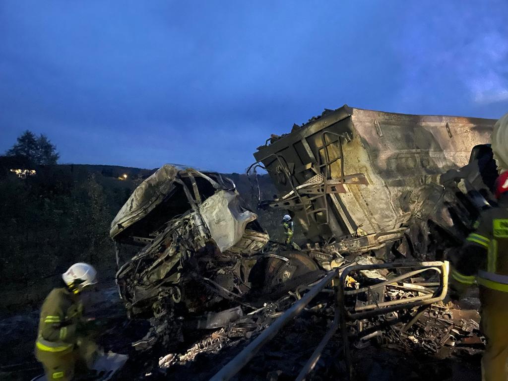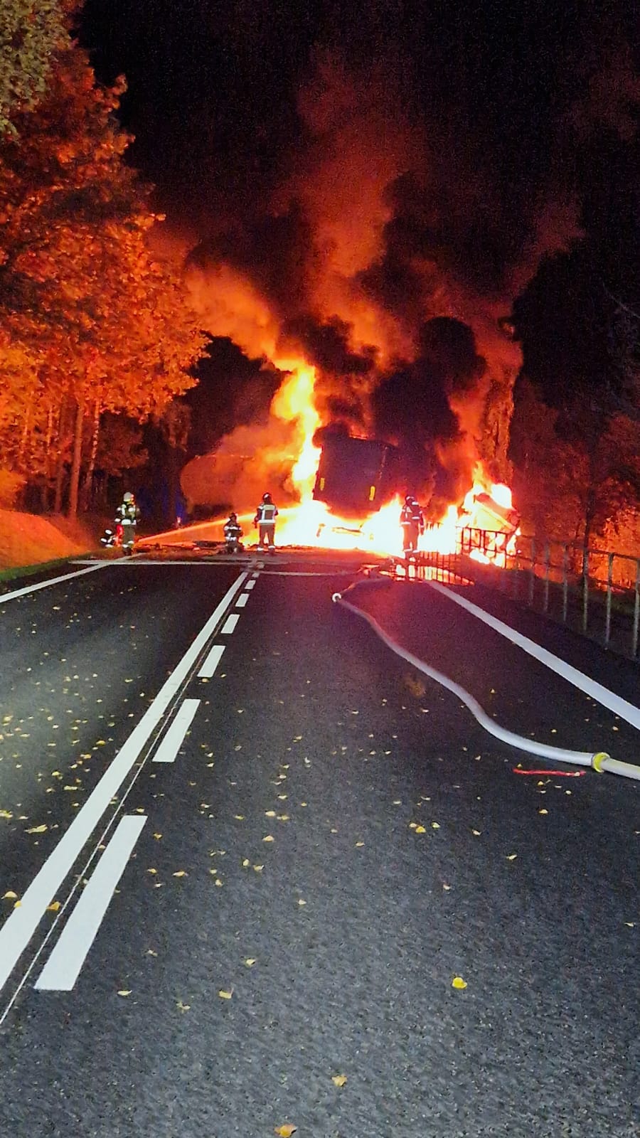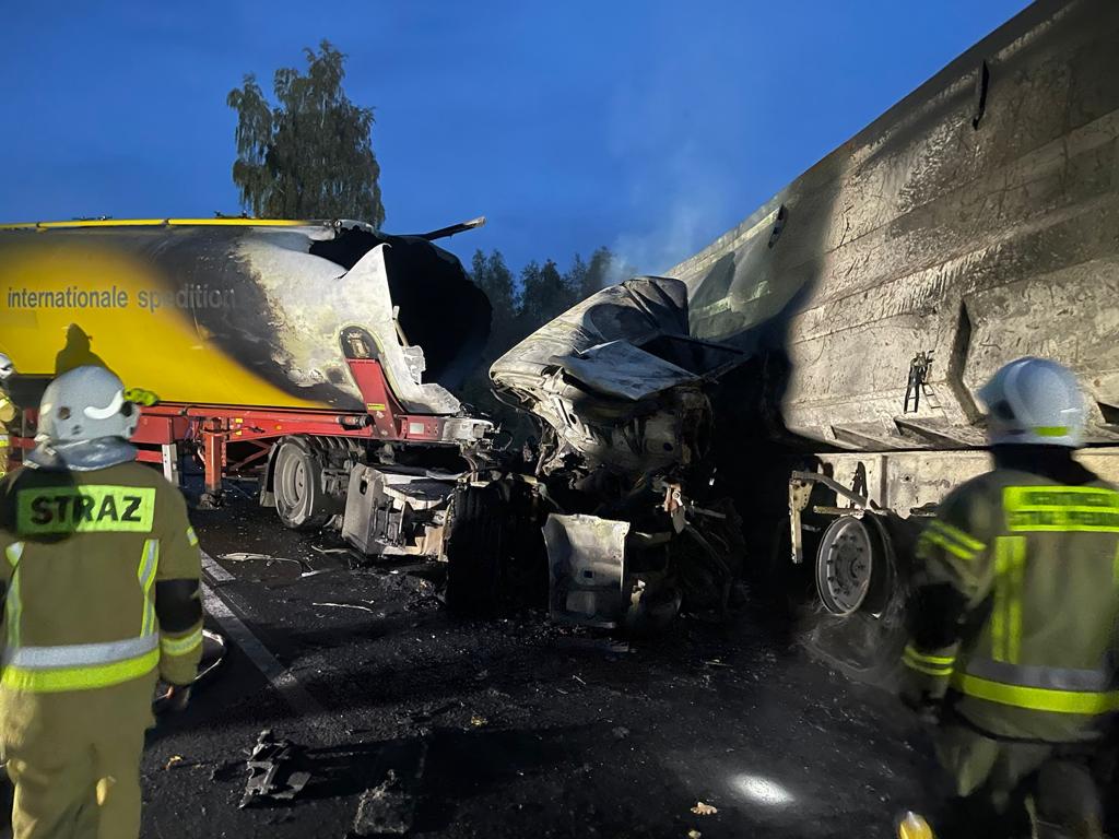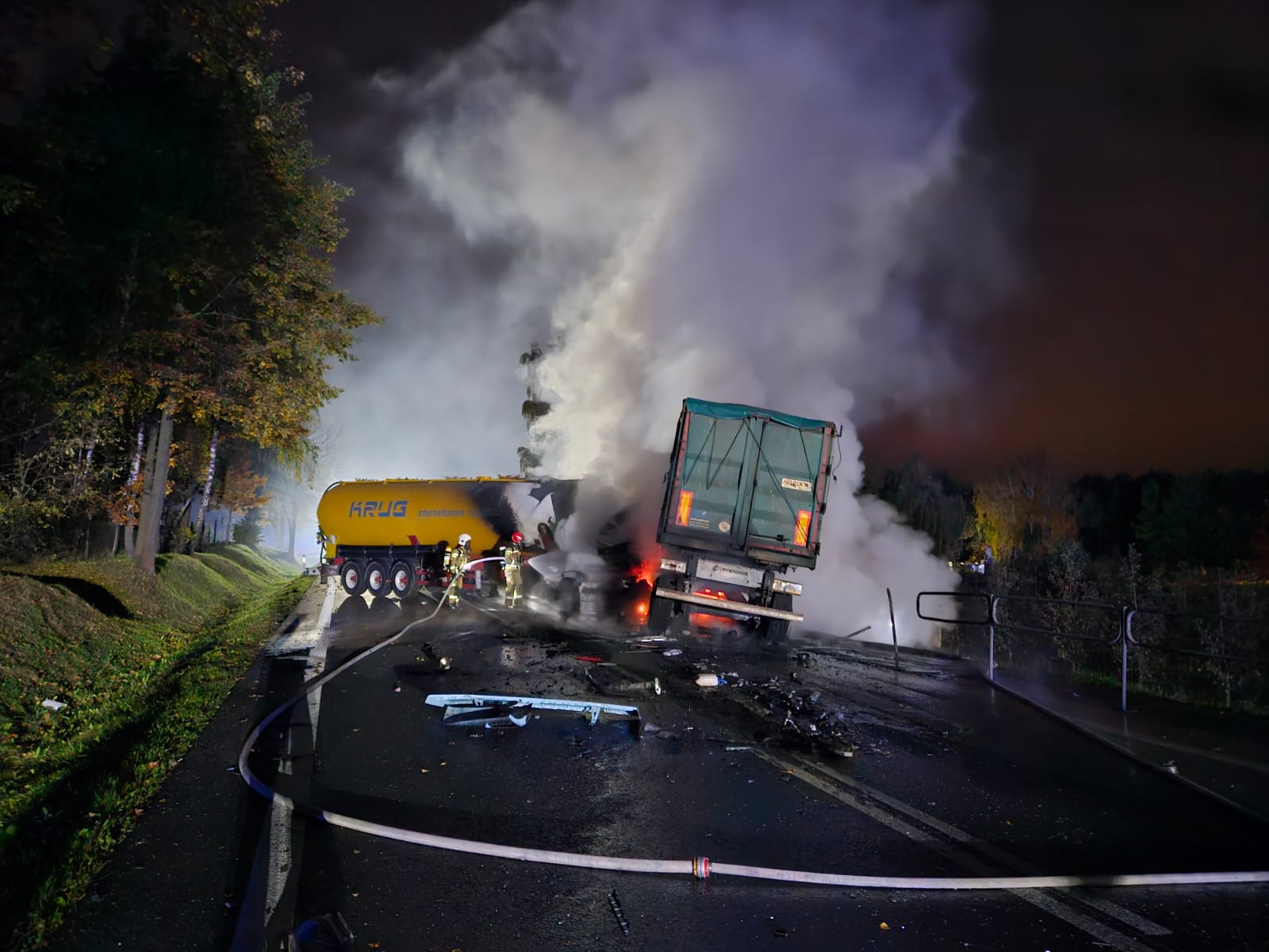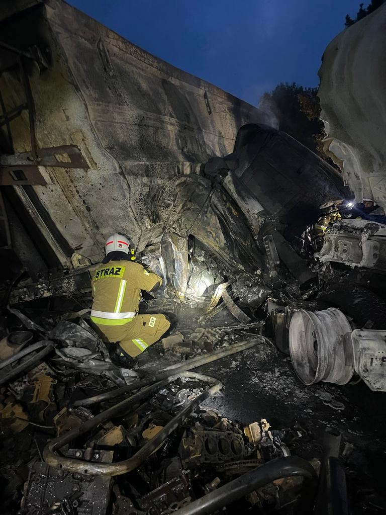 Pożar był rozwinięty, podsycany rozlanym paliwem z uszkodzonego zbiornika oleju napędowego. Ogień obejmował w całości ciągniki siodłowe oraz przednie części naczepy i autocysterny.
