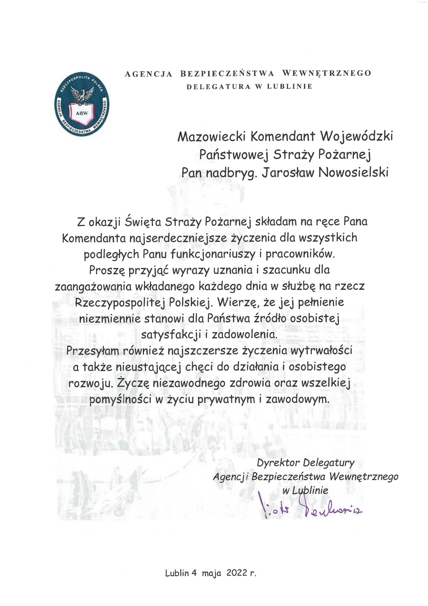 Życzenia Dyrektora Delegatury Agencji Bezpieczeństwa Wewnętrznego w Lublinie z okazji Dnia Strażaka 05.05.2022 Zdjęcia (1) Pokaż zdjęcie 1 z galerii.