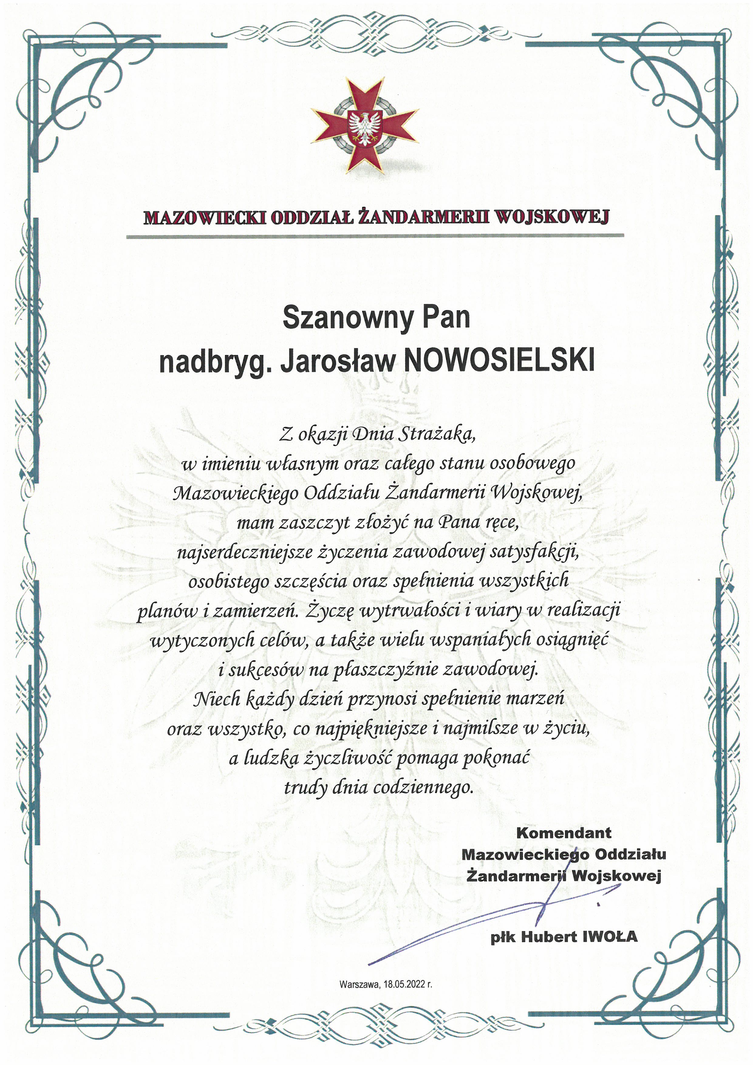 Życzenia Komendanta Mazowieckiego Oddziału Żandarmerii Wojskowej z okazji Dnia Strażaka 19.05.2022 Zdjęcia (1) Pokaż zdjęcie 1 z galerii.