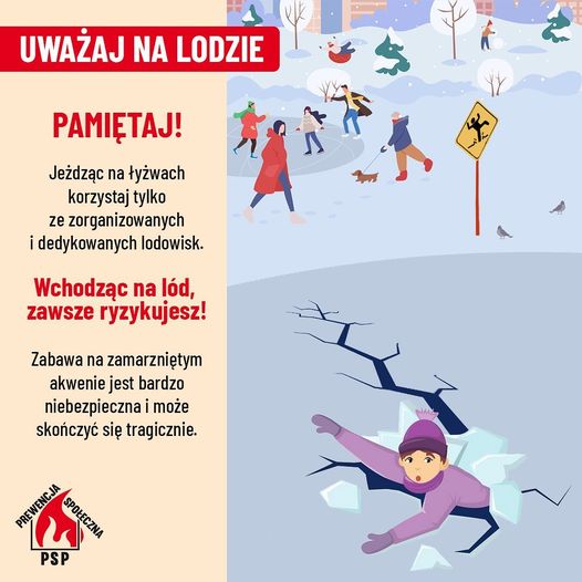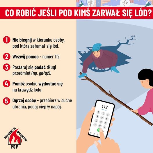 - W przypadku załamania lodu staraj się zachować spokój, jednocześnie głośno wzywając pomocy.