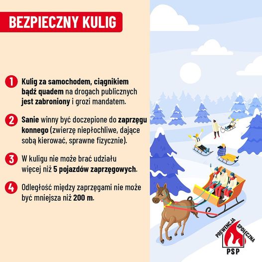 Nie wolno zjeżdżać na sankach w pobliżu drogi ani przywiązywać ich do samochodu czy ciągnika rolniczego. Zorganizowanie w ten sposób kuligu na drogach publicznych jest nie tylko niezgodne z przepisami, ale przede wszystkim jest niebezpieczne dla jego uczestników.