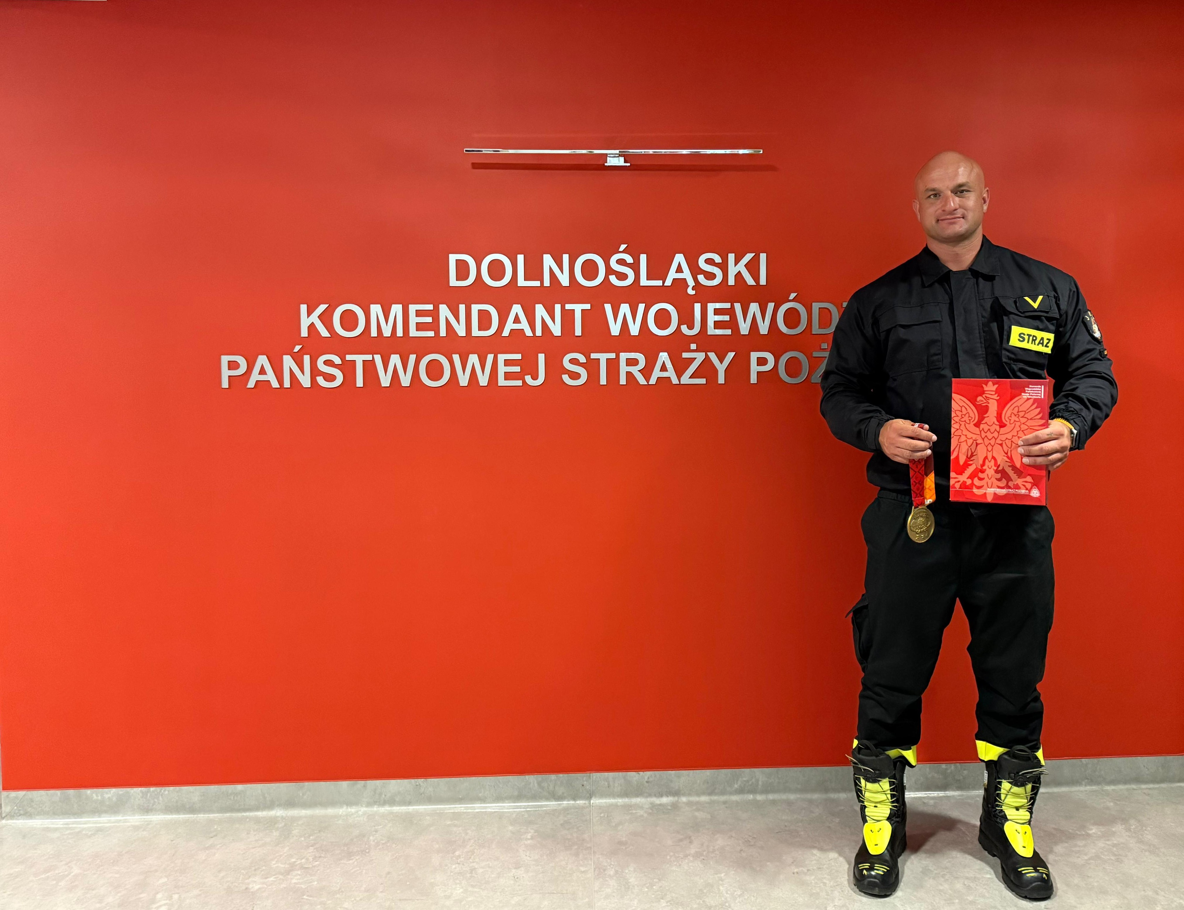 Ogn. Adrian Heidykiewicz z Komendy Powiatowej PSP w Lubaniu wywalczył brązowy medal w wyciskaniu sztangi leżąc, osiągając imponujący wynik 192,5 kg.