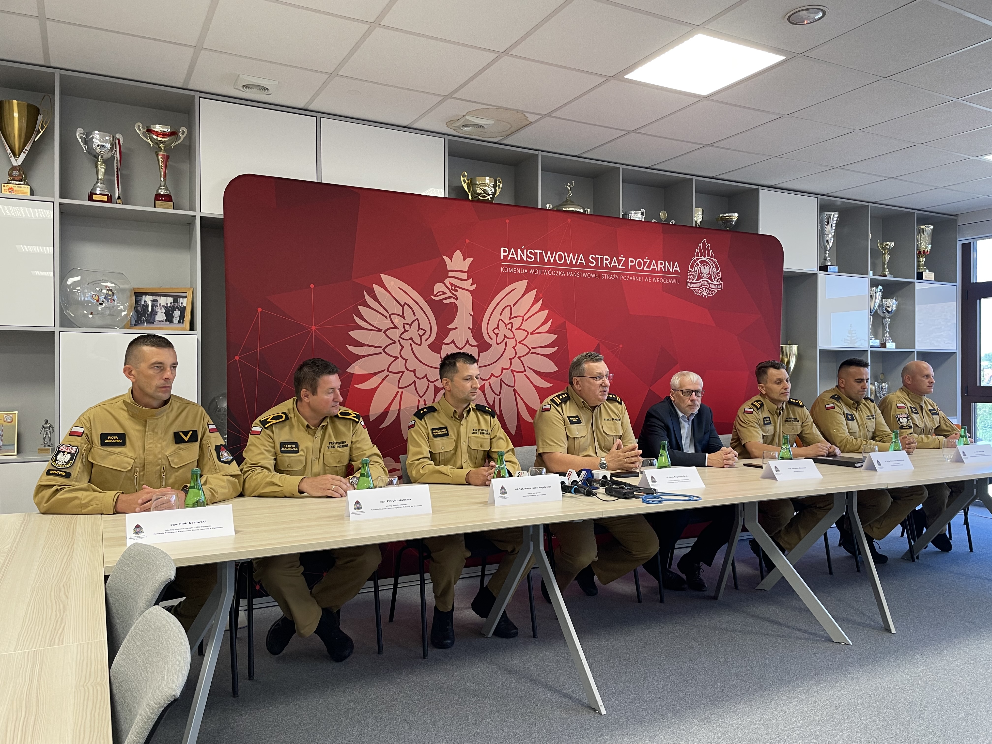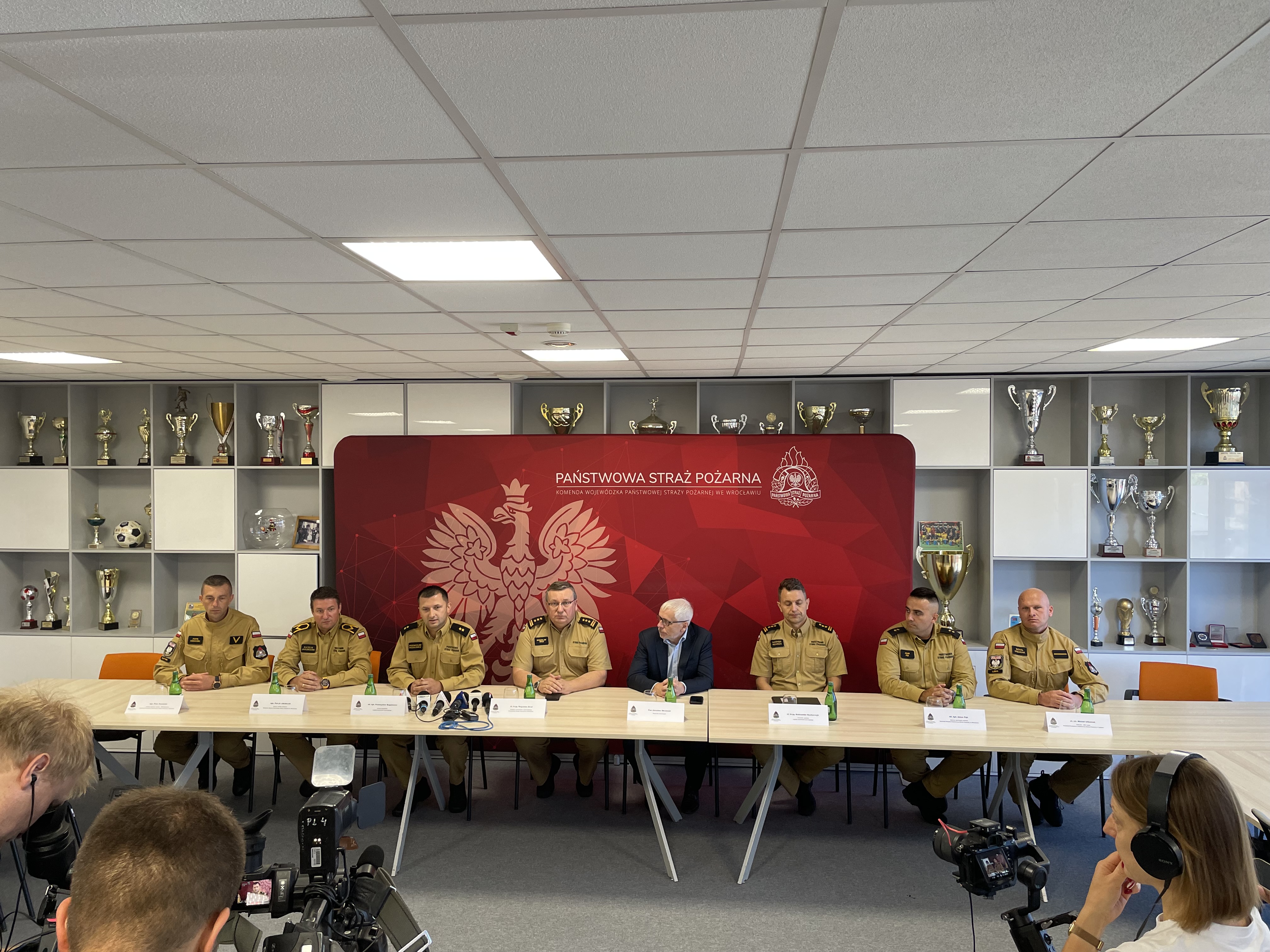 Konferencja prasowa w siedzibie Komendy Wojewódzkiej Państwowej Straży Pożarnej we Wrocławiu. Tematem spotkania było powitanie Dolnośląskich strażaków, którzy wrócili z misji gaśniczej w Grecji.