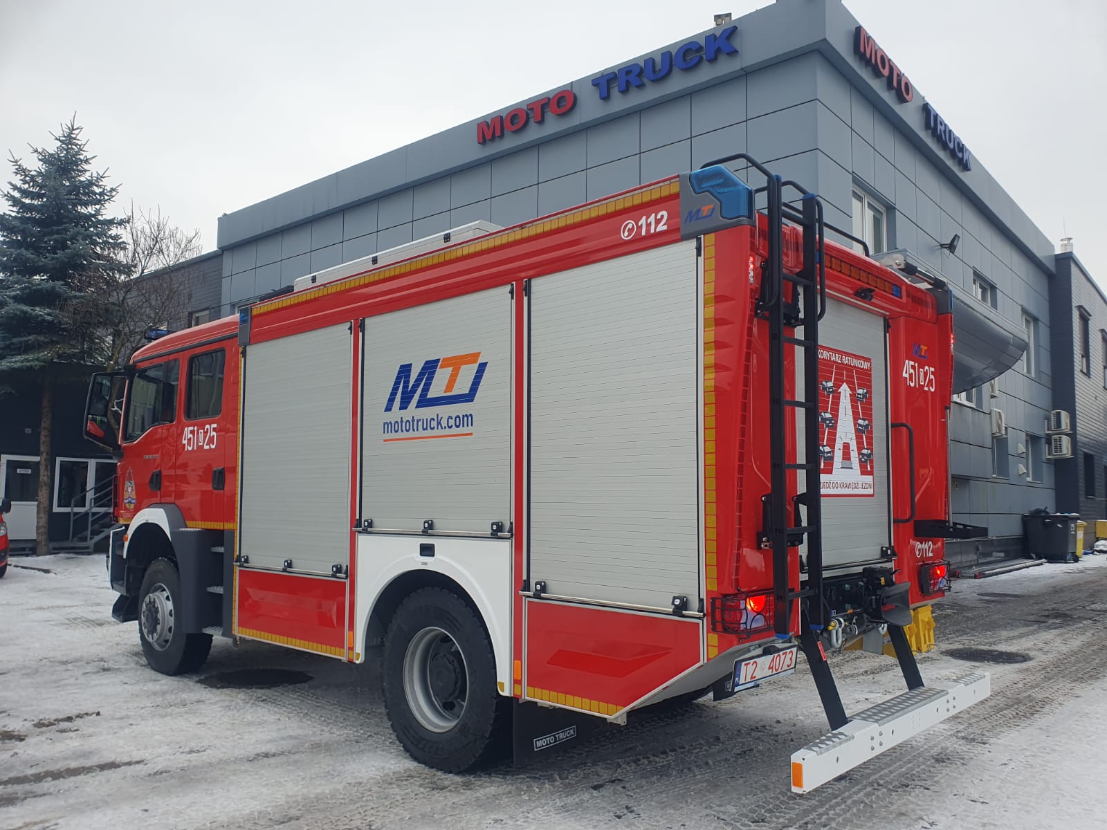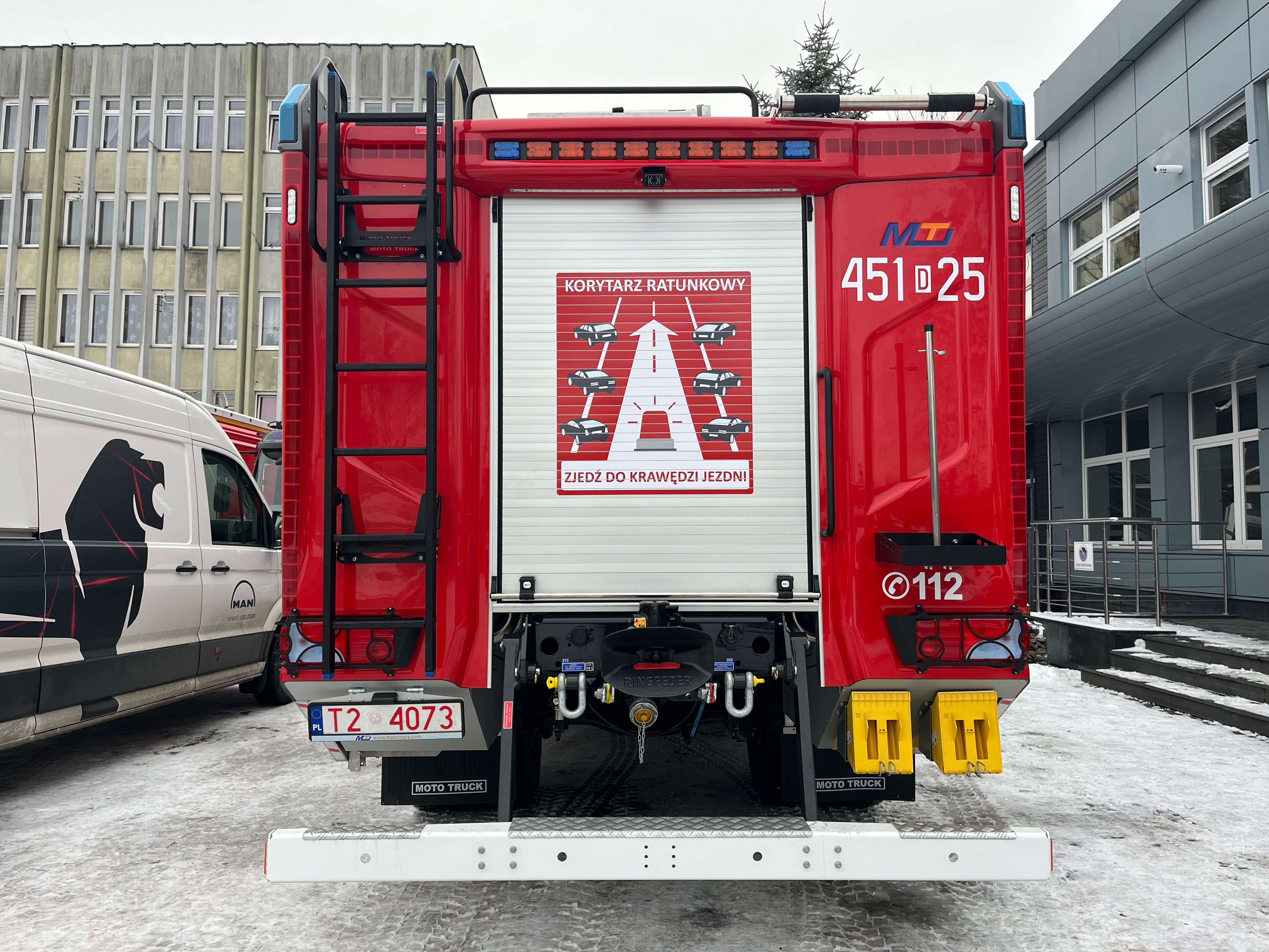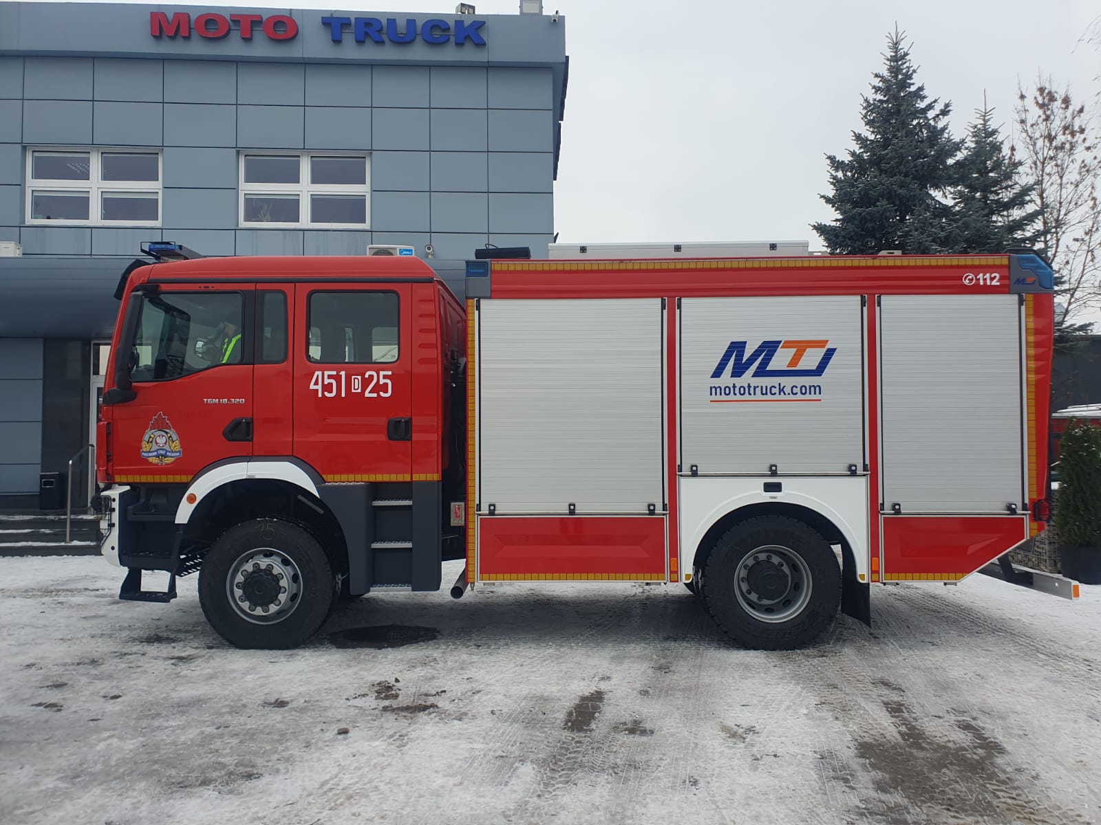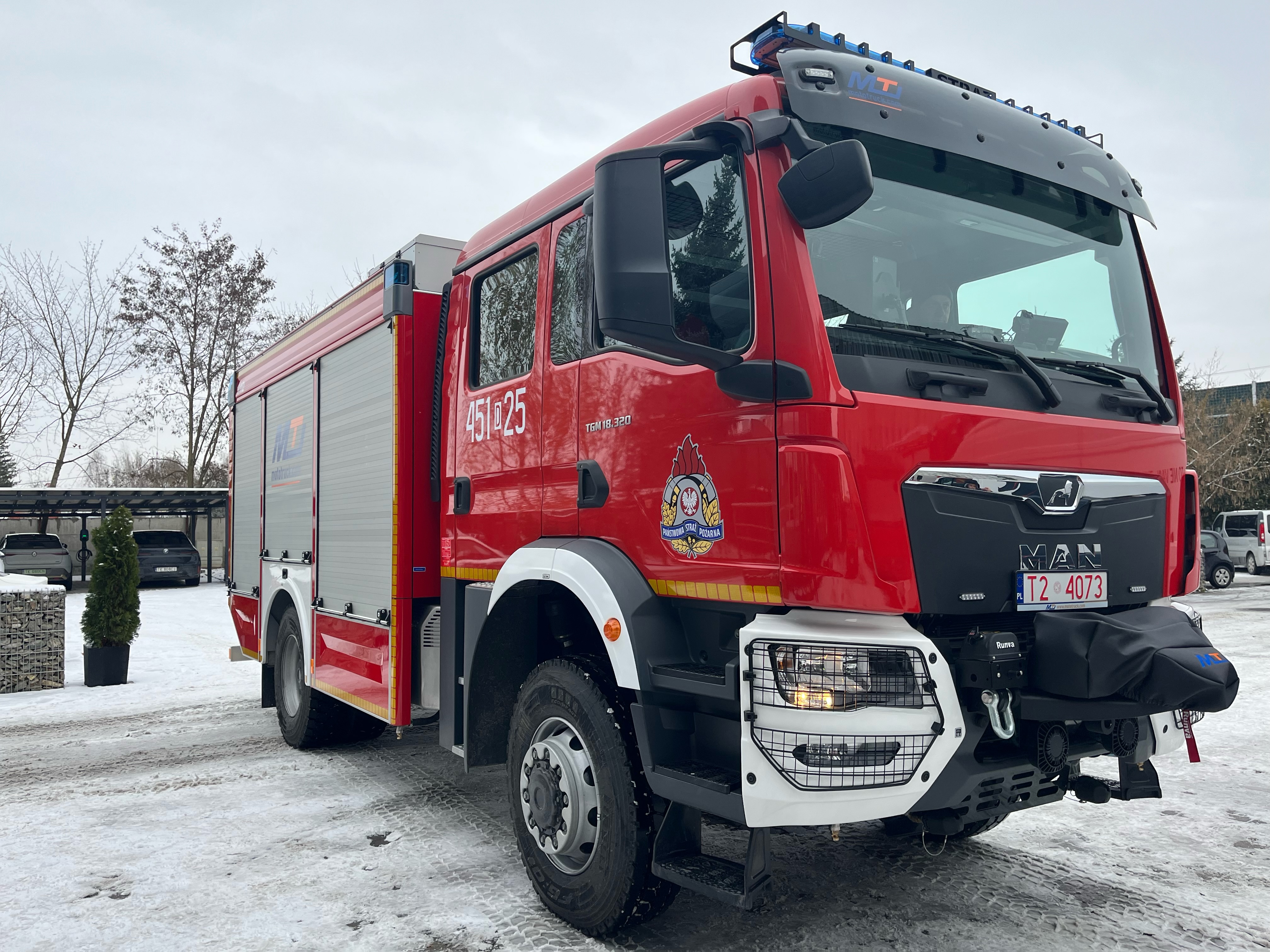 W dniu 30 listopada 2023r. komisja upoważniona przez Dolnośląskiego Komendanta Wojewódzkiego PSP dokonała odbioru faktycznego ciężkiego samochodu ratowniczo-gaśniczego z napędem 4x4 kategorii 2 (uterenowiony), wykonanego na podwoziu MAN model TGM 18.320. Odbiór zrealizowany został w ramach umowy nr WT.2372.382.2023 z dnia 15 września 2023 r., zgodnie ze specyfikacją techniczną.