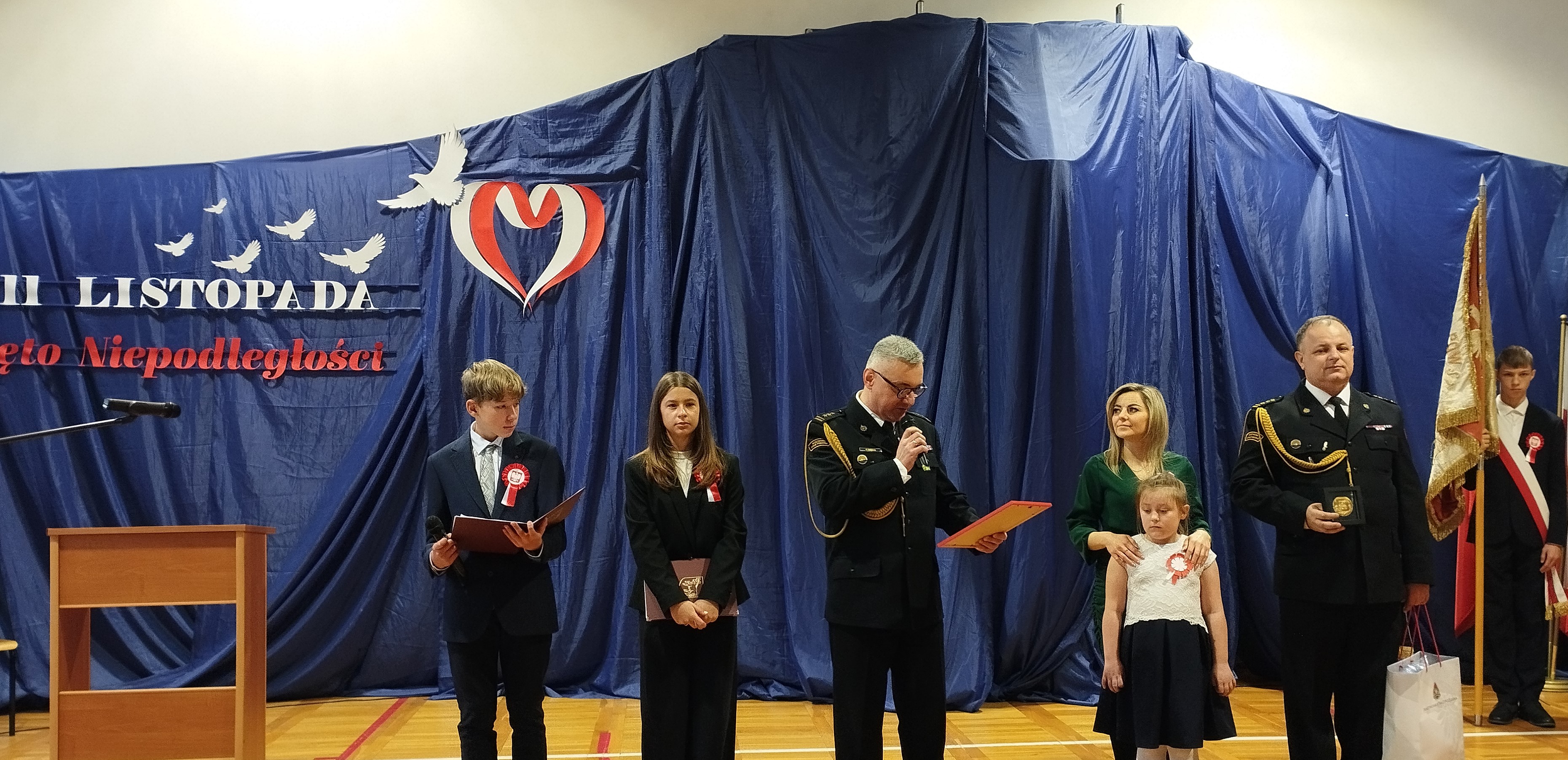 Odznaka „Iuvenis Fotri” została wręczona przez Zastępcę Dolnośląskiego Komendanta PSP st. bryg. Piotra Grzyba oraz Komendanta Powiatowego PSP w Wołowie st. bryg. Jarosława Nadwodnego. Podczas swojego wystąpienia Zastępca Dolnośląskiego Komendanta PSP st. bryg. Piotr Grzyb nawiązując do 106 rocznicy odzyskania przez Polskę niepodległości stwierdził, że „dzięki bohaterom walczącym o wolną Polskę żyjemy w wolnym kraju, a w związku z tym dziś bohater nie nosi zbroi oraz broni. Obecnie bohaterem może zostać każdy, bez względu na wiek. Przykładem bohaterskiej postawy jest wasza koleżanka Weronika, która uratowała życie najbliższej osobie, czyli mamie. Wy też możecie uratować życie nie tylko najbliższym, lecz również innym nieznajomy osobom, będącym w potrzebie poprzez wybranie numeru alarmowego 112. Proszę was o to, abyście nigdy nie przechodzili obojętnie obok osób w potrzebie.” Na zakończenie swojego przemówienia st. bryg. Piotr Grzyb podziękował mamie Weroniki oraz dyrekcji szkoły i nauczycielom za trud włożony w edukację, dotyczącą prawidłowych zachowań w sytuacji zagrożenia zdrowia i życia ludzkiego. Słowa uznania popłynęły również w stronę funkcjonariuszy Komendy Powiatowej PSP w Wołowie za właściwą edukację dzieci i młodzieży w zakresie zagrożeń i prawidłowego reagowania w ramach prowadzonych kampanii społecznych.