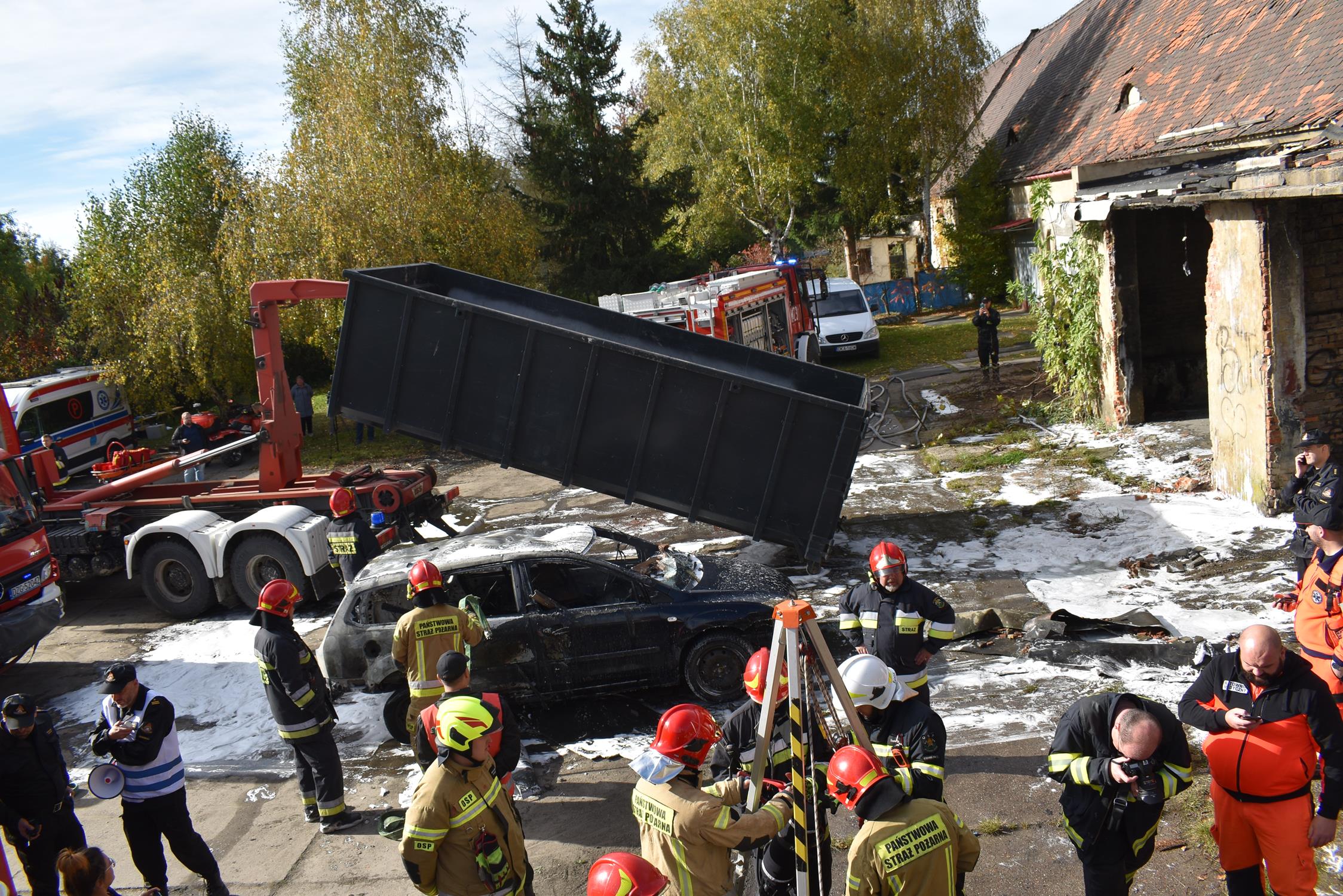 Z kolei drugi epizod „Pożar samochodu z napędem elektrycznym “zakładał zapalenie w warsztacie pojazdu elektrycznego. Ponieważ pożar objął także baterie, które po ugaszeniu mogą być niestabilne ciągle się nagrzewając i grożąc ponownym zapaleniem, pojazd zostanie zanurzony w kontenerze z wodą. Działania strażaków polegały na podaniu prądu piany sprężonej CAFS celem ugaszenia samochodu, ciągłym monitorowaniu temperatury baterii w pojeździe, a następnie zanurzeniu go w kontenerze użyczonym na potrzeby akcji z GPO Bogatynia. W ramach tego epizodu zainscenizowano także wypadek ratownika, który wpadł do studzienki znajdującej się na terenie akcji i wymagał ewakuacji z wykorzystaniem sprzętu ratownictwa wysokościowego.