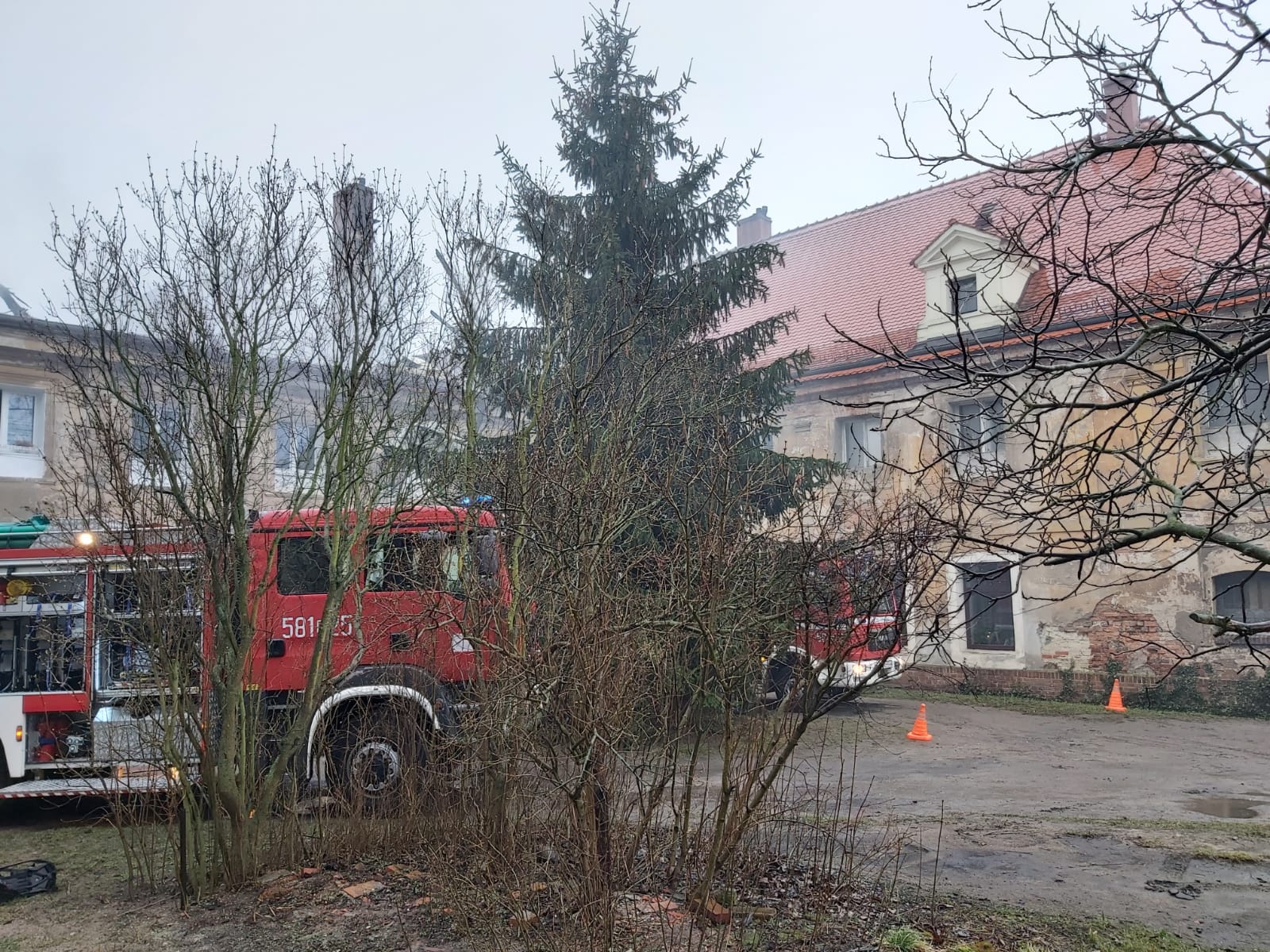 Do pożaru doszło ostatniej nocy w wielorodzinnym dwupiętrowym budynku mieszkalnym znajdującym się na terenie cysterskiego zespołu klasztornego. Kwadrans przed godziną trzecią nad ranem służba dyżurna Stanowiska Kierowania KP PSP w Wołowie, otrzymała informację o pożarze. Krótko potem na miejscu zdarzenia były już pierwsze strażackie zastępy. Na podstawie dokonanego rozpoznania ustalono, że pożarem objęta jest część poddasza budynku oraz mieszkania na pierwszym piętrze. Pożar szybko się rozwijał czemu sprzyjał silny, porywisty wiatr.