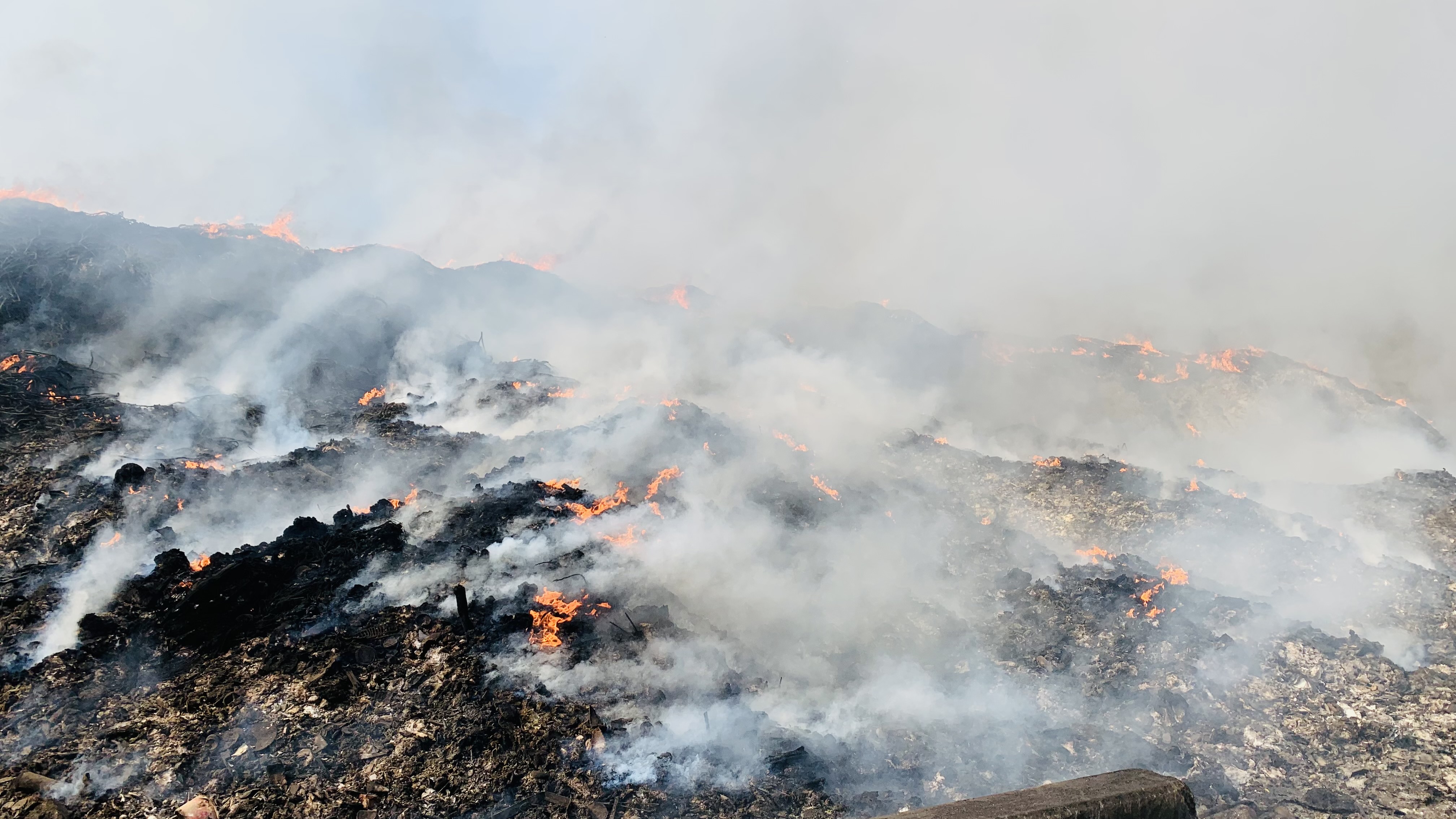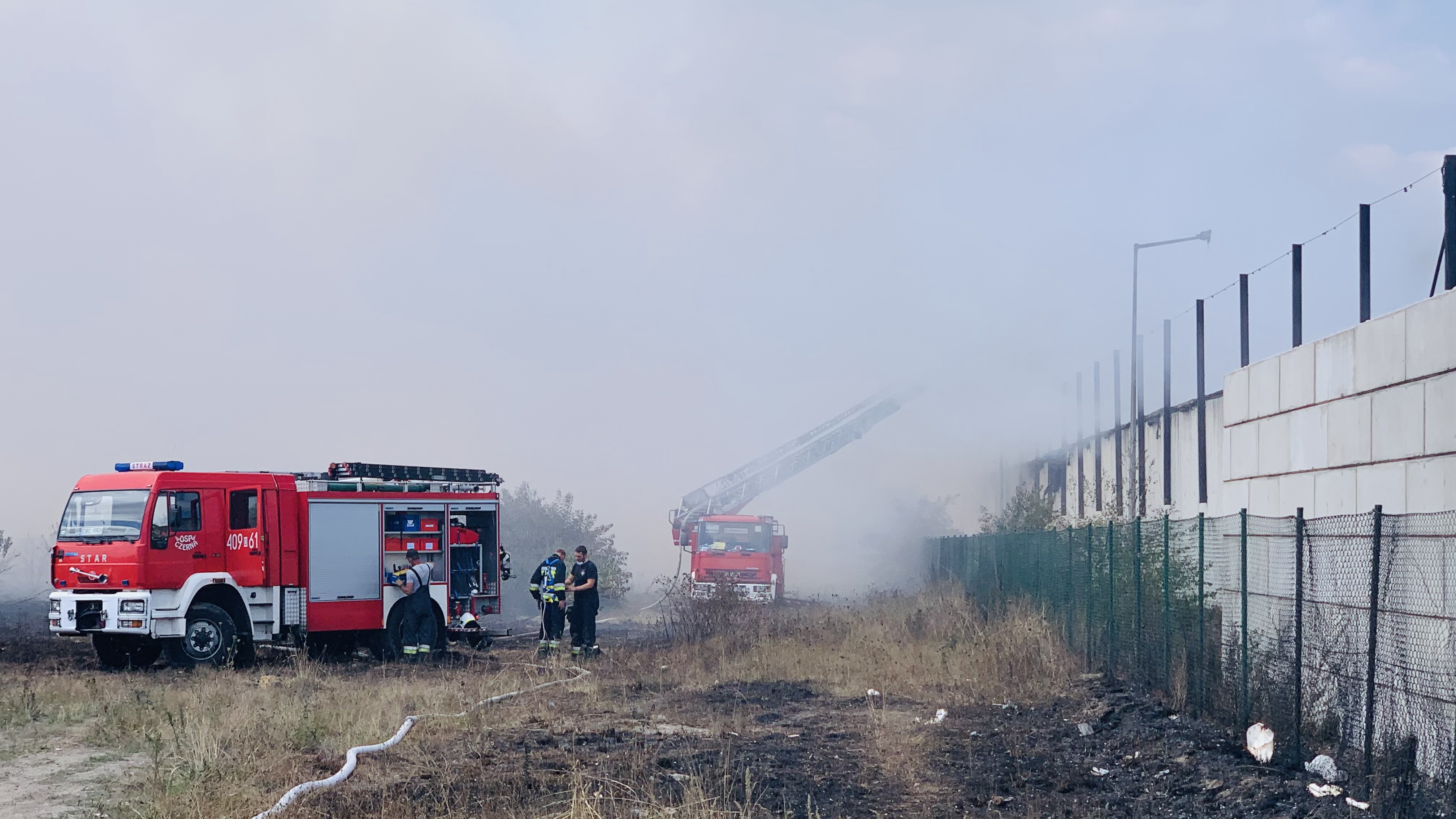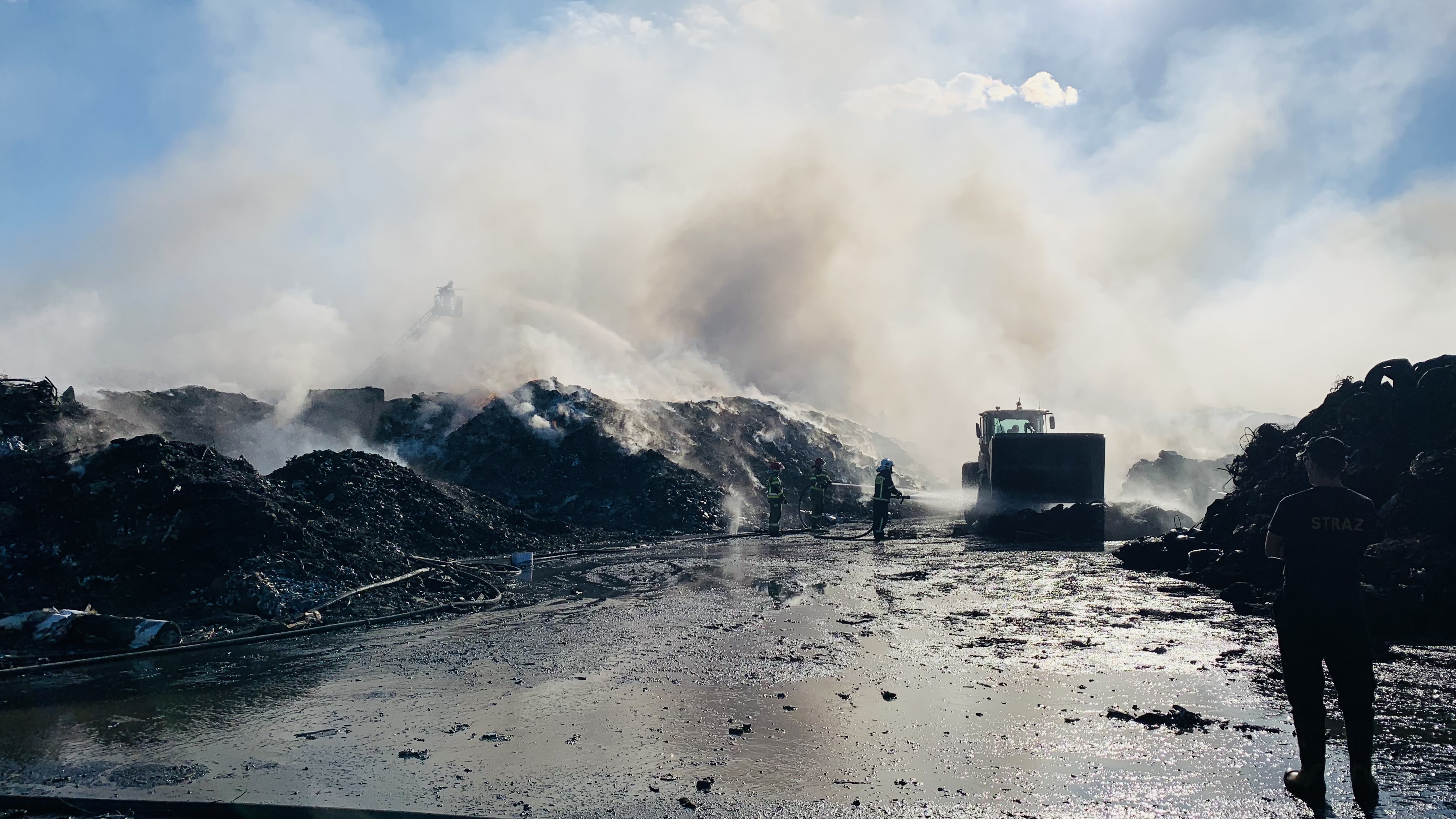 W momencie przybycia na miejsce zdarzenia pierwszych sił i środków stwierdzono, że pożarem objęty jest cały teren zakładu- około 2,5 h (dwie hale produkcyjne oraz pryzmy odpadów przygotowanych do ponownego przetworzenia).