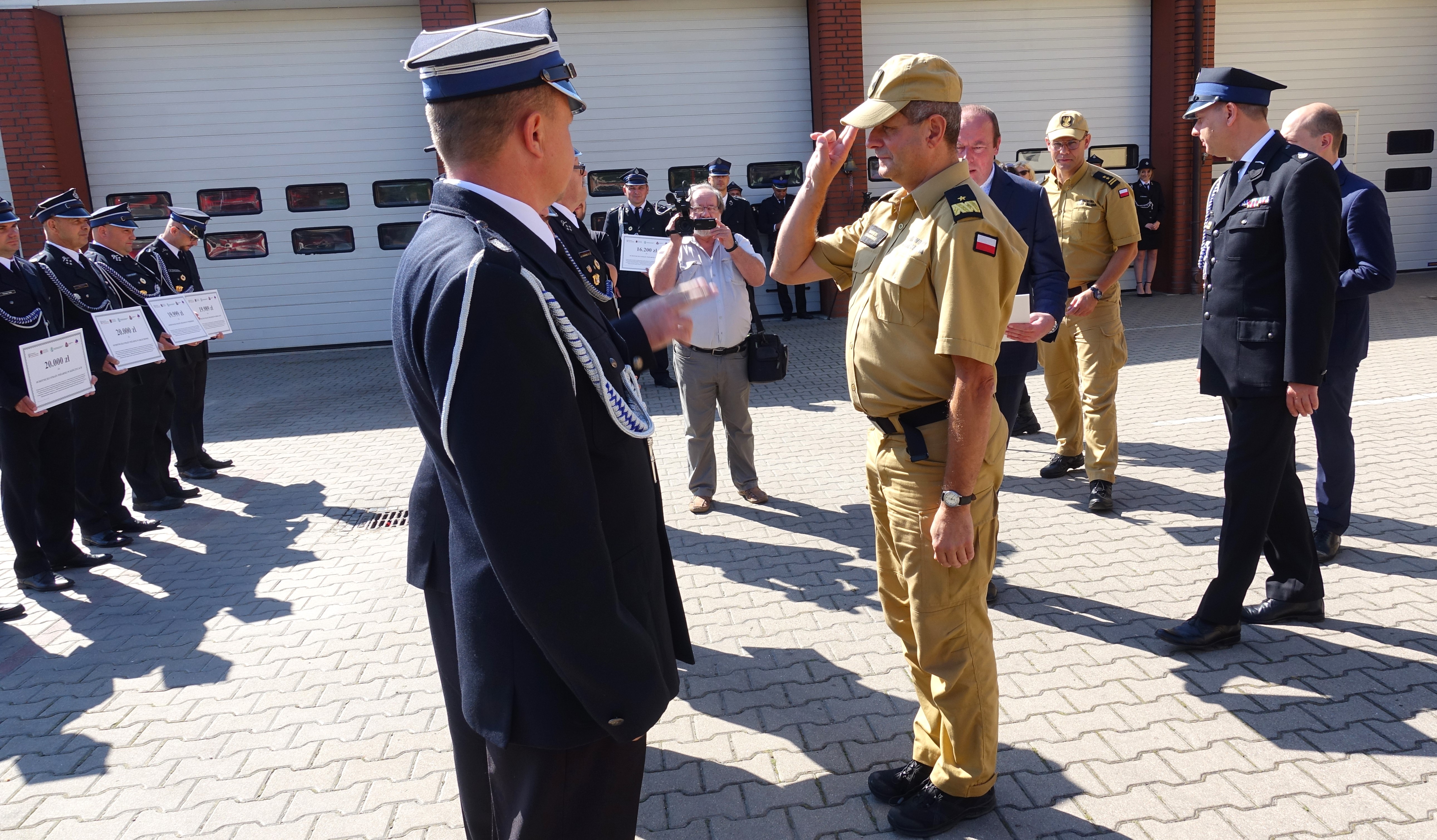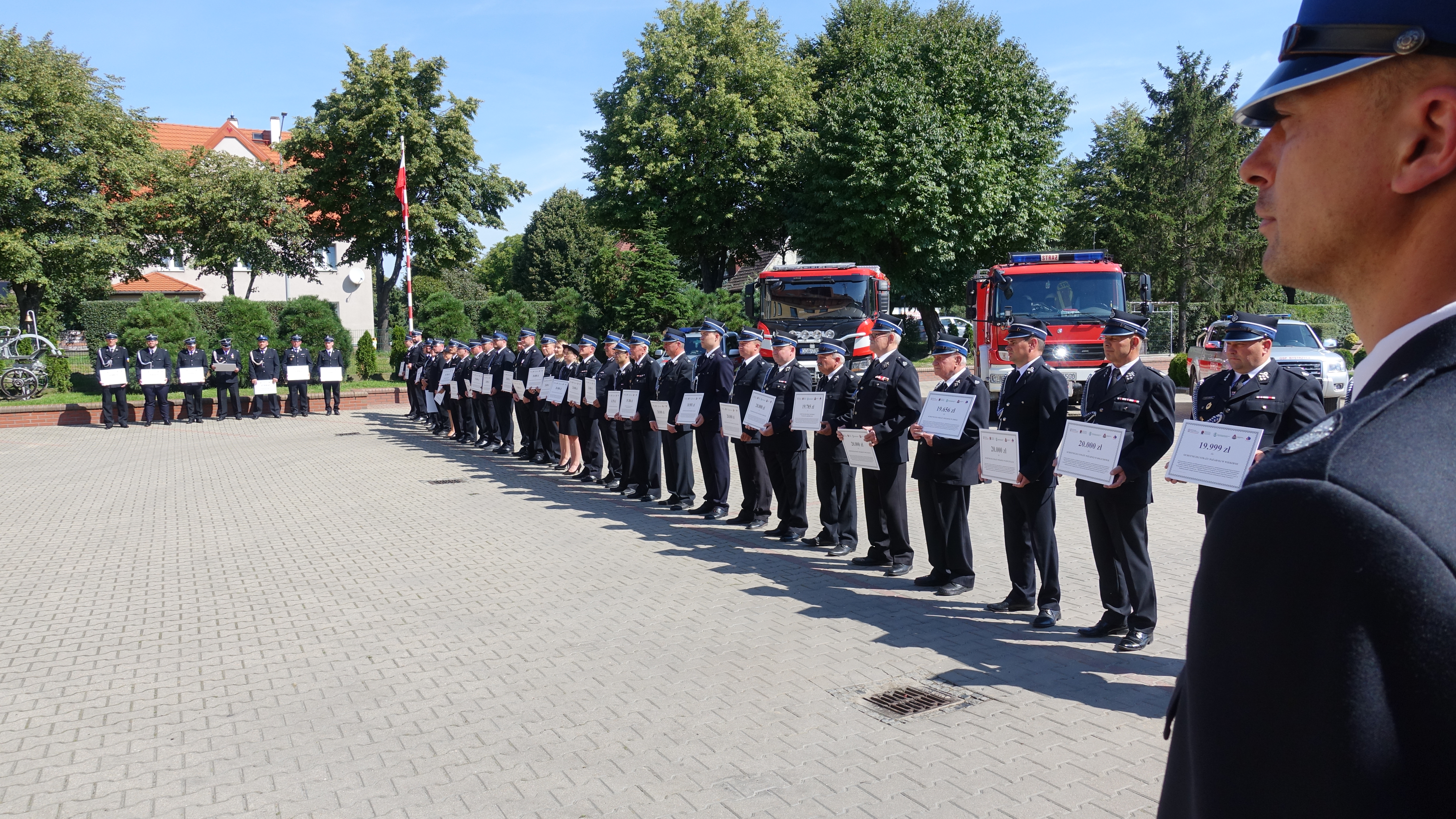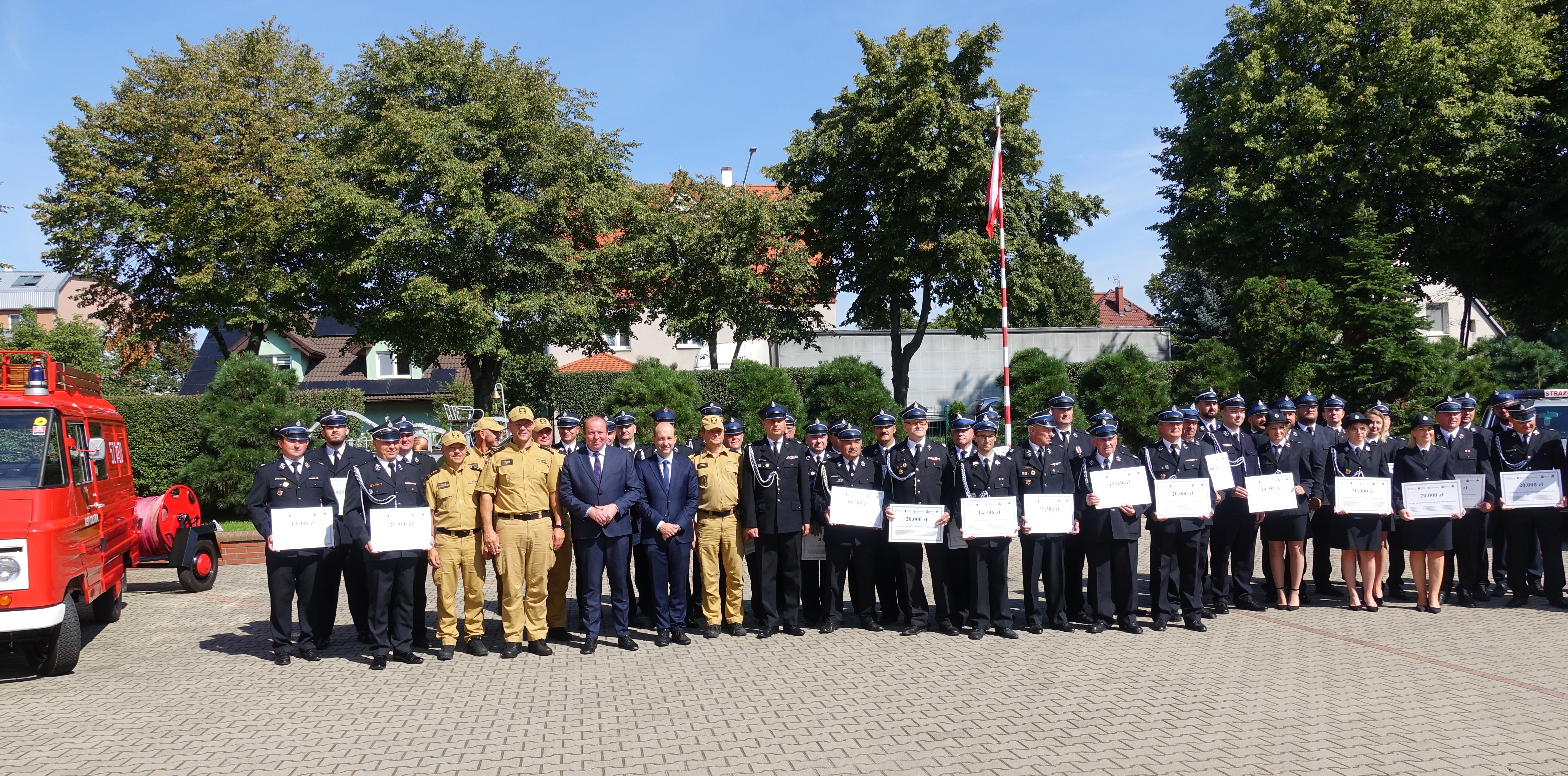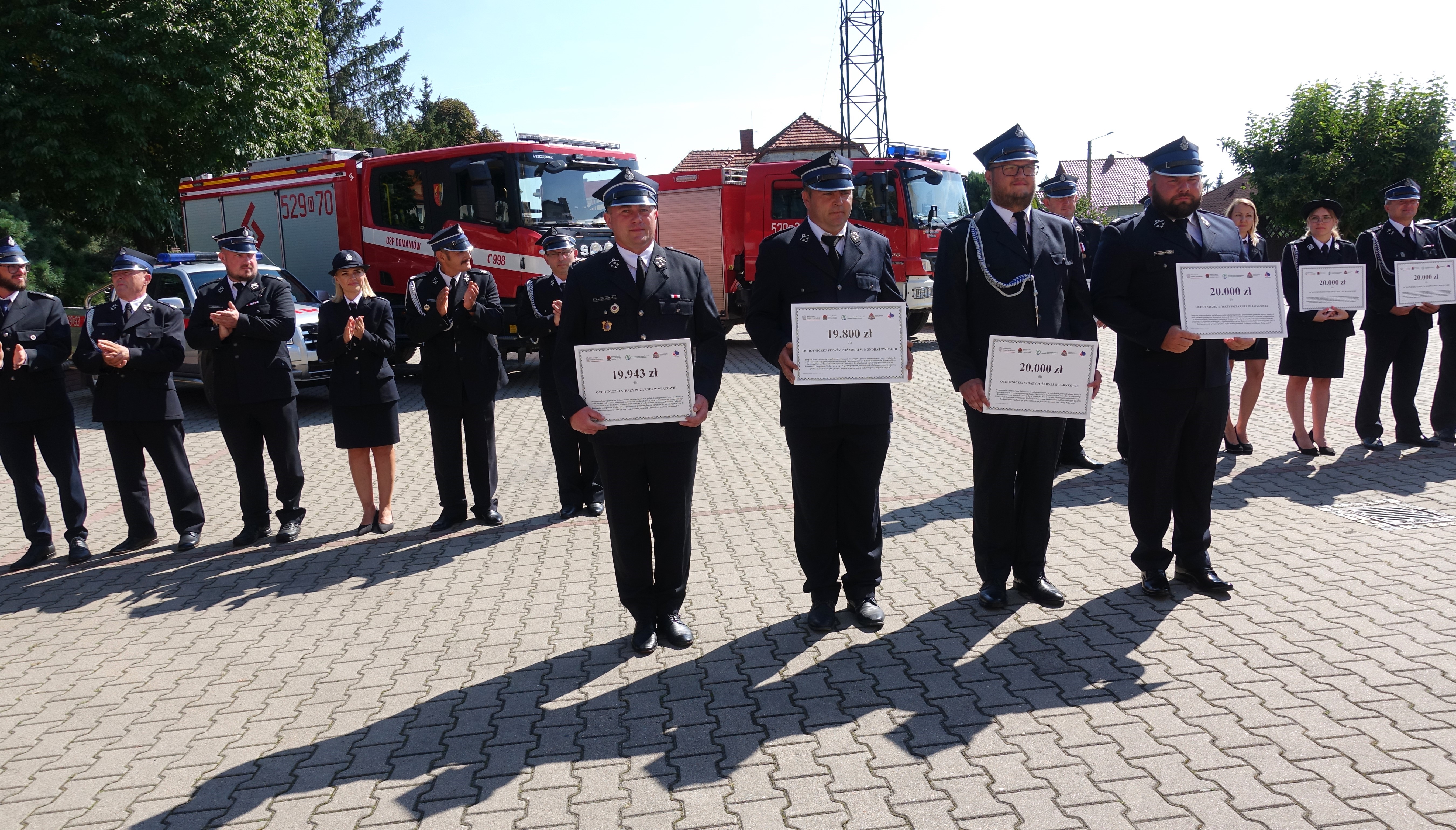 We wczorajszej zbiórce uczestniczyli: Pan Paweł Hreniak Poseł na Sejm Rzeczypospolitej Polskiej, Przewodniczący Podkomisji Stałej do spraw rozwoju i promocji OSP; Pan Łukasz Kasztelowicz Prezes Zarządu Wojewódzkiego Funduszu Ochrony Środowiska i Gospodarki Wodnej we Wrocławiu wraz z zastępcą prezesa Panem Bartłomiejem Wiązowskim; nadbrygadier Marek Kamiński dolnośląski komendant wojewódzki Państwowej Straży Pożarnej, brygadier Michał Pięta zastępca komendanta wojewódzkiego Państwowej Straży Pożarnej we Wrocławiu, prezesi, naczelnicy oraz reprezentanci ochotniczych straży pożarnych, którzy podczas dzisiejszej uroczystości odbierali czeki okolicznościowe oraz komendanci z trzech powiatów otrzymujących promesy.