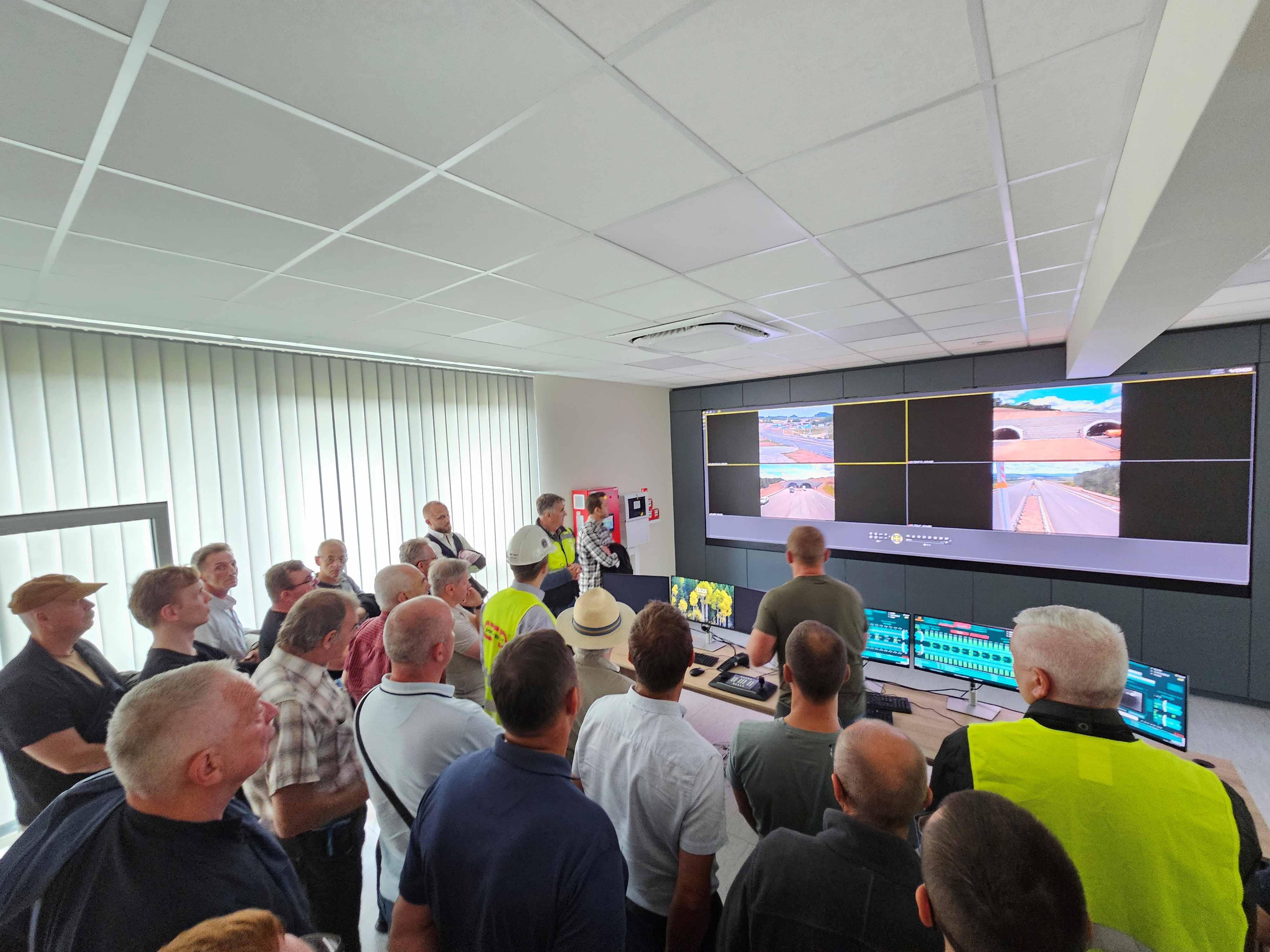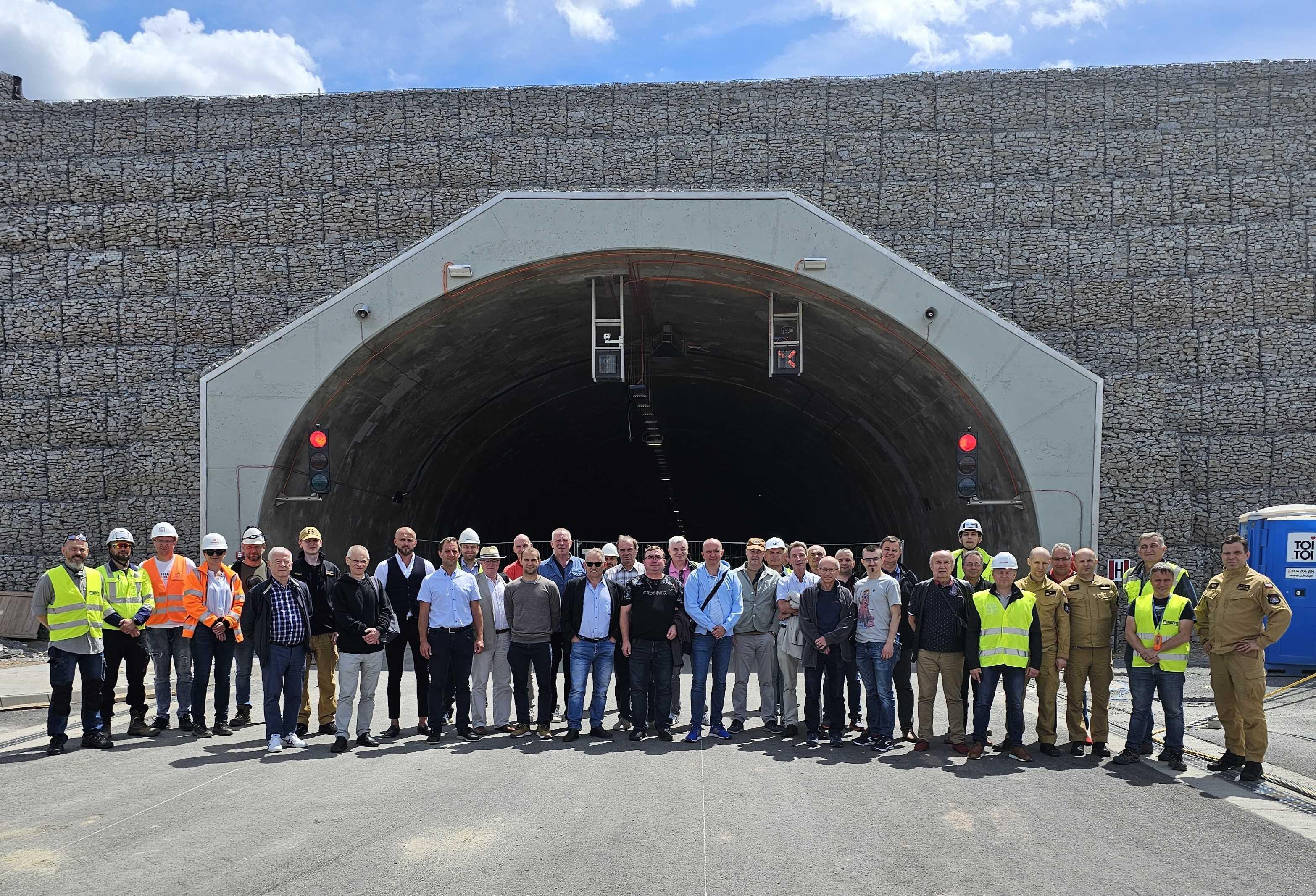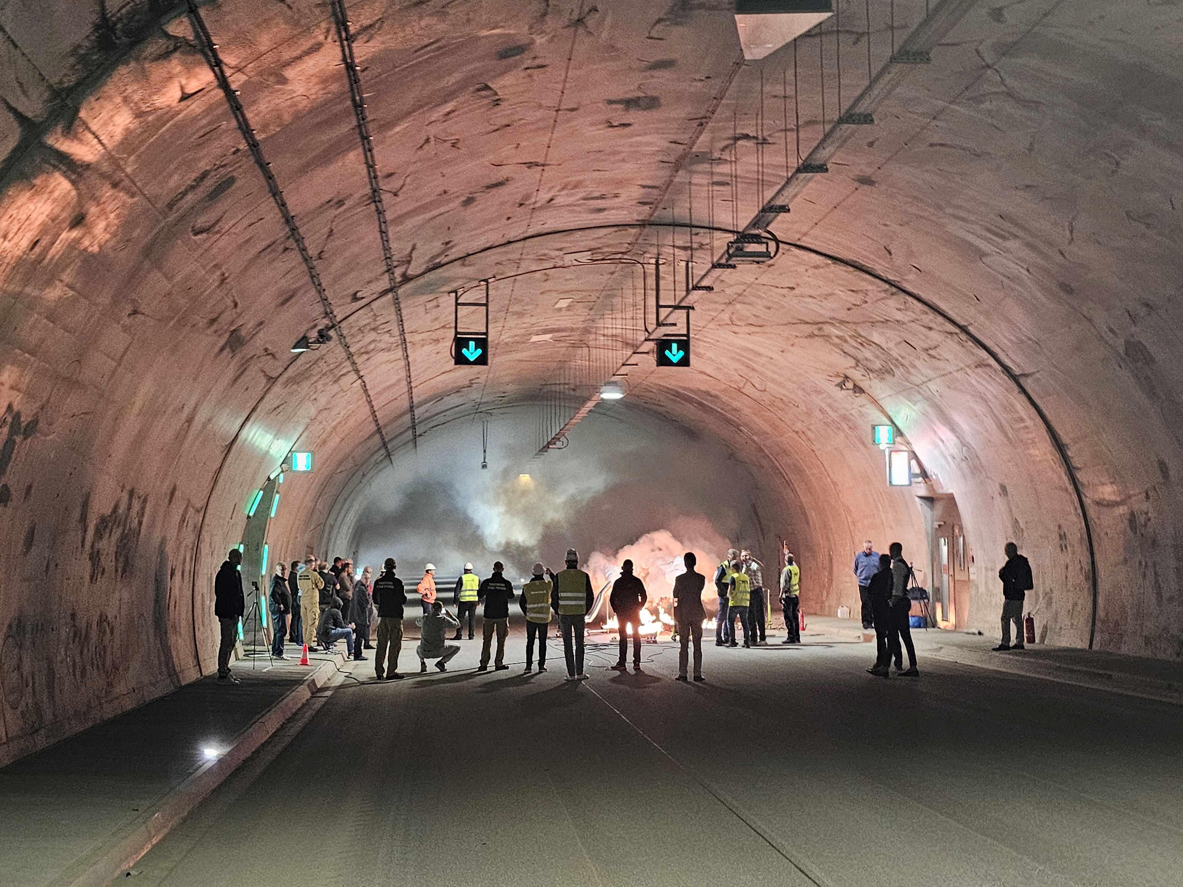 Po części teoretycznej przyszła pora na równie ciekawą część warsztatową. Uczestnicy szkolenia mieli okazję zapoznać się z możliwościami zarządzania ruchem w tunelu TS-32 oraz ręcznego i automatycznego sterowania zastosowanymi urządzeniami przeciwpożarowymi jak i technicznymi środkami zabezpieczenia przeciwpożarowego. Punktem kulminacyjnym zwiedzania tunelu był udział w teście realizacji scenariusza pożarowego przy użyciu gorącego dymu.