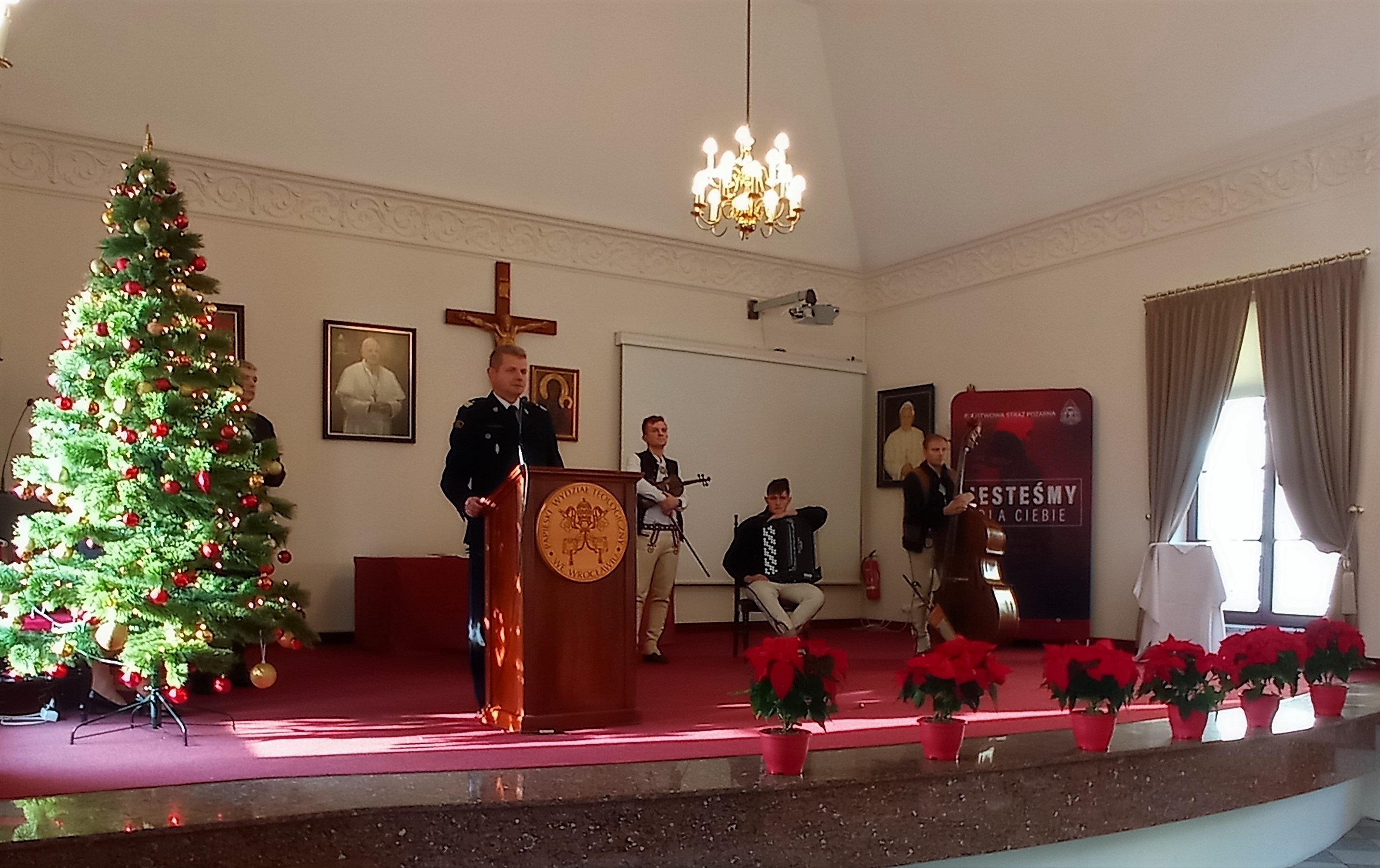 Generał Kamiński w okolicznościowym wystąpieniu przywitał wszystkich przybyłych oraz podziękował służbom i instytucjom, z którymi współpracuje Państwowa Straż Pożarna, za ich wsparcie i nieocenioną pomoc, a także funkcjonariuszom i pracownikom Komendy Wojewódzkiej PSP we Wrocławiu za ich zaangażowanie i ciężką całoroczną służbę i pracę. Życzył również świąt spokojnych, bezpiecznych i pełnych rodzinnego ciepła.
