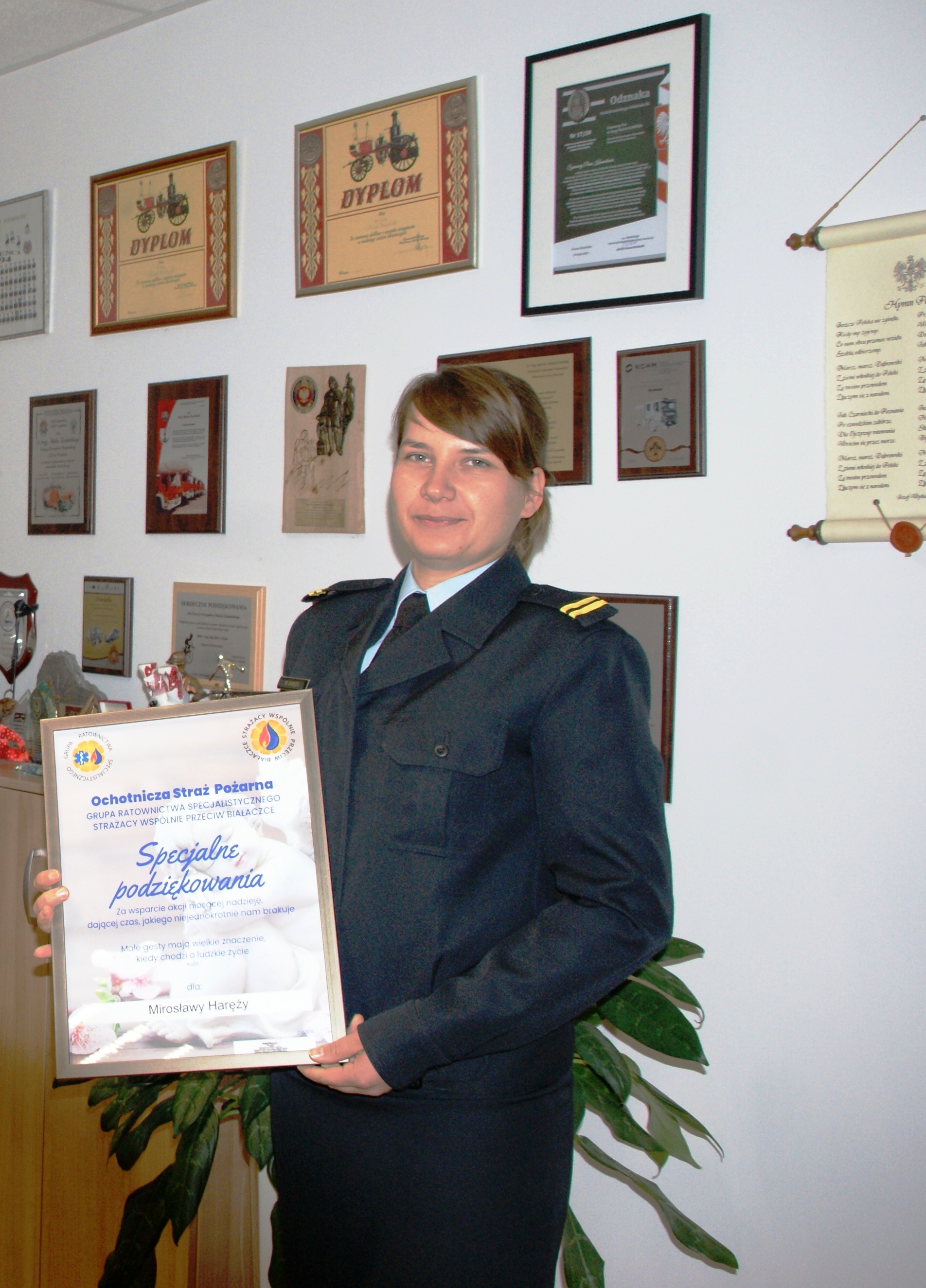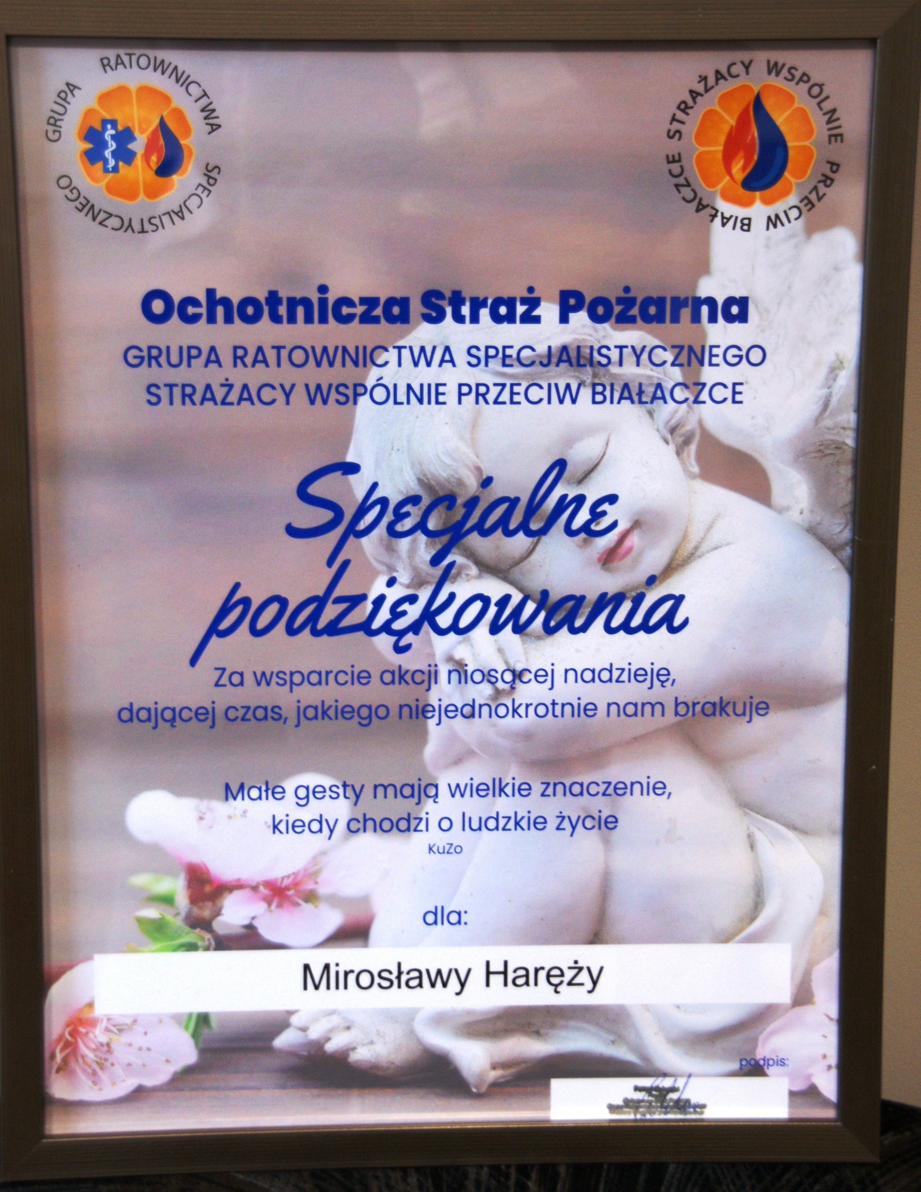 Była to niewątpliwie uroczystość wyjątkowa i nietypowa, choć, jak się okazuje, w pełni uzasadniona istniejącymi okolicznościami. Dolnośląski Komendant Wojewódzki PSP st. bryg. Marek Kamiński, w towarzystwie naczelnika Wydziału Kontrolno – Rozpoznawczego st. bryg. Rafała Lika, przekazał (31 sierpnia 2021 r.) funkcjonariuszce KW PSP we Wrocławiu sekc. mgr inż. Mirosławie Haręży dwa dyplomy uznania. Zostały one przyznane przez OSP Grupę Ratownictwa Specjalistycznego Strażacy Wspólnie przeciw Białaczce w dowód uznania dla sekc. Mirosławy Haręży oraz Gminnej Orkiestry Dętej przy OSP w Czajkowie.