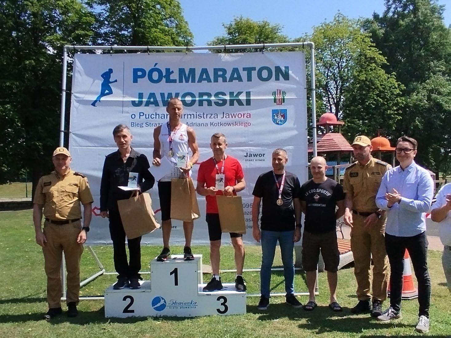 Najlepszych biegaczy nagradzał tato Adriana Kotkowskiego pan Andrzej Kotkowski wraz z Komendantem Powiatowym kpt. Mirosławem Walaszczykiem, Zastępcą Komendanta Powiatowego mł. kpt. Łukaszem Fuławka oraz Starostą Jaworskim Michałem Banderem wraz z Prezesem TKKF Jaworzanie panem Janem Czekielem.