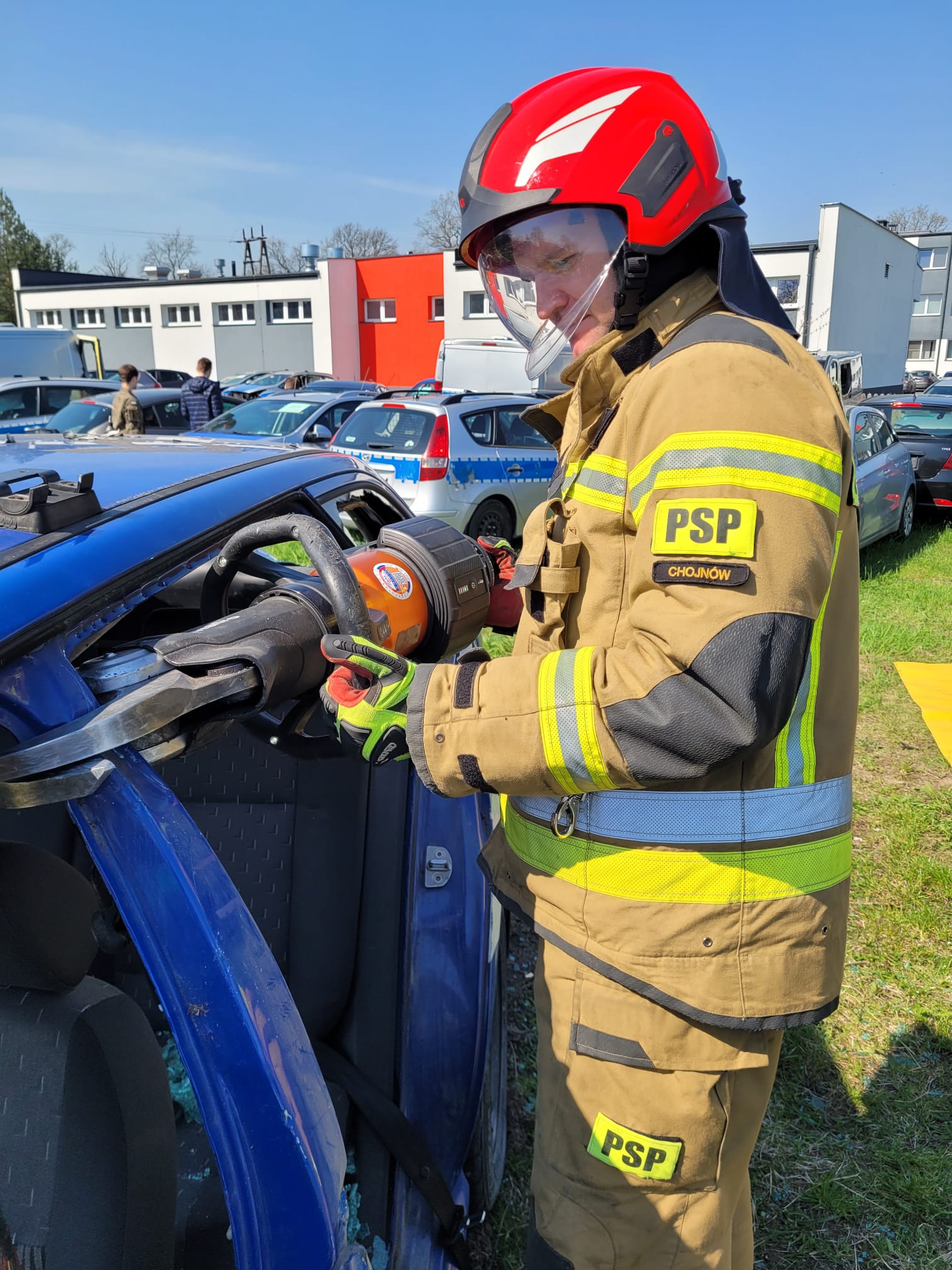 w pojazdach. Systemy bezpieczeństwa biernego pojazdów (np. poduszki powietrzne, kurtyny, napinacze pasów, łamana kolumna kierownicza). Oznakowanie pojazdu wskazujące źródło napędu. Karty ratownicze. - Sprzęt wykorzystywany w działaniach w transporcie drogowym i szynowym - sprzęt do znakowania i zabezpieczenia terenu akcji. Sprzęt stosowany do stabilizacji pojazdów (zestawy klinów, drewno, podpory mechaniczne, drabiny, pasy, wyciągarki). Sprzęt stosowany do cięcia, rozpierania i odginania elementów konstrukcyjnych w pojazdach (nożyce, cylindry rozpierające, rozpieracz ramieniowy, rozpieracz kolumnowy). Sprzęt stosowany do unoszenia (poduszki nisko- i wysokociśnieniowe). Agregaty zasilające. Zasady bezpieczeństwa podczas pracy poszczególnymi rodzajami sprzętu. Konserwacja sprzętu.