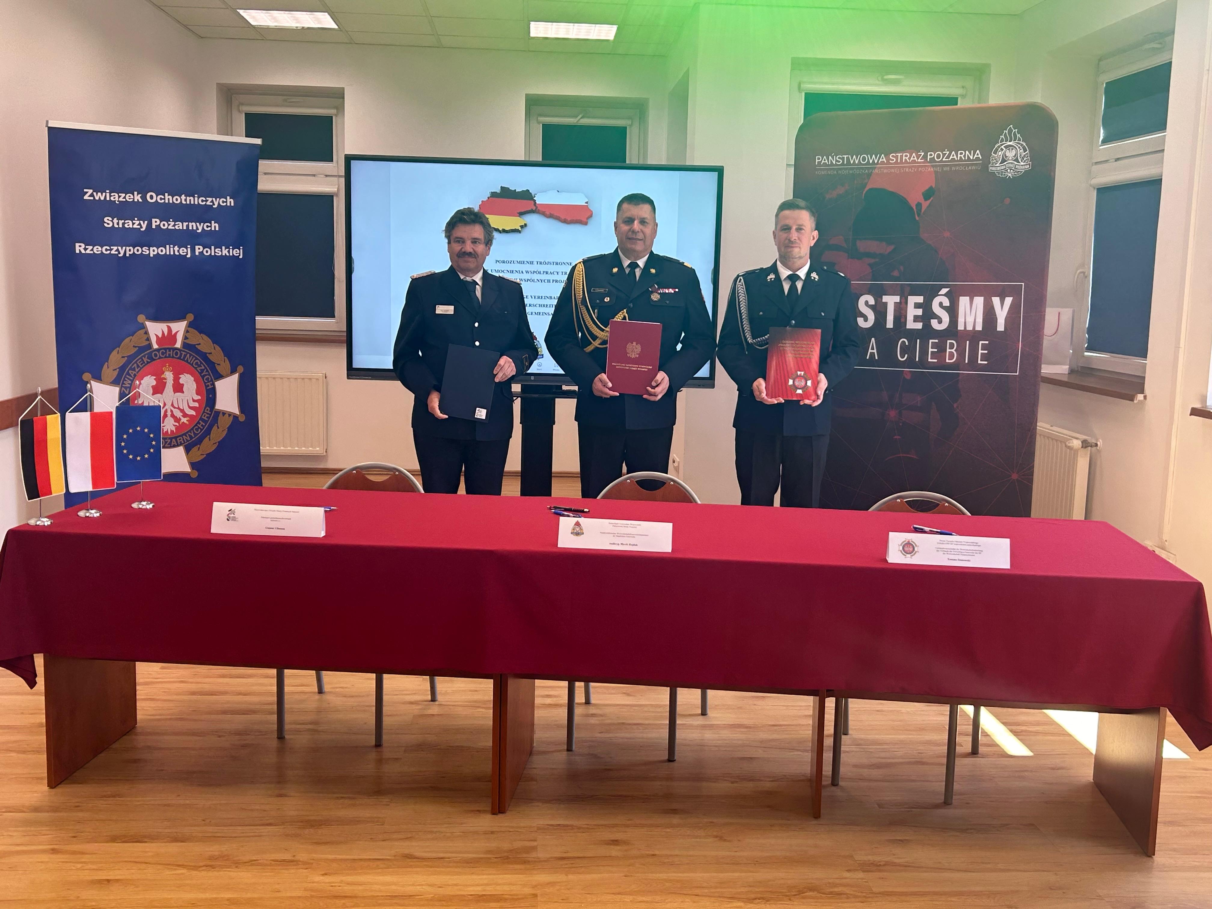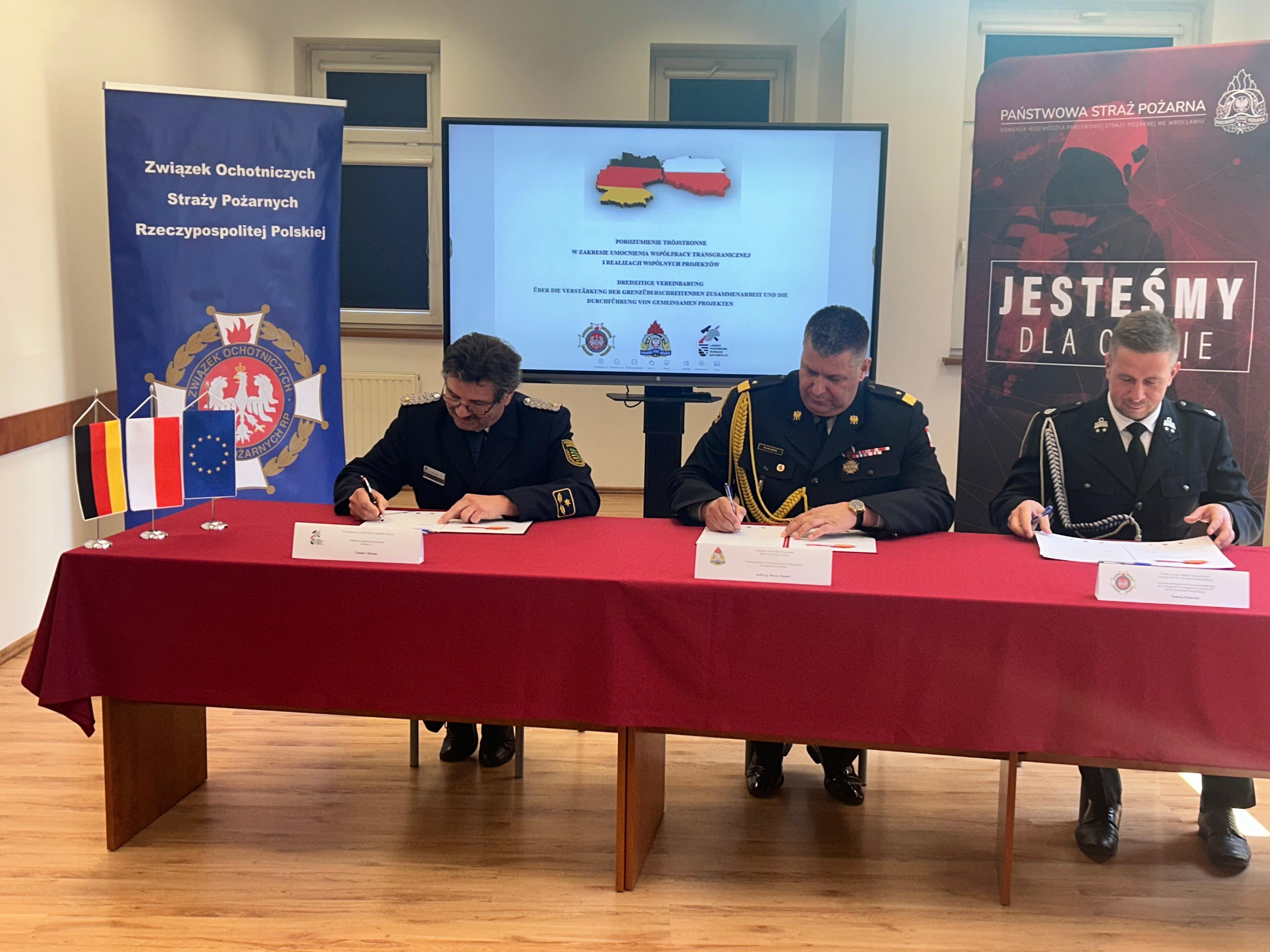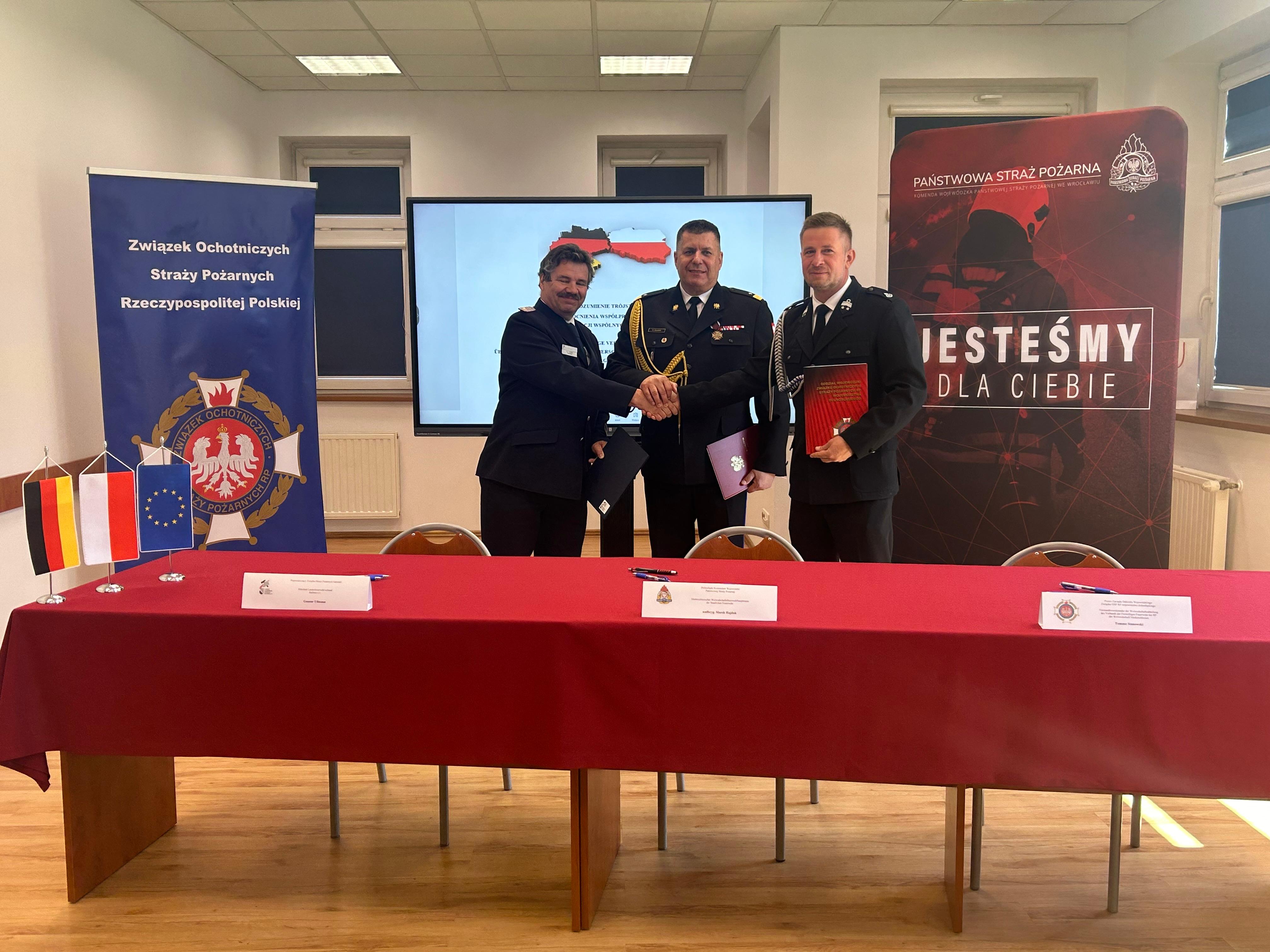 Nadbryg. Marek Hajduk – Dolnośląski Komendant Wojewódzki PSP, Gert Schöbel – Wiceprezydent Saksońskiego Związku Straży oraz Tomasz Stanowski – Prezes Zarządu Oddziału Wojewódzkiego ZOSP RP woj. dolnośląskiego, wspólnie podpisali zawarcie porozumienia mającego na celu pogłębienie współpracy pomiędzy Polską a Niemcami.