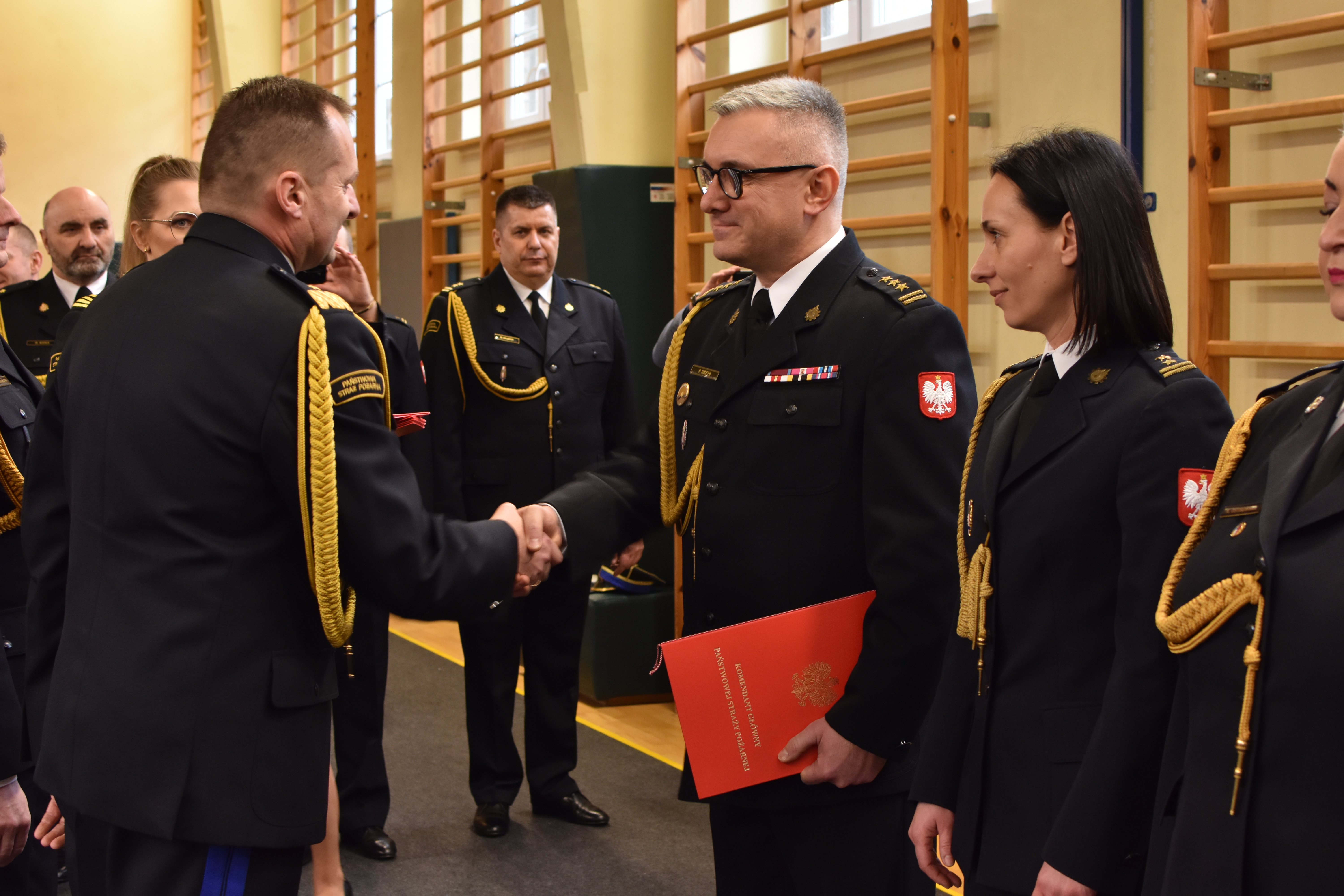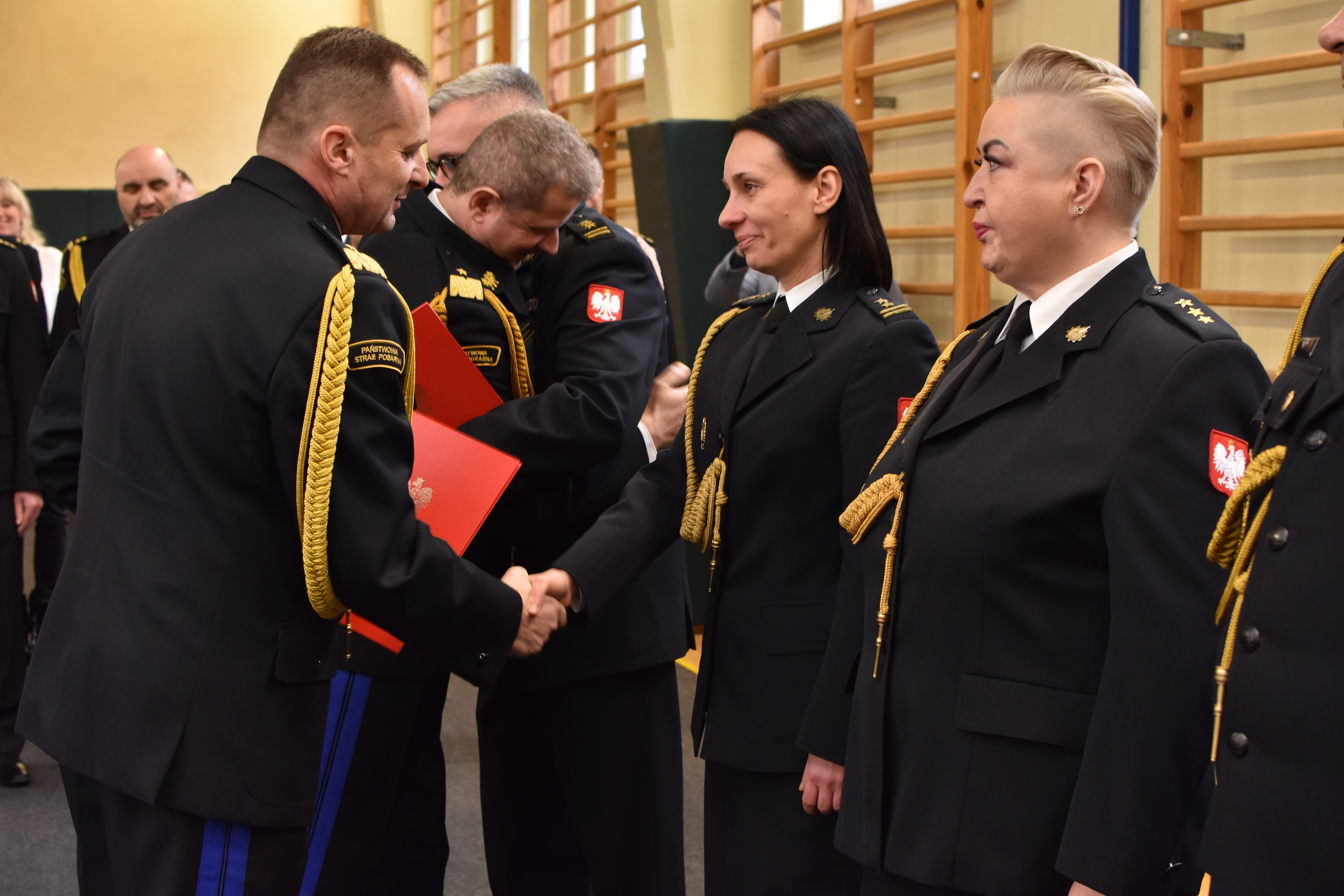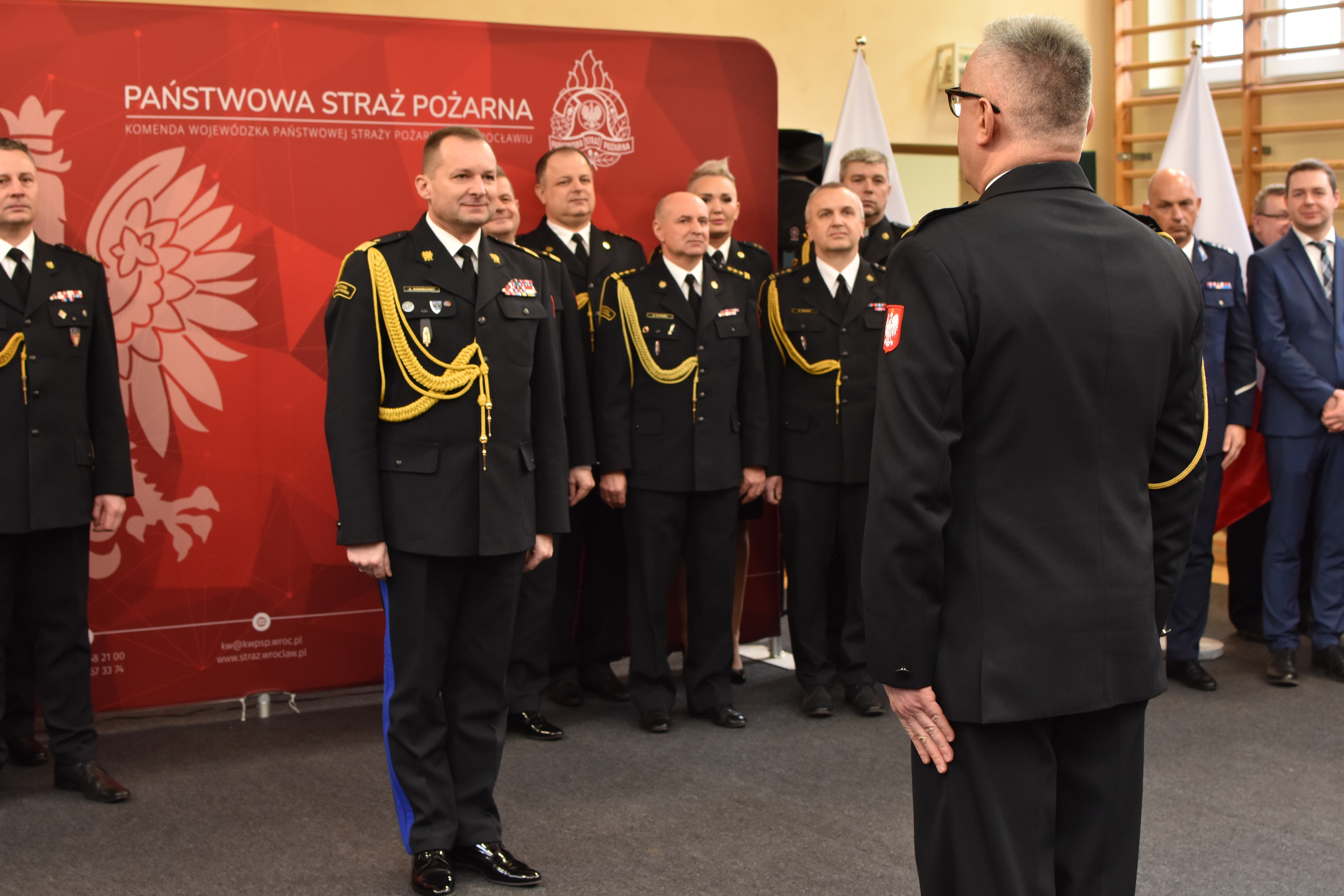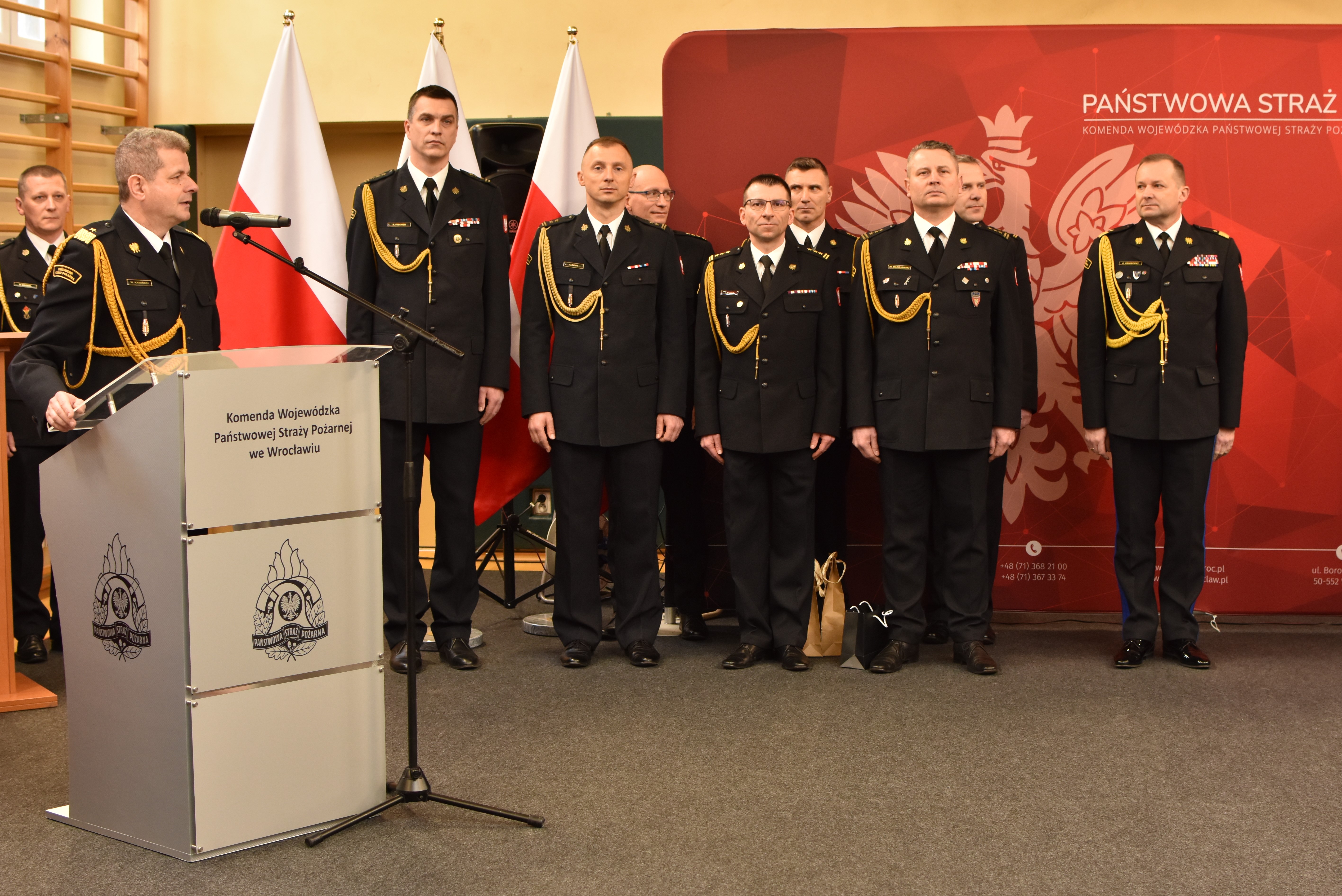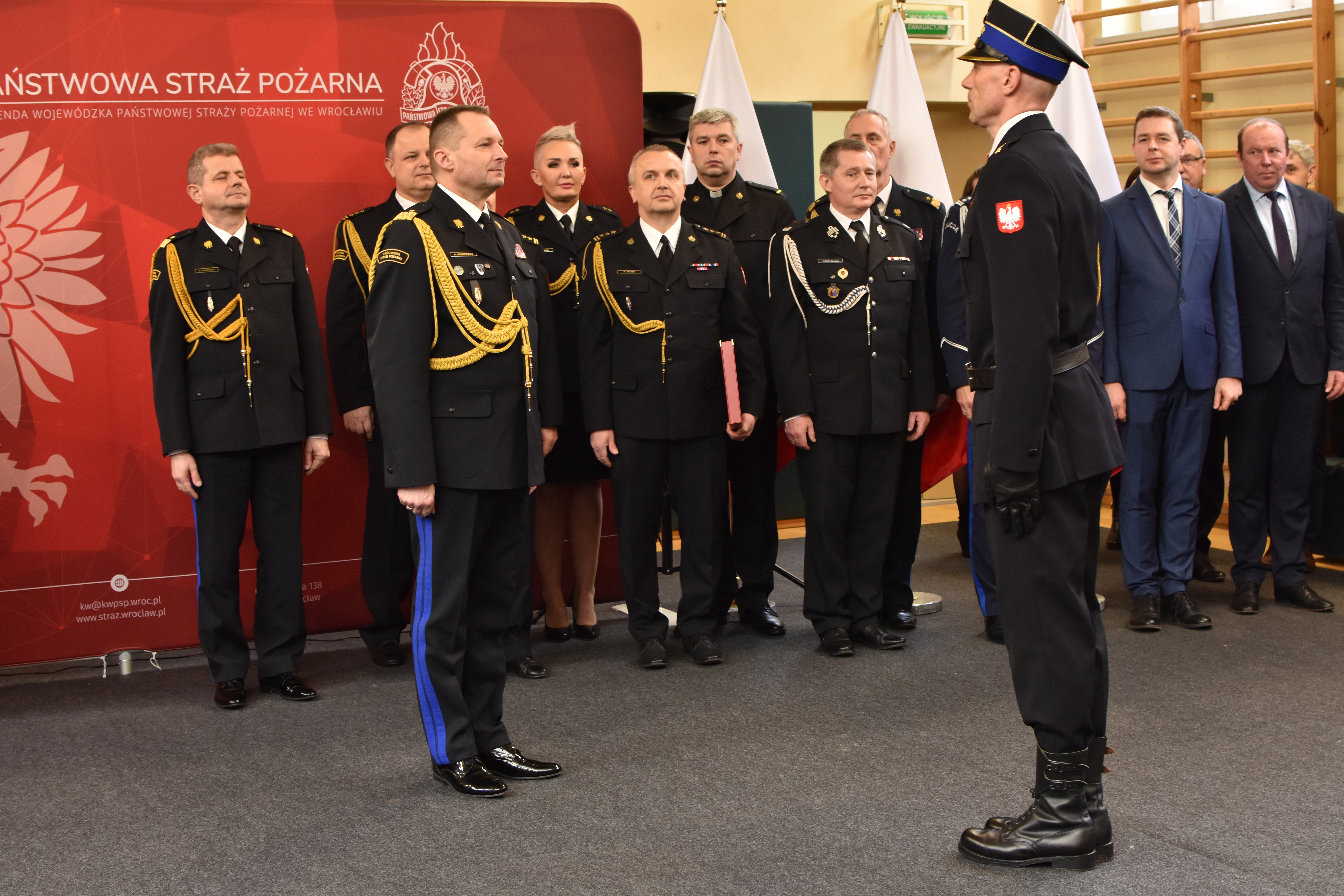 Po zdaniu obowiązków st. kpt. Przemysław Wróbel naczelnik Wydziału Kadr odczytał Decyzje komendanta głównego Państwowej Straży Pożarnej o zwolnieniu ze służby oficerów Komendy Wojewódzkiej Państwowej Straży Pożarnej we Wrocławiu w związku z przejściem na zaopatrzenie emerytalne.