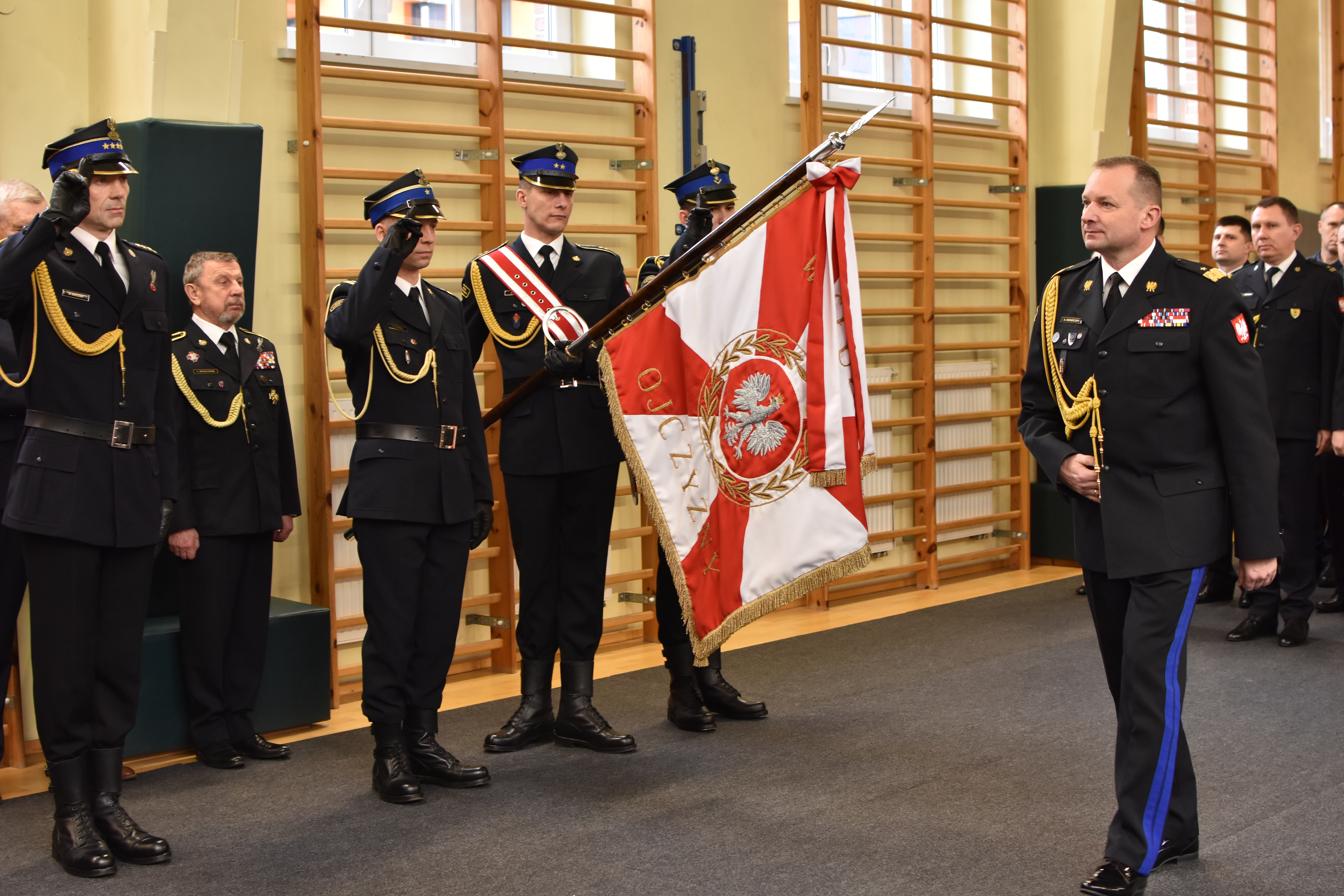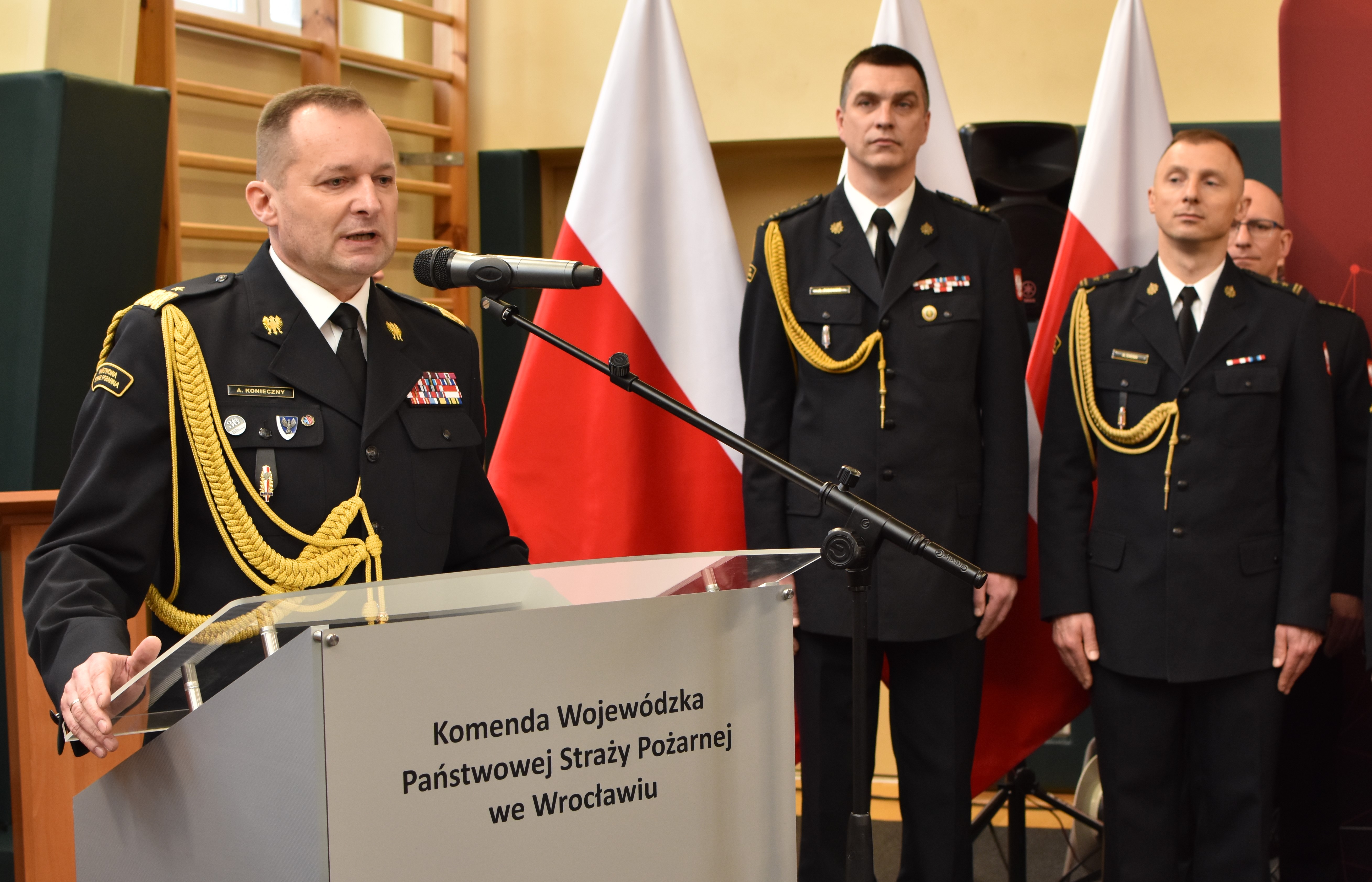 W dalszej części odegrany został hymn państwowy, a następnie głos zabrał gospodarz uroczystości nadbryg. Marek Kamiński dolnośląski komendant wojewódzki Państwowej Straży Pożarnej. Nadbrygadier Kamiński powitał wszystkich, którzy przybyli na dzisiejszą uroczystą zbiórkę, po czym skierował słowa w stronę oficerów odchodzących na zaopatrzenie emerytalne: