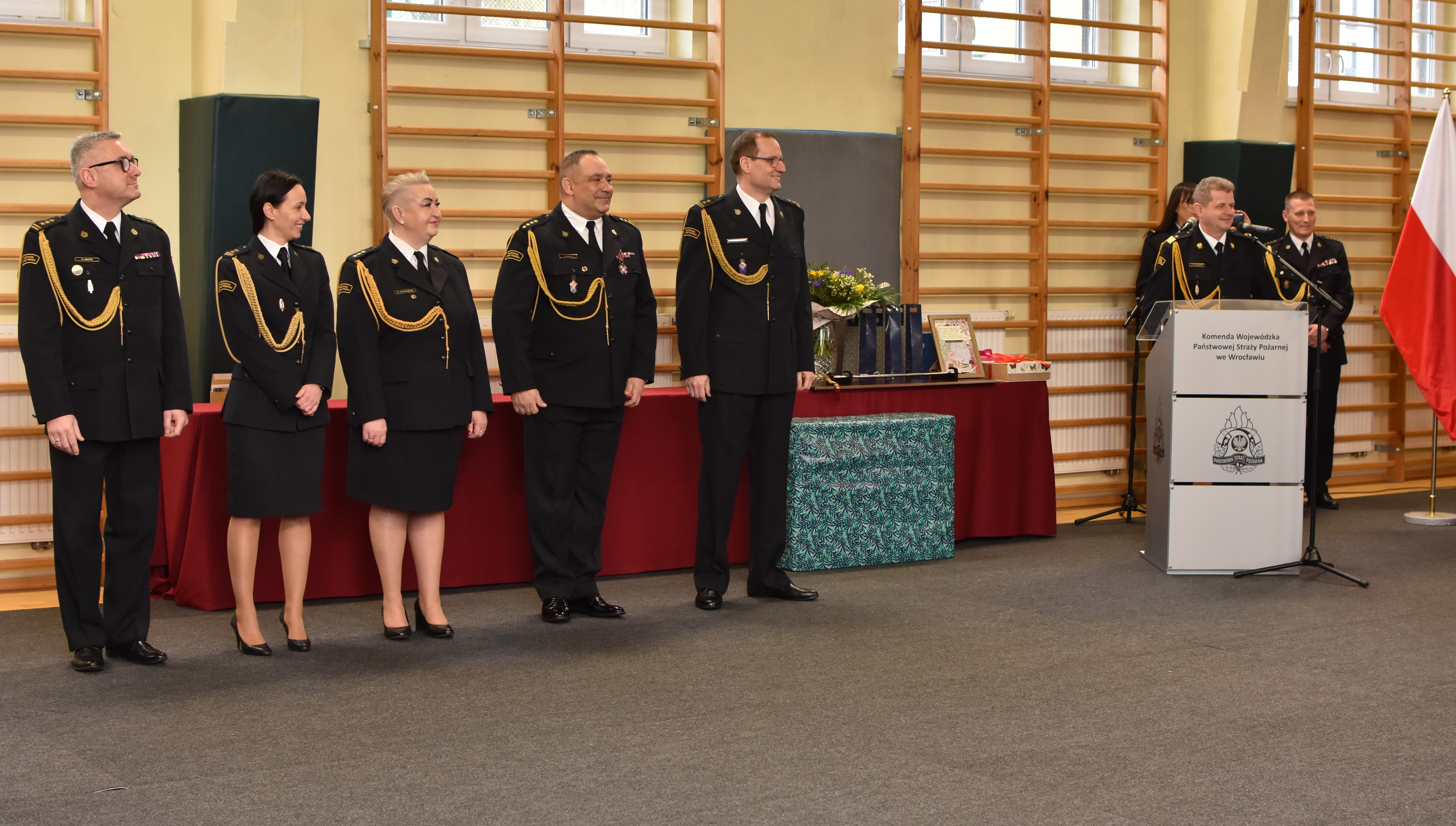 Uroczysta zbiórka z okazji przejścia na zaopatrzenie emerytalne pięciu oficerów Komendy Wojewódzkiej Państwowej Straży Pożarnej we Wrocławiu