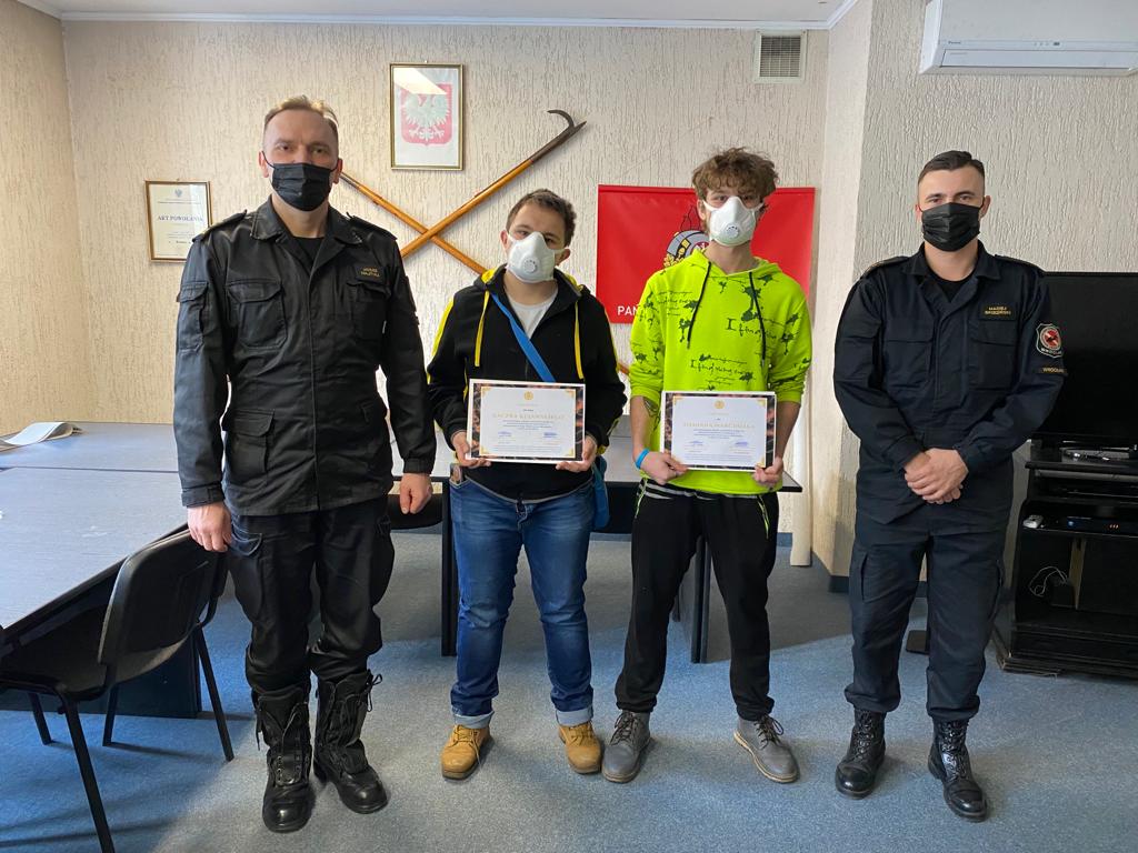 Kacper Kujawski oraz Damian Marciniak, mieli okazję poznać szczegóły strażackiej służby, jej wymogi, a także strażacki sprzęt stosowany podczas akcji ratowniczo – gaśniczych. Na zakończenie pobytu w jednostce dowódca JRG 1 bryg. Janusz Majtyka oraz zastępca dowódcy JRG 1 kpt. Maciej Brzeziński, wręczyli naszym nietypowym gościom pamiątkowy dyplom, będący dowodem tego szczególnego spotkania, a także dowodem zaangażowania uczniów w ratowanie zdrowia kolegi ze szkoły.