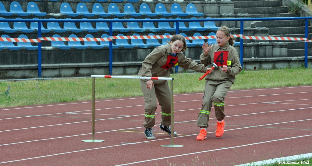 Konkurencja bieg sztafetowy 400 m z przeszkodami. Na sygnał sędziego startowego pierwszy zawodnik, który rozpoczyna bieg na swoim odcinku toru pokonuje ścianę drabiniastą, po pokonaniu której chwyta prądownicę i przekazuje ją zawodnikowi na torze drugim. Ten zawodnik pokonuje dystans (bez przeszkód) i przekazuje prądownicę zawodnikowi na torze trzecim, który dobiega do stojącego węża W-52, chwyta go i po przeniesieniu go, kładzie na leżącej na torze płycie tak, aby żadna jego część nie wystawała poza krawędź tej płyty. Następnie przekazuje prądownicę zawodnikowi na torze czwartym. Ten zawodnik pokonuje dystans (bez przeszkód) i przekazuje prądownicę zawodnikowi na torze piątym, który przebiega pod ułożoną poprzeczką tak, aby jej nie strącić i przekazuje prądownicę zawodnikowi na torze szóstym. Ten zawodnik, przeskakując nad płotkiem, a następnie przekazuje prądownicę zawodnikowi na torze siódmym, który biegnie do ustawionej gaśnicy, którą przenosi i ustawia na leżącej na torze płycie. Następny zawodnik, na torze ósmym, pokonuje dystans (bez przeszkód) i przekazuje prądownicę zawodnikowi na torze dziewiątym. Ten zawodnik dobiega do rozdzielacza i węży, dokonuje w dowolny sposób połączenia węży, rozdzielacza oraz prądownicy i biegnie w kierunku linii mety.