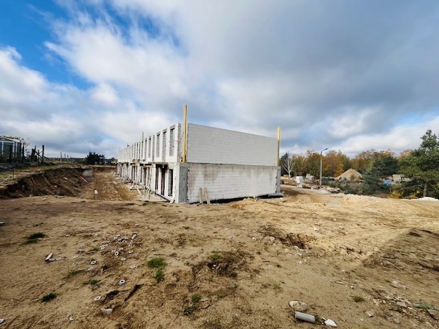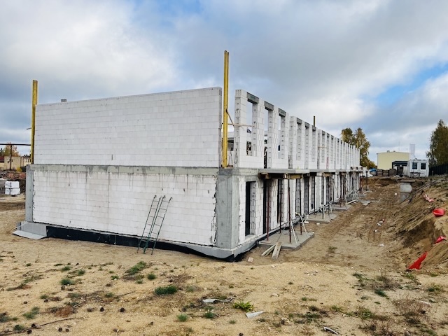 Obecnie wykonawca pracuje nad murowaniem ścian nośnych pierwszego piętra. W tym miesiącu planowany jest też montaż stropu typu filigran oraz dozbrojenie.