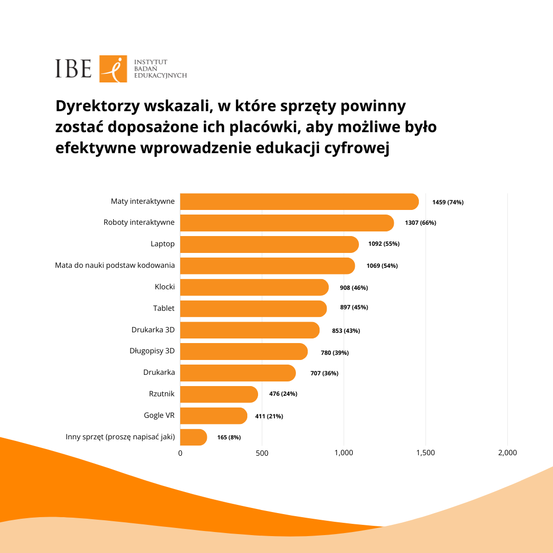 Dyrektorzy wskazali także sprzęt elektroniczny, w który powinna zostać doposażona placówka, aby efektywnie wprowadzić edukację cyfrową na etapie przedszkolnym. Respondenci wskazywali m.in.: