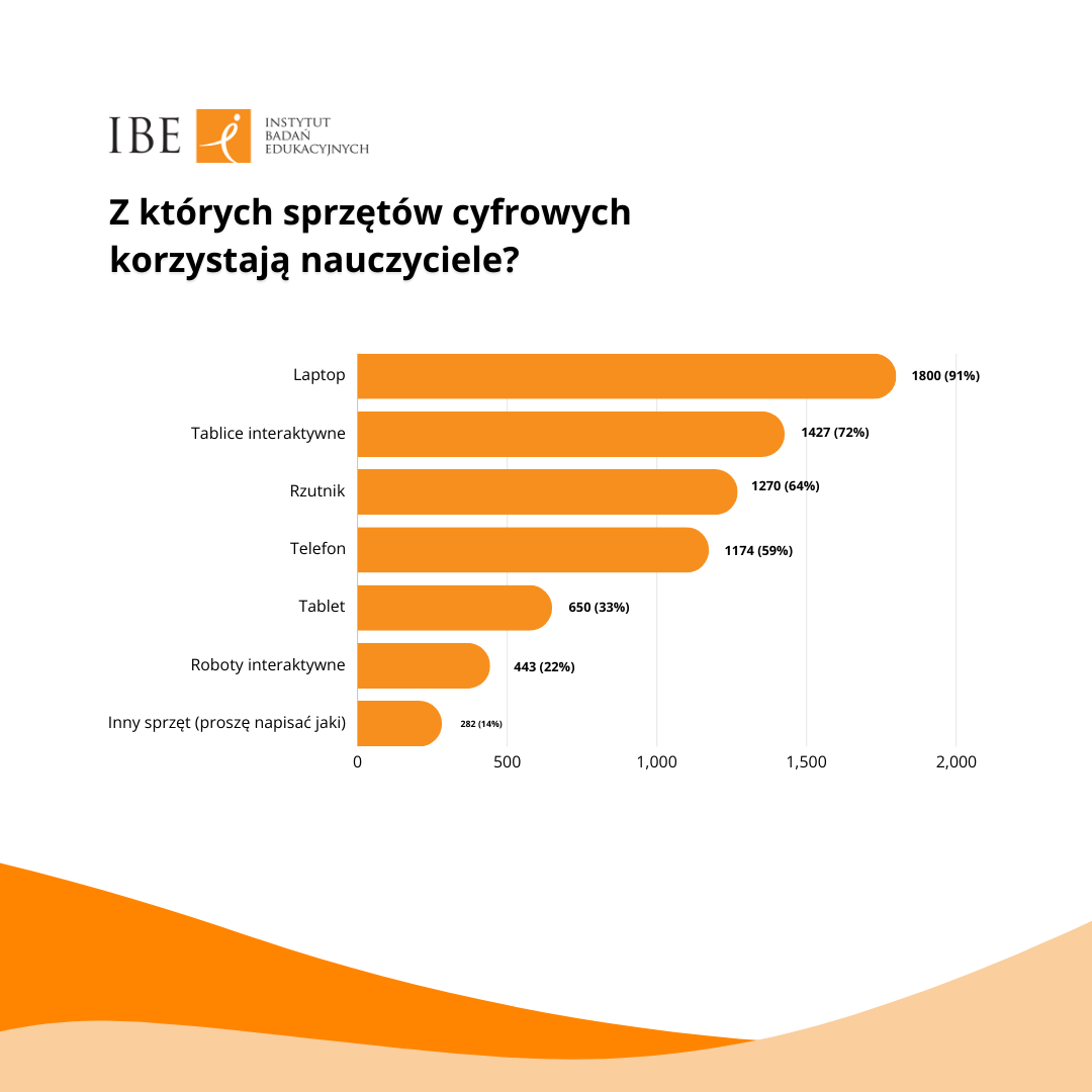 Dyrektorzy placówek z kolei podkreślali istotę wykorzystania sprzętów cyfrowych w pracy dydaktycznej. Opowiadając na pytanie, z jakiego sprzętu regularnie korzystają nauczyciele, wskazywali m.in.: