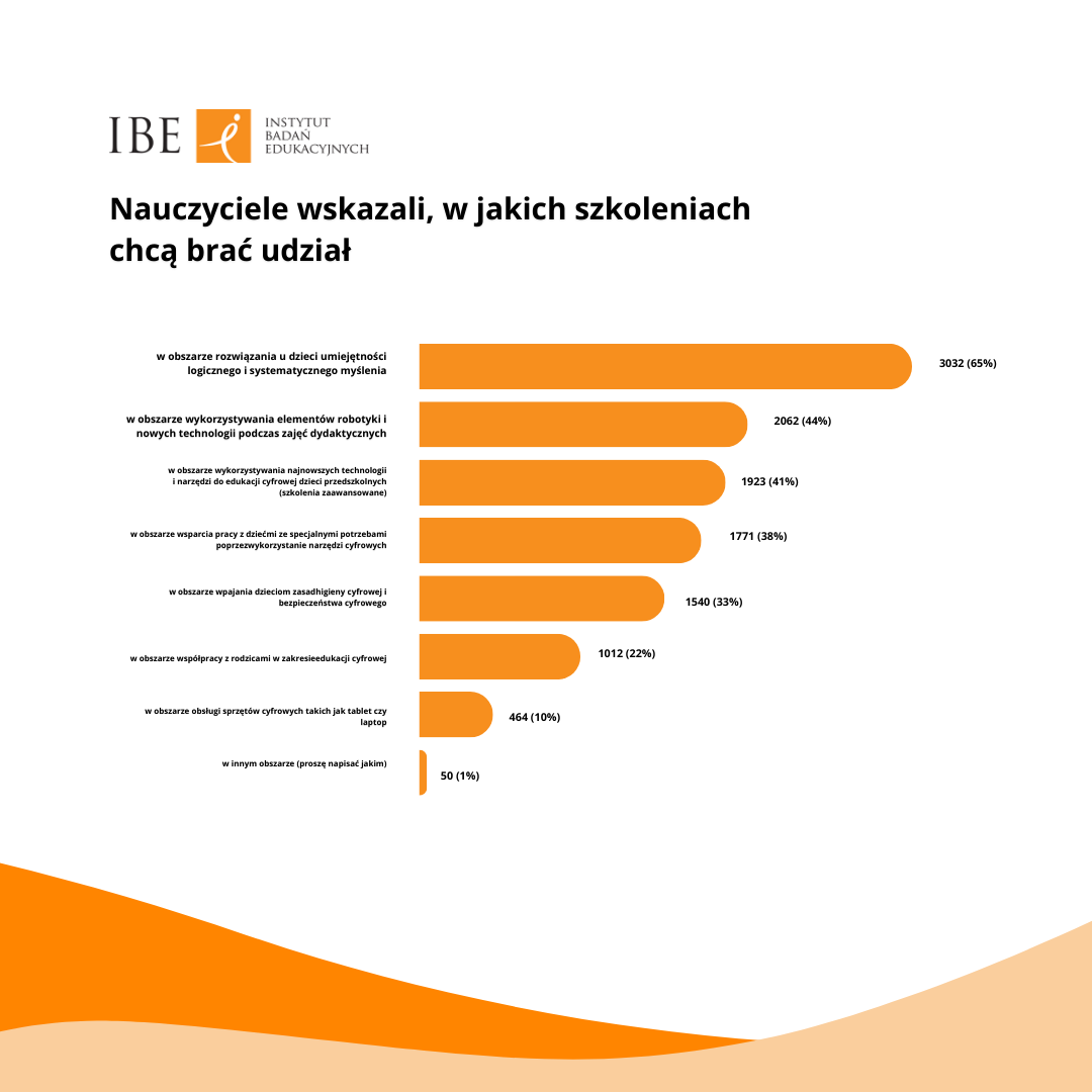 Wskazane przez nauczycieli obszary tematyczne, w zakresie których chcieliby rozwijać swoje kompetencje, ukierunkowane są na kształtowanie umiejętności logicznego i systematycznego myślenia (65%), wykorzystanie robotyki i nowych technologii podczas zajęć (44%), wykorzystania najnowszych technologii i narzędzi do edukacji cyfrowej (41%) oraz wspierania dzieci ze specjalnymi potrzebami (38%).