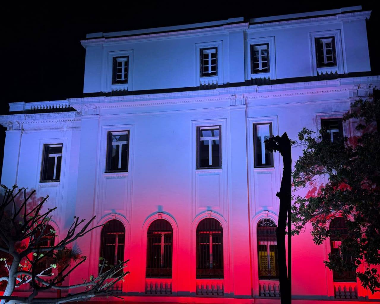 Obiekt muzeum, na terenie którego odbywało się przyjęcie został podświetlony biało-czerwonymi barwami.