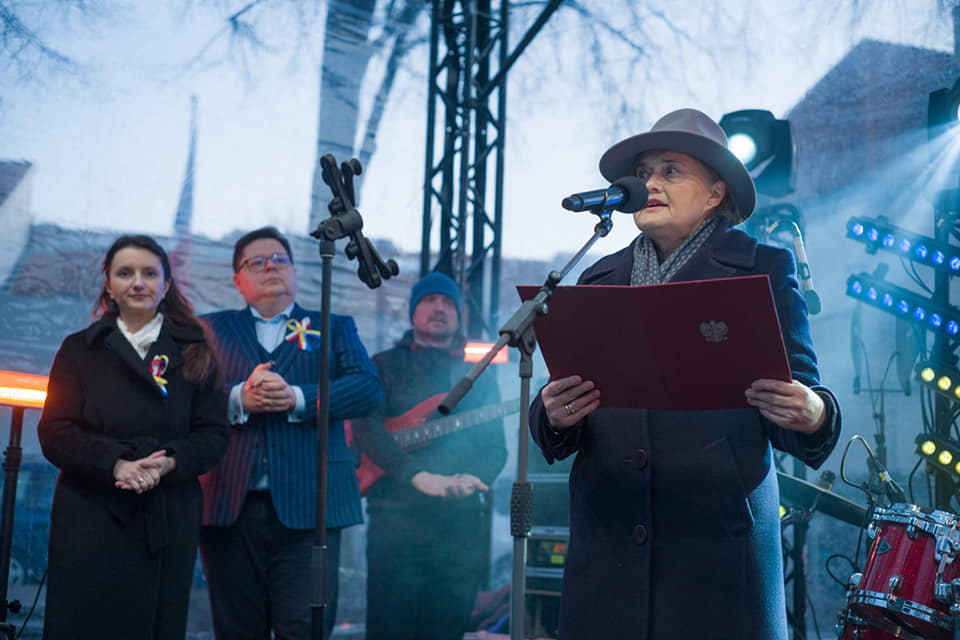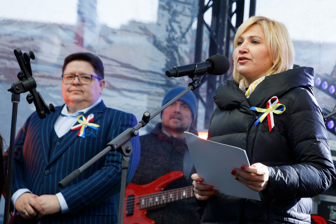 "Šiomis siaubingomis akimirkomis mūsų širdys ir mintys yra su Ukraina. Susirinkome čia, norėdami pareikšti solidarumą su didvyriška Ukrainos tauta. (...) Tegul Vilnius klausosi ukrainietiškos muzikos, tegul skamba ukrainietiška daina!", – pasakė Lenkijos ambasadorė Lietuvoje Urszula Doroszewska.