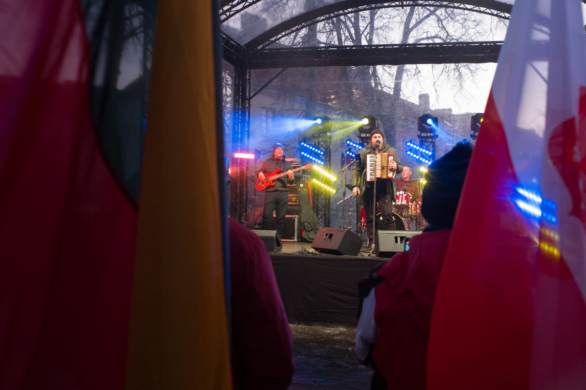 K. Sirvydo skvere prie Lenkijos ambasados Vilniuje į Ukrainos palaikymo akciją susirinkę žmonės išklausė tradicinių ir šiuolaikinių ukrainiečių dainų, aranžuotų ir atliekamų grupės „Horpyna“ iš Olštyno.