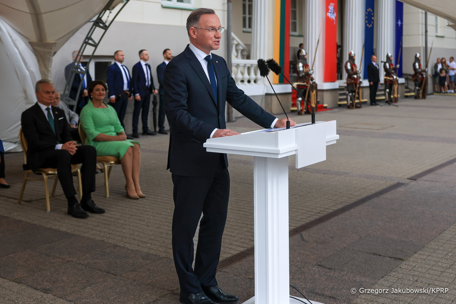 Suprantame, kad demokratinių Vidurio ir Rytų Europos šalių, ypač Lenkijos ir Lietuvos, bendradarbiavimas ir solidarumas yra mūsų bendro saugumo, nepriklausomybės ir laisvės garantas“, – pažymėjo Prezidentas Andrzej Duda savo kalboje Vilniuje Lietuvos nacionalinės šventės, skirtos Karaliaus Mindaugo karūnavimo 770-osioms metinėms, iškilmių metu.