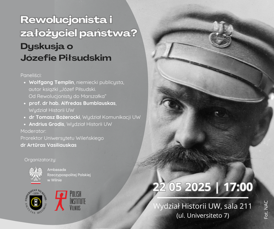 Wydział Historii Uniwersytetu Wileńskiego, Ambasada Rzeczypospolitej Polskiej w Wilnie i Instytut Polski w Wilnie zapraszają na dyskusję o Józefie Piłsudskim "Rewolucjonista i założyciel państwa?" z Wolfgangiem Templinem, niemieckim publicystą, autorem książki "Józef Piłsudski. Od Rewolucjonisty do Marszałka".