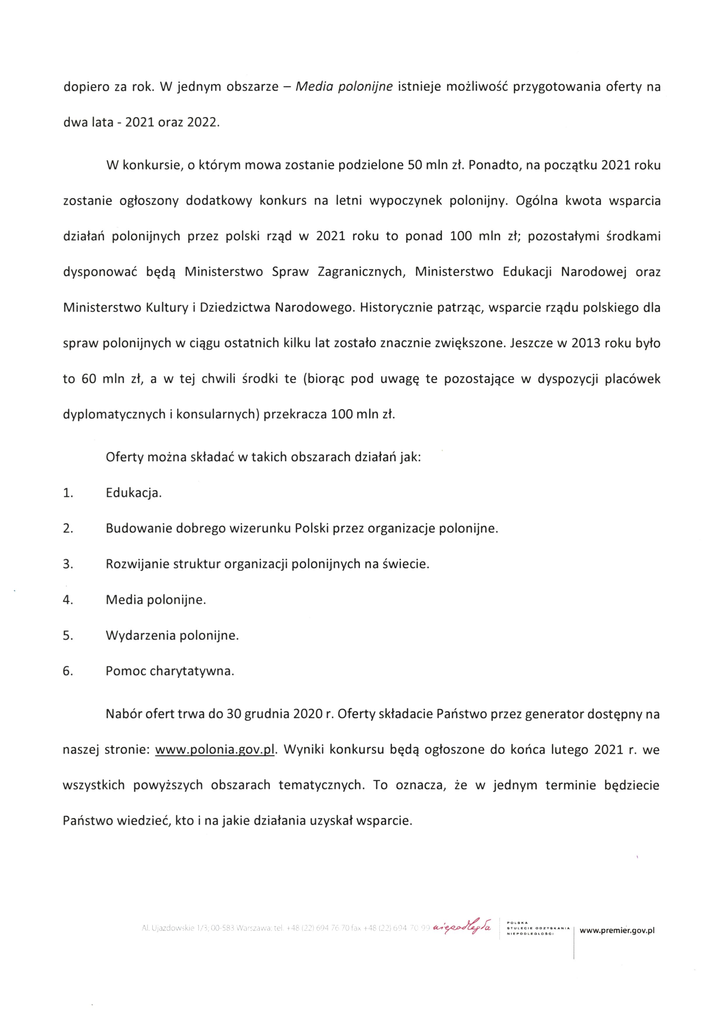 Dnia 30 listopada br. Pan Minister Jan Dziedziczak, Pełnomocnik Rządu ds. Polonii i Polaków za Granicą ogłosił konkurs ofert „Polonia i Polacy za Granicą 2021”. O dotacje mogą ubiegać się organizacje pozarządowe, w tym fundacje i stowarzyszenia, zarejestrowane w Polsce. To one pośredniczą we wsparciu, które najczęściej realizowane jest przez organizacje polonijne działające za granicą. Organizacje mogą ubiegać się o dofinansowanie projektów w sześciu obszarach takich jak: edukacja, rozwijanie struktur organizacji polonijnych na świecie, media polonijne, wydarzenia polonijne oraz nowy, utworzony w tym roku: budowanie dobrego wizerunku Polski przez organizacje polonijne. Łączna kwota wsparcia w konkursie w 2021 roku to 50 mln zł. Ponadto, na początku 2021 roku zostanie ogłoszony konkurs na letni wypoczynek polonijny.