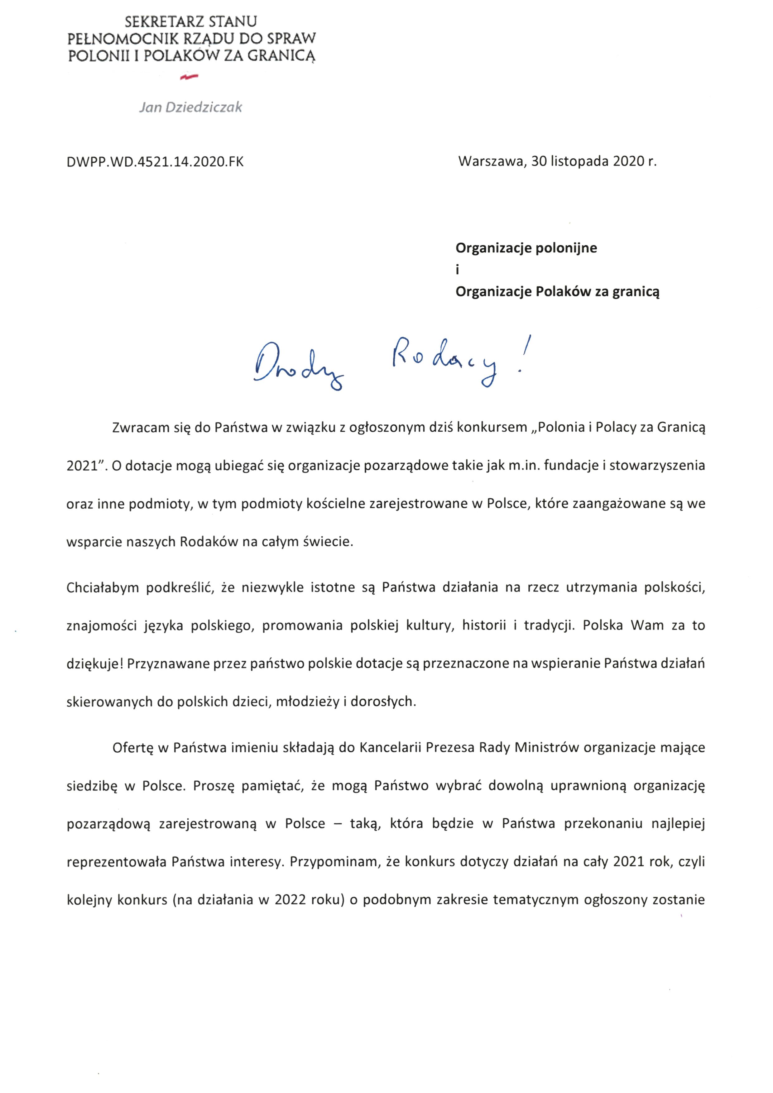 Zachęcamy do zapoznania się z poniższą informacją o obydwu konkursach, a także listem Pełnomocnika Rządu ds. Polonii i Polaków za Granicą Ministra Jana Dziedziczaka, poniżej.