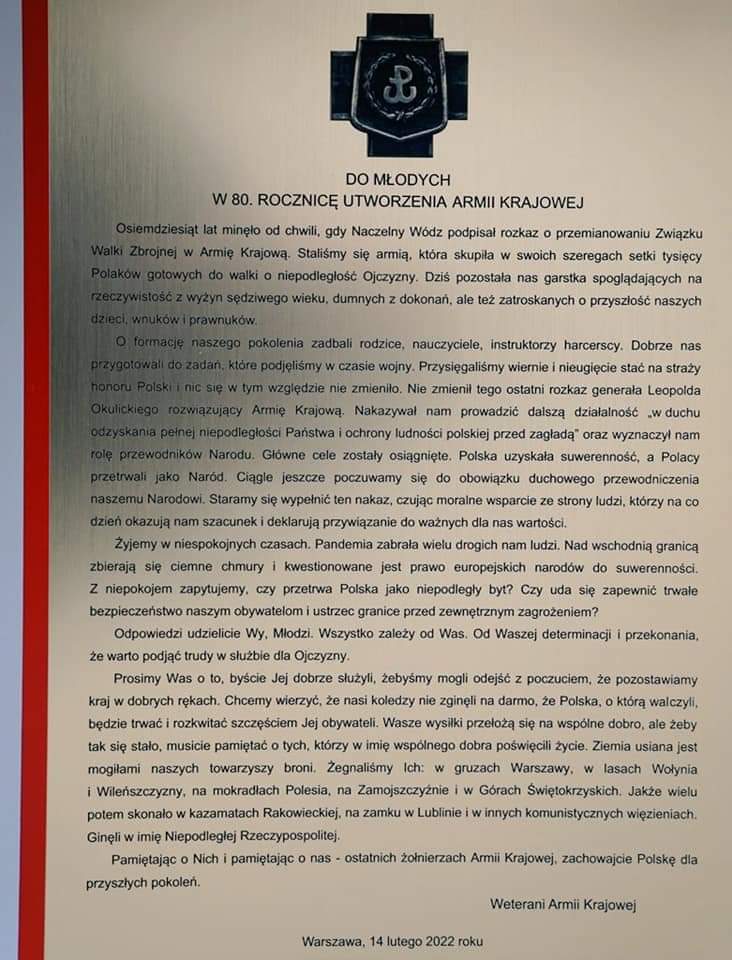 Uroczyście odczytany został Apel Weteranów Armii Krajowej do Młodych w 80. rocznicę utworzenia Armii Krajowej.