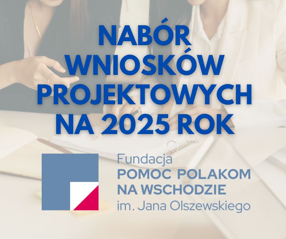 Fundacja „Pomoc Polakom na Wschodzie” im. Jana Olszewskiego informuje o rozpoczęciu naboru na wnioski o dofinansowanie projektów działań zaplanowanych na 2025 rok w obszarach: Edukacja, Kultura i promocja Polski na świecie, Publikacje, Dziedzictwo kulturowe i historyczne, Aktywizacja środowisk, Pomoc charytatywna i socjalna oraz wsparcie Mediów*.